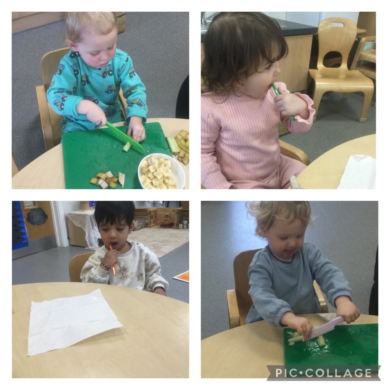 The children have been developing their independence with simple activities such as preparing healthy snacks and following the Child smile practice to brush our teeth, learning how to use the utensils in a safe way and the importance of choosing healthier options for our overall health.