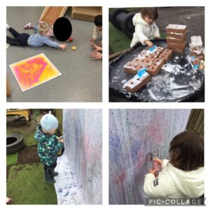 The children had fun lying on their tummies rolling the small ball along the floor to each other, they had fun while developing their core strength, hand eye coordination, arm and shoulder muscles which are all important for later skills such as balance, early writing skills and dressing independently. In the garden we used spray bottles with paint to create colourful patterns on the shower curtain and strengthen our hand muscles.