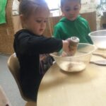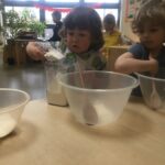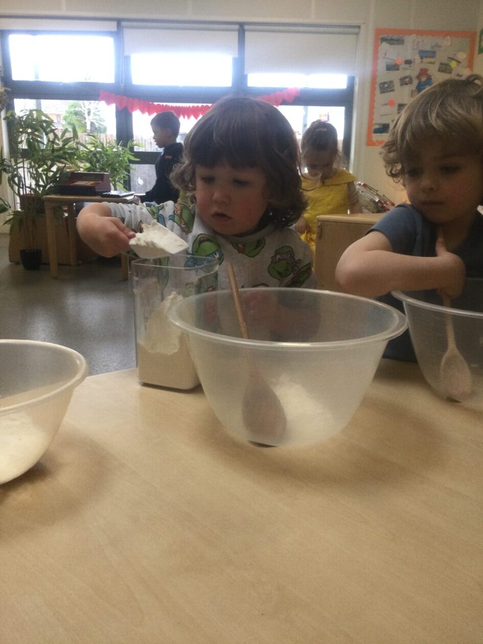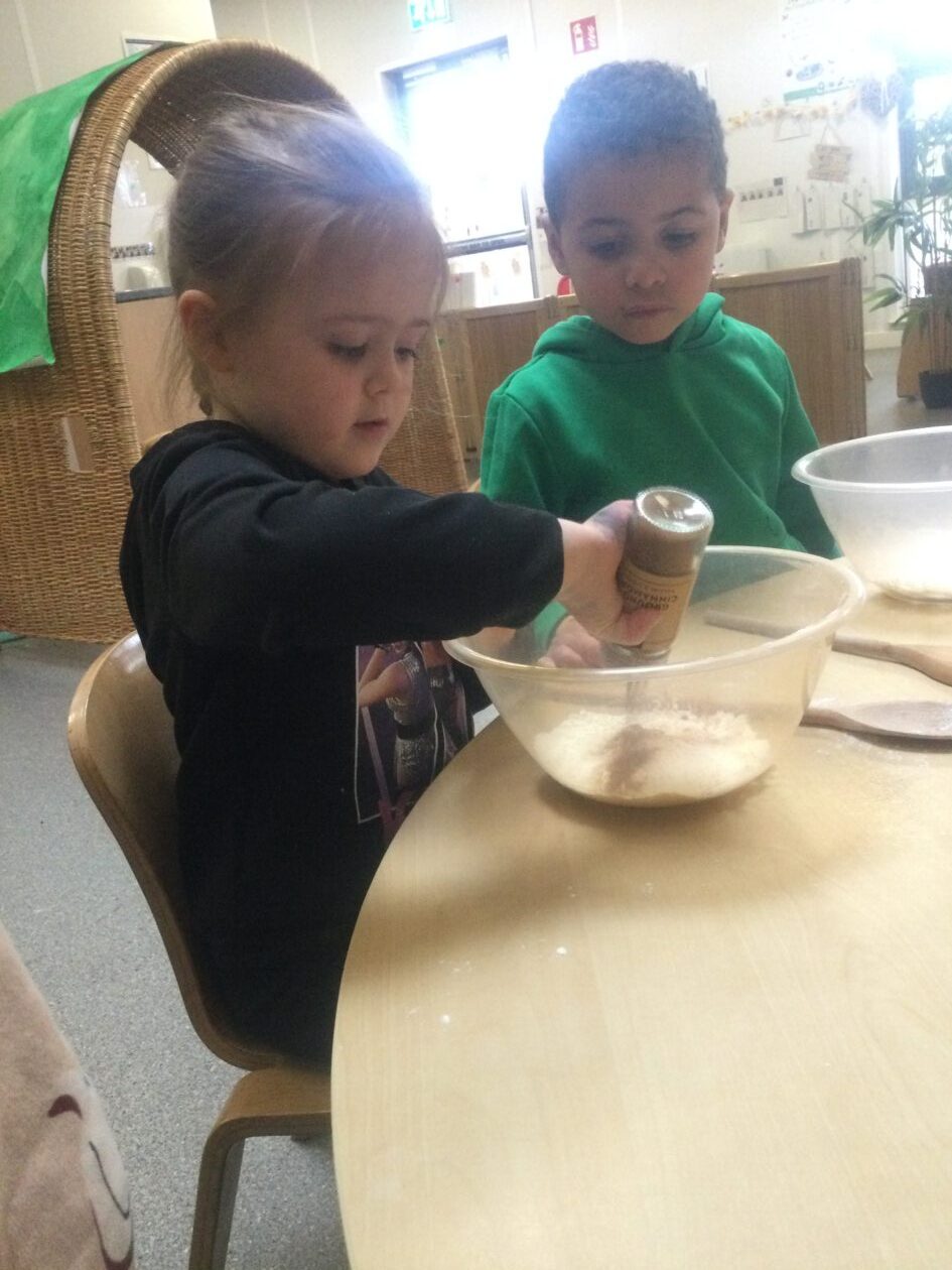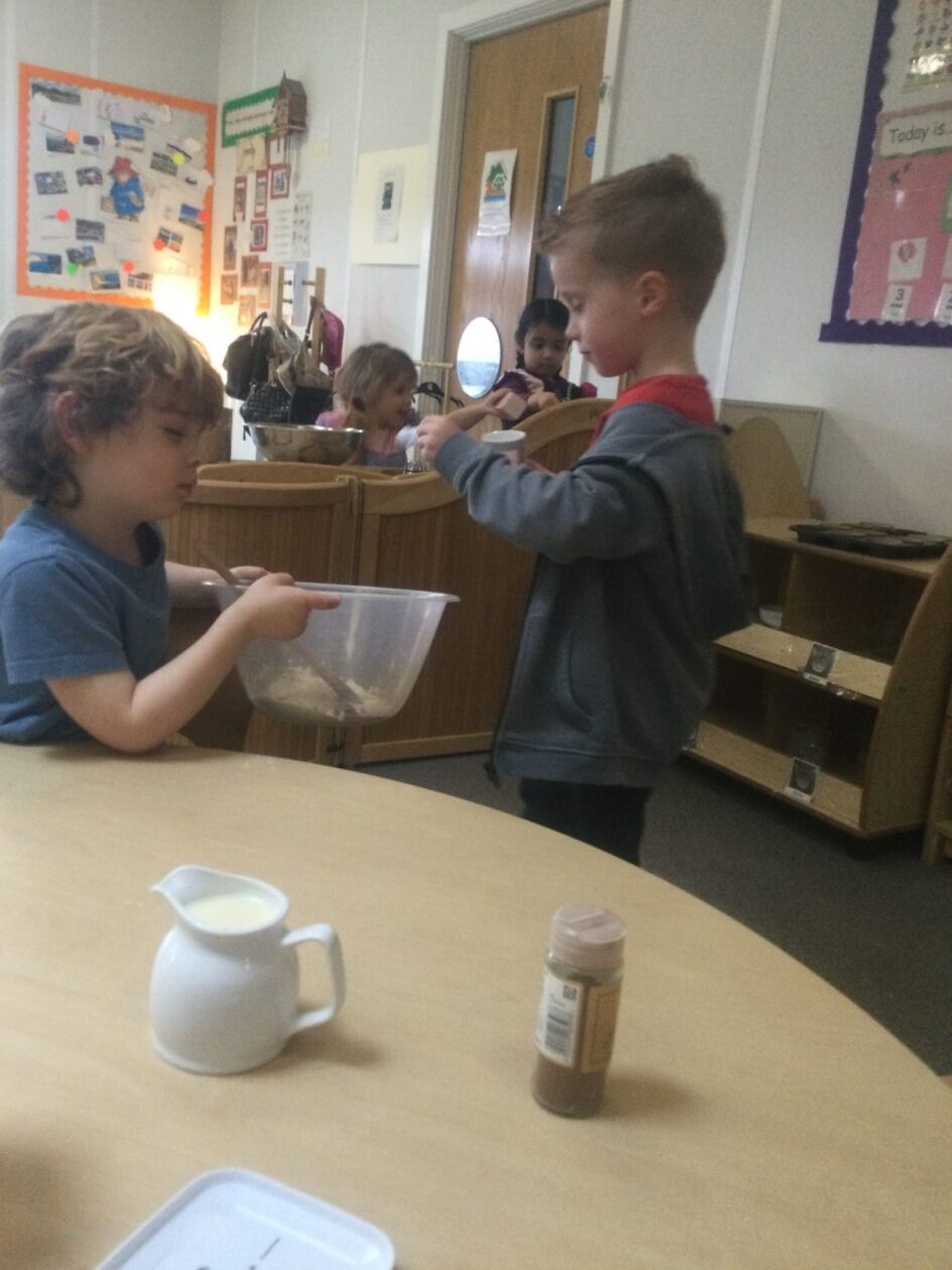 in our baking area, the children have been busy making muffins and developing lots of important skills along the way. They have been practising measuring, counting and carefully following a recipe. It has been lovely to see some of the children confidently taking on the role of the adult, helping to guide their friends and supporting them step by step as the work together to follow the recipe.