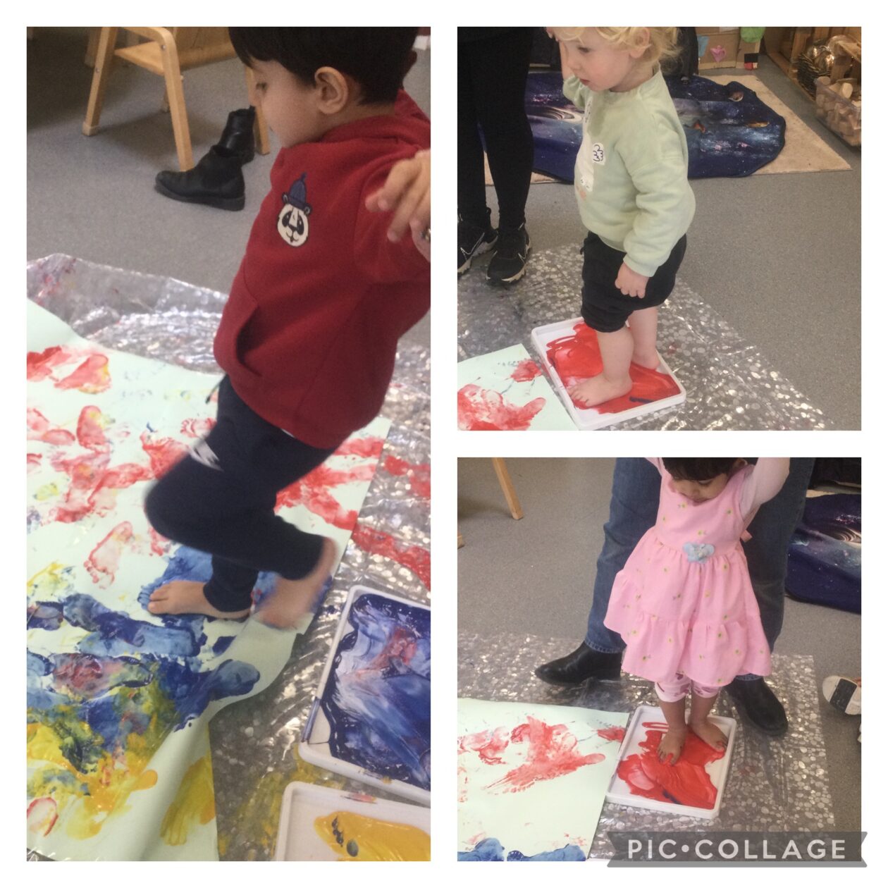 Watching the children step into bright colours and stamp their tiny footprints onto paper, and popping the bubbles in bubble wrap, is not only adorable- it’s also a wonderful way for them to explore art and sensory play.