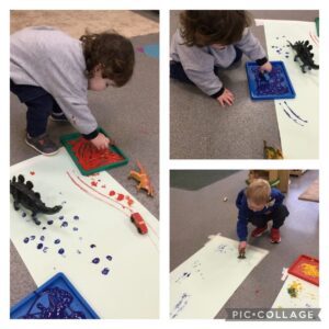 The children extended their interest in footprints by making pictures of dinosaur footprints comparing sizes.