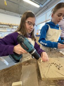 P7 are visiting the high school as part of our transition. Today is technology and we are drilling, hammering nails and using vices.
