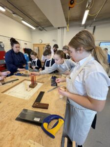 P7 are visiting the high school as part of our transition. Today is technology and we are drilling, hammering nails and using vices.