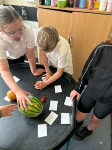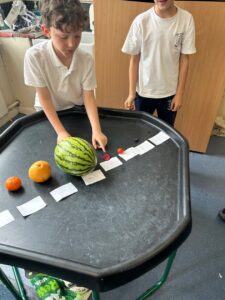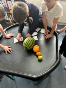 First we compared the sizes of the planets using fruits. Then we learned about the order the planets are away from the sun which affects the planets temperature and features.