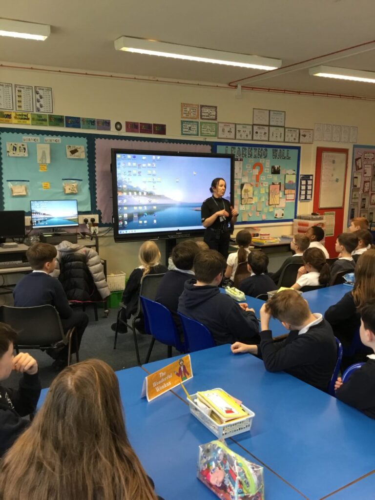Today we had a visit from our campus cop, P.C. Lorraine, as part of our learning about Crime and Punishment. P.C. Lorraine told us the duties of a police officer and the training involved in becoming a police officer. She also explained about all the specialisms there are in the police force e.g. detective work or working with police dogs. We had lots of questions for P.C. Lorraine which she kindly answered which helped us understand better the role of a police officer.