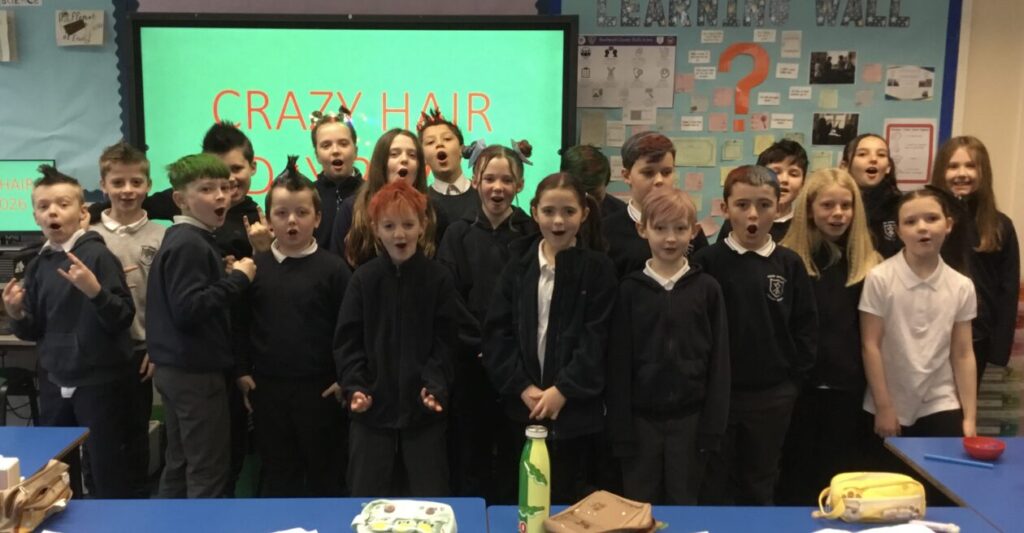 Well done Primary 5 for making such a great effort to take part in Crazy Hair Day! We had lots of people with a change of hair colour including red, green, purple and blue. We also had a few mohawk styles, crimped hair, glittery hair and even some Christmas lights! Well done to all who took part and thank you for the generous donations.