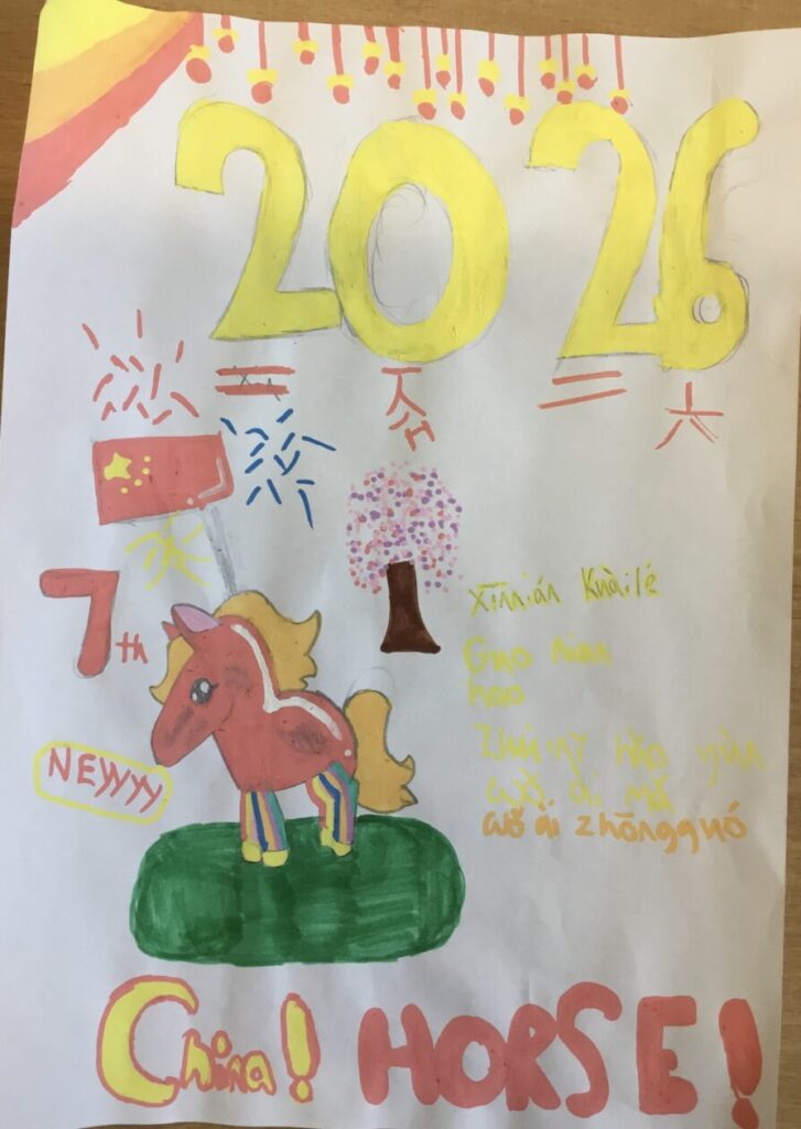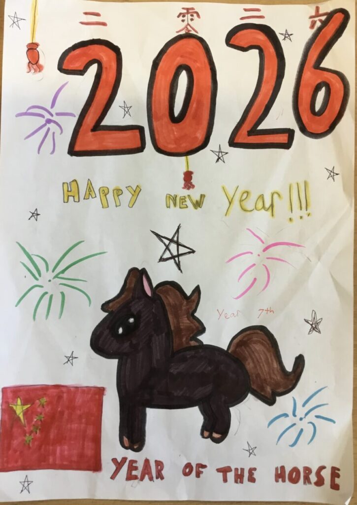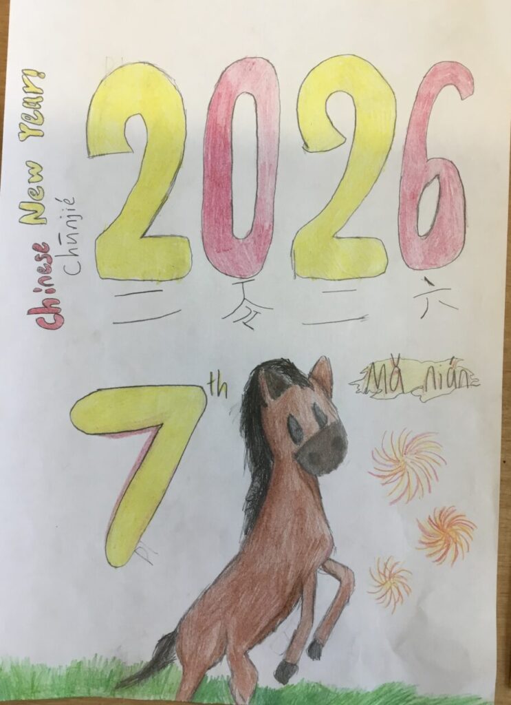 Today we had a lesson with our Mandarin teacher to teach us about the importance of Chinese New Year. It was interesting to learn about how the festival is celebrated. We have also entered a competition to design posters celebrating Chinese New Year. This year is the year of the horse. Those born in the year of the horse are believed to be energetic, independent and have an adventurous nature. Below you can see some of our competition entries.