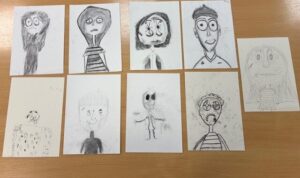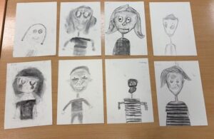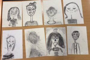 P4/1 have been learning to use different media with increasing control. For a few weeks, we have been drawing creatively and adding lots of detail to our pictures. We previously drew a beautiful Winter scene for our Christmas card and have taken inspiration from Tim Burtons illustrations to create spooky self-portraits! We used charcoal and have been practicing blending to create light and shade. We studied the characters from The Nightmare Before Christmas, Corpse Bride and Frankenweenie to notice the similarities in their features and used these to create these Tim Burton inspired self-portraits, mainly focusing on the visual elements of line and tone. This was the first time many of us had experienced using charcoal!