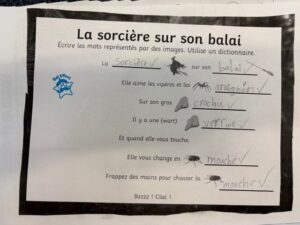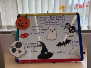 In French we have been using our dictionary skills and building on our previous knowledge to find the translation for some spooky words, using a bilingual dictionary to discover the words for each item. We used some of the vocabulary to read and understand a French poem. In lessons, we gave been learning about how French adjectives come after the noun. For example, un chat noir is a black cat. We then had to colour the Halloween pictures correctly, recognising if they were masculine or feminine words and noticing how this can change the spelling of the adjective.