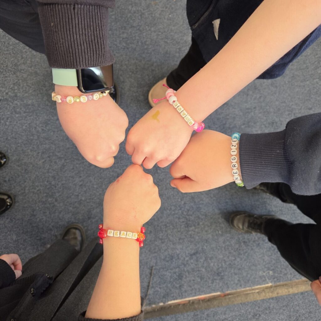 We read the book One Word for Kids to encourage us to think of a word that will motivate us towards a personal goal all year. Some of us chose to make our words into a bracelet at the tuff tray!