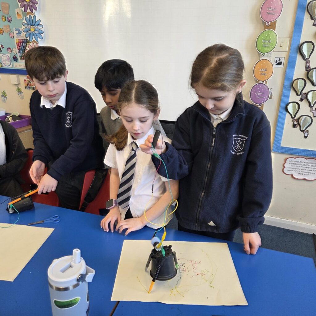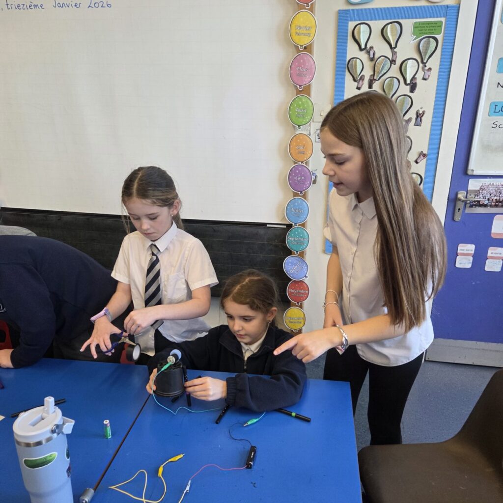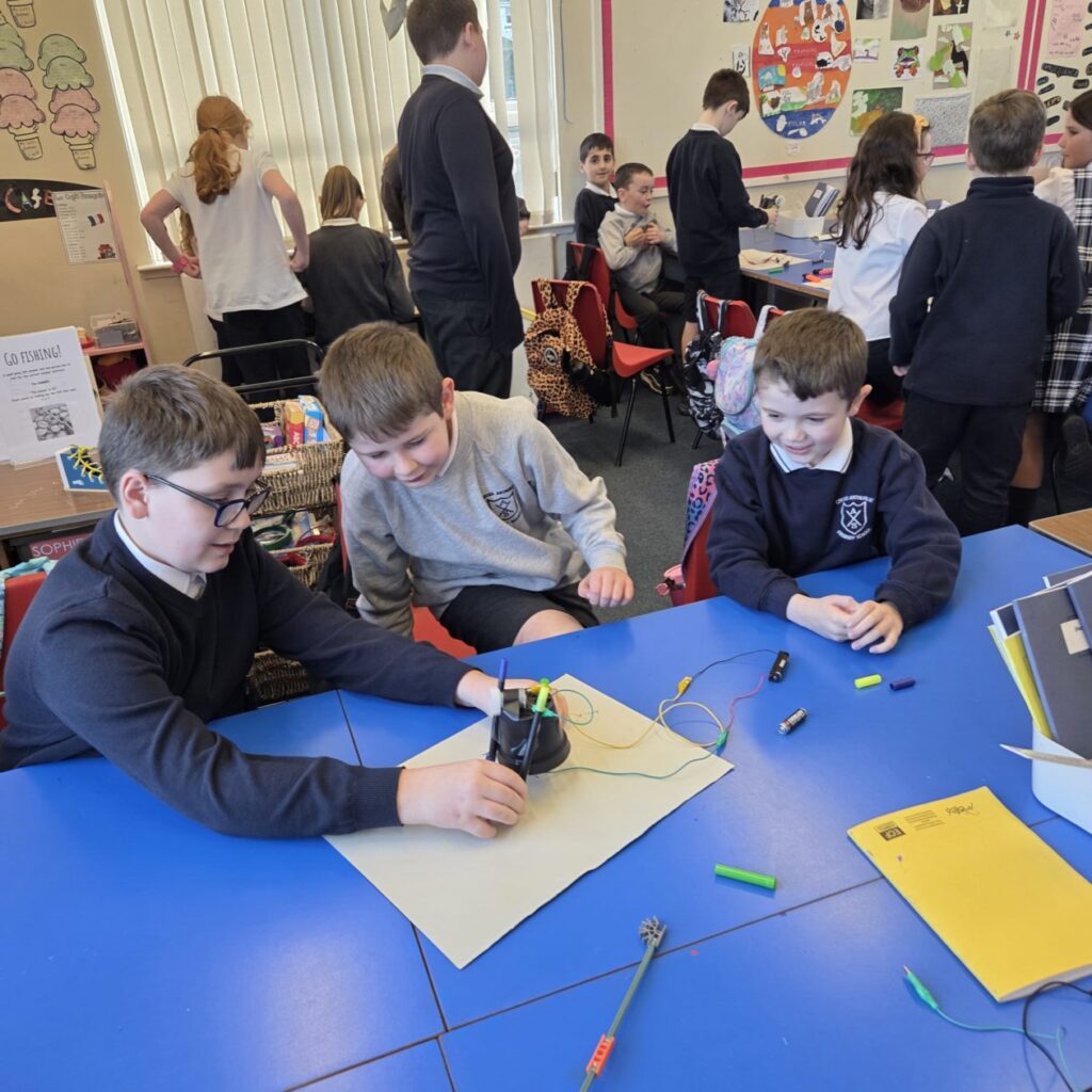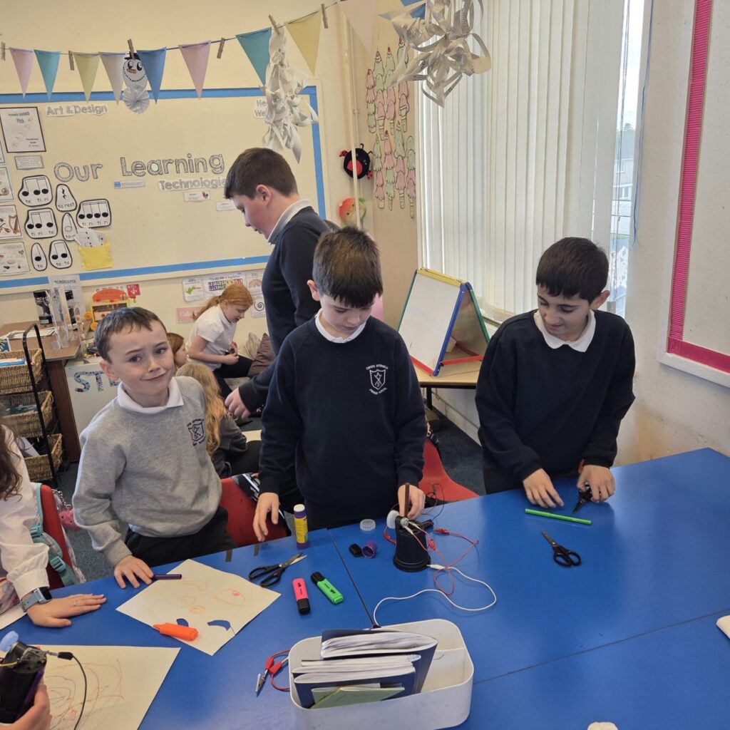 In Science, we worked together with P7 pupils to build Scribblebots. These simple robots would revise our learning from our electricity topic where we built circuits. We have been working on various talking and listening strategies. P4 listened well to P7s instructions and followed them confidently.
