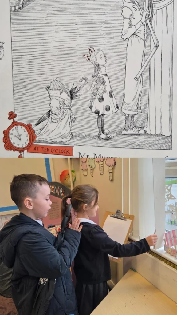Building on our Health and Wellbeing lessons, we tried to understand the thoughts and feelings of a strange little character called Mr Munroe who cannot speak. We had to look for clues about his body language and actions in the novel. Mr Munroe was wearing many crazy disguises in the story to get the attention of his friend, Ottoline. Can you spot the different item added to his disguise each time?