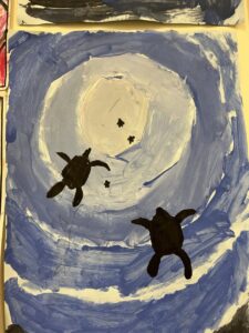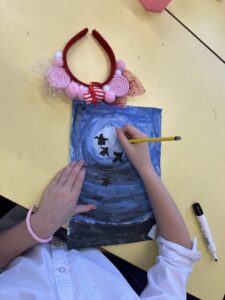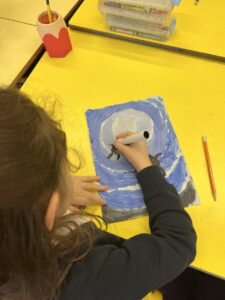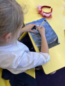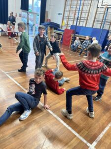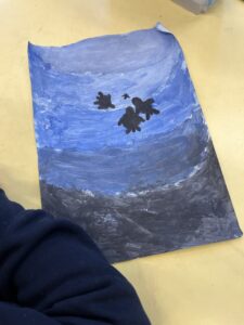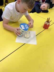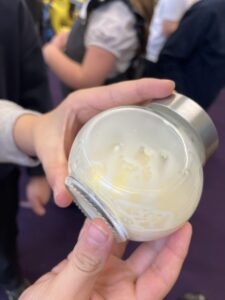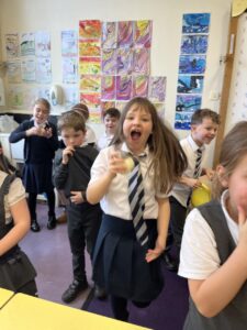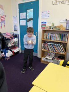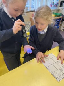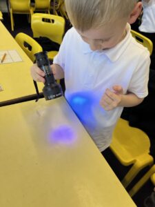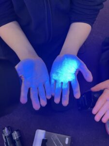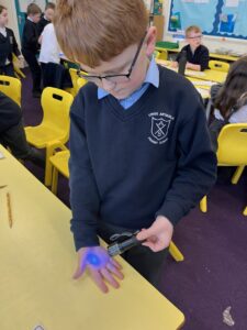 Then we used UV gel to explore how easily germs can spread. We put a small amount of gel on our hands and then touched some surfaces around the classroom. Using the UV light torches we could see the ‘germs’ from our hands had transferred to the tables we had touched. We were then challenged to wash our hands very well following all the steps to see who could wash all the ‘germs’ off their hands the best: