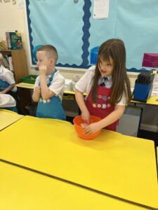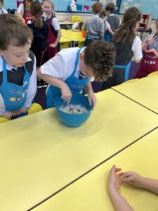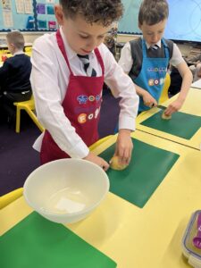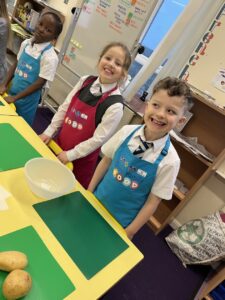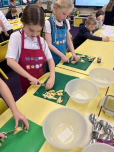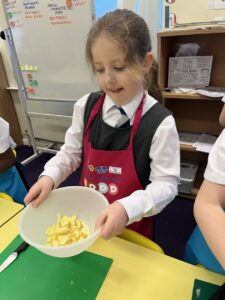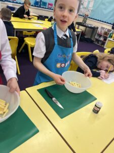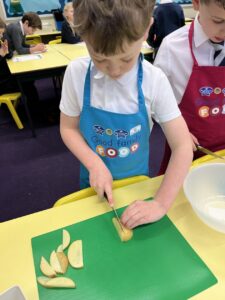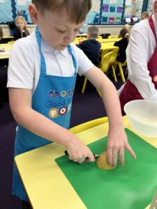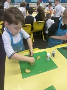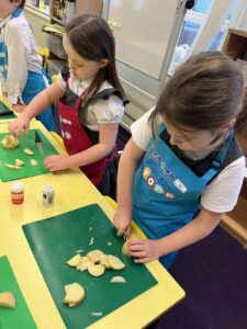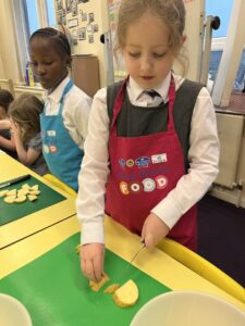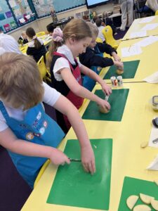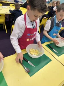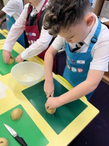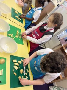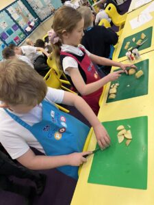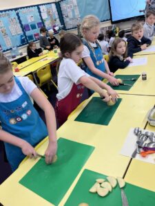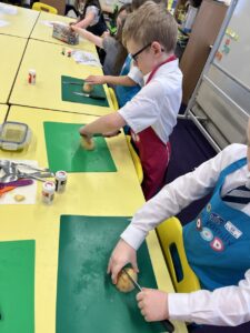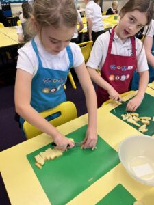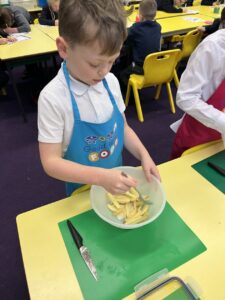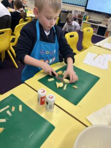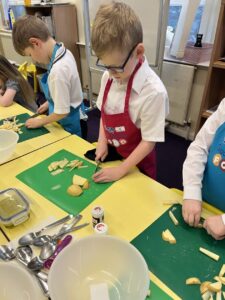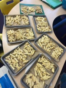 After all our hard work learning about germs and how they spread, we were keen to link this new knowledge to food preparation. We know it is very important to wash our hands and wipe down surfaces before and after cooking to prevent the spread of germs. To begin, we have been learning to demonstrate simple cutting and knife skills using the bridge hold and claw grip. What better way to show off our new skills than making chips!