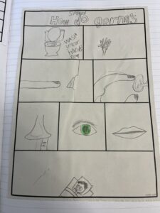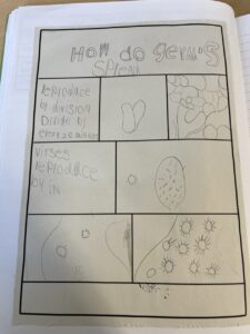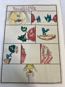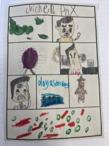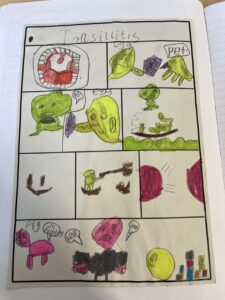 After that, we researched what common diseases you can get from bacteria and a virus. We made mini comic books to show our understanding of how you get tonsillitis and chicken pox: