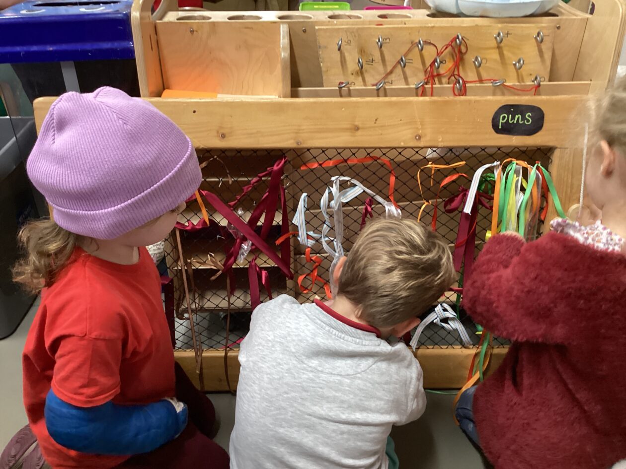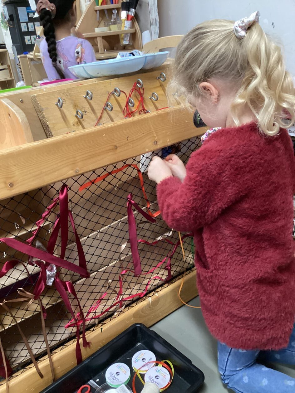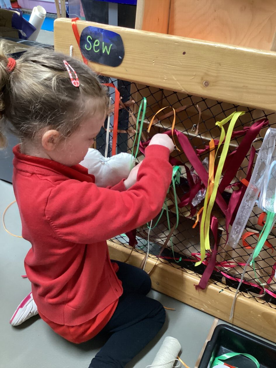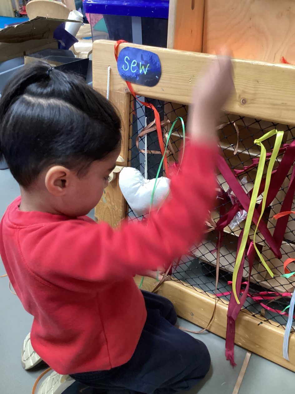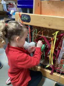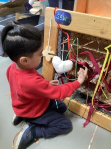 This week in the sewing area the children have been using loom bands on boards to create pictures and letters of their name, this helps to build on their hand and finger muscles and develop further their fine motor skills. The children have also been continuing from last week sewing buttons onto fabric and using different stitches. Another activity that children have been participating in is tying ribbons onto the board for an autumn colour display. These activities help to improve their fine motor skills and require focus, precision, hand-eye coordination and dexterity as they manipulate small objects.