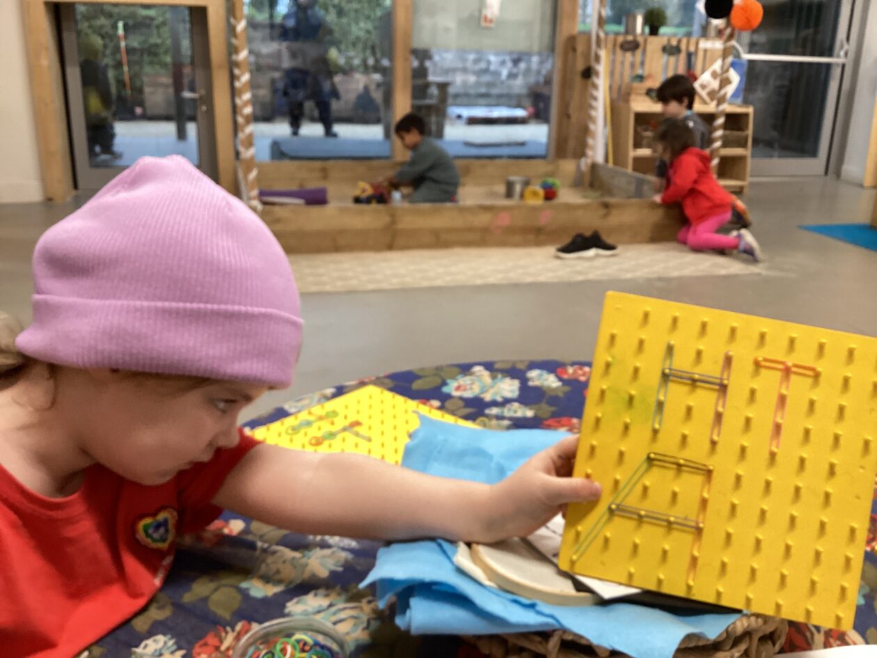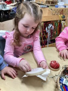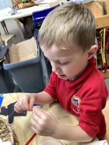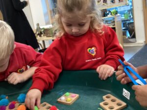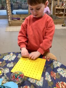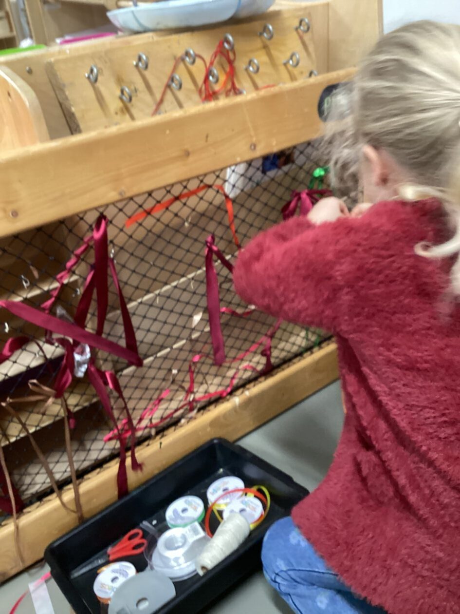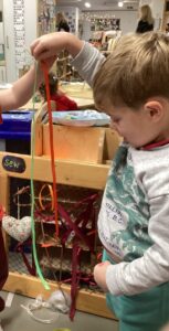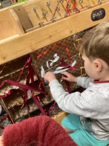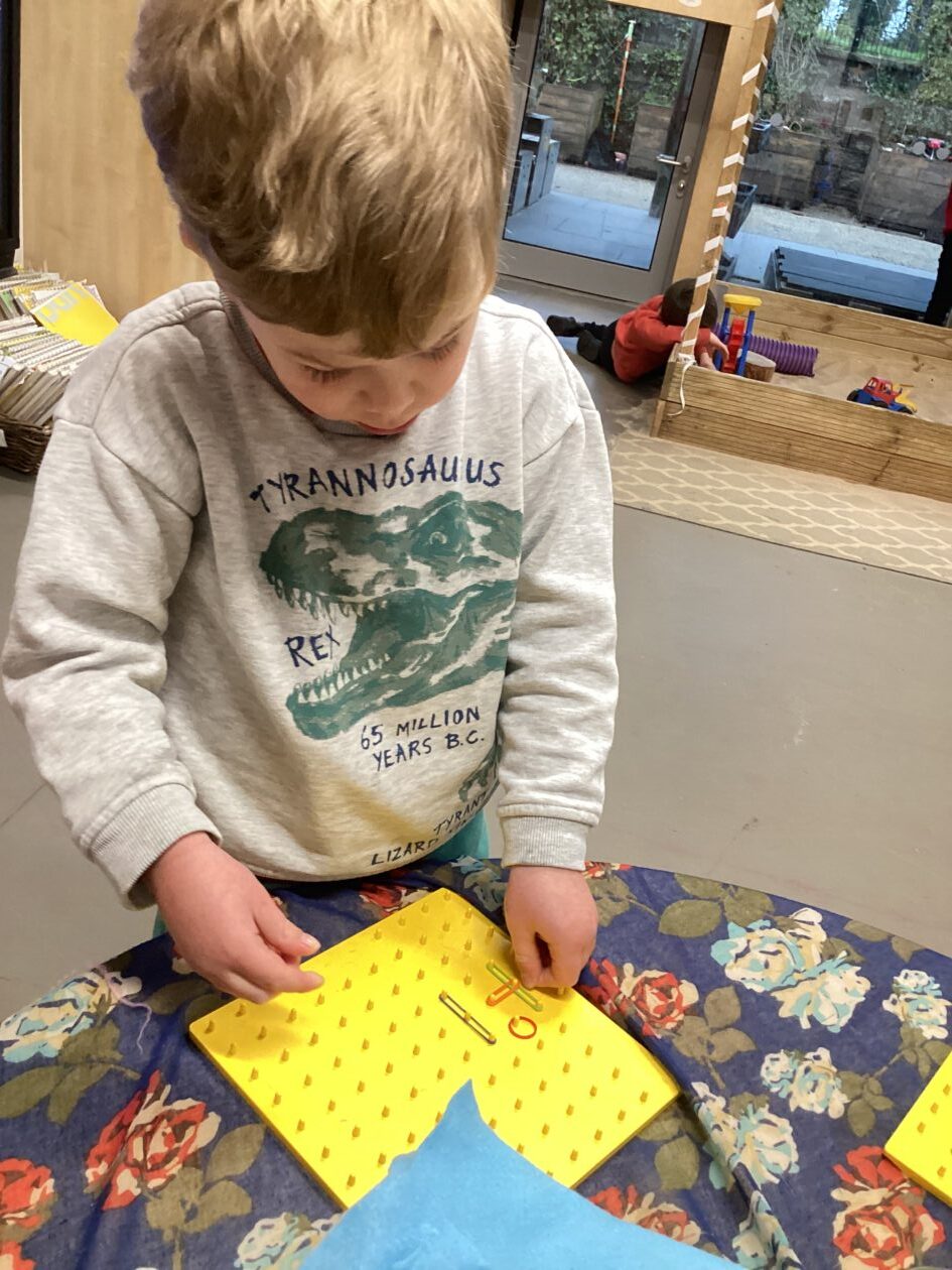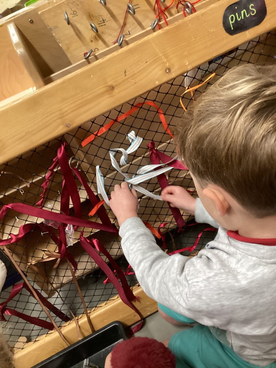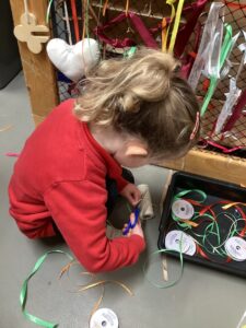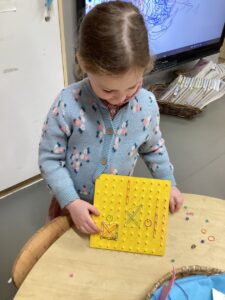 This week in the sewing area the children have been using loom bands on boards to create pictures and letters of their name, this helps to build on their hand and finger muscles and develop further their fine motor skills. The children have also been continuing from last week sewing buttons onto fabric and using different stitches. Another activity that children have been participating in is tying ribbons onto the board for an autumn colour display. These activities help to improve their fine motor skills and require focus, precision, hand-eye coordination and dexterity as they manipulate small objects.