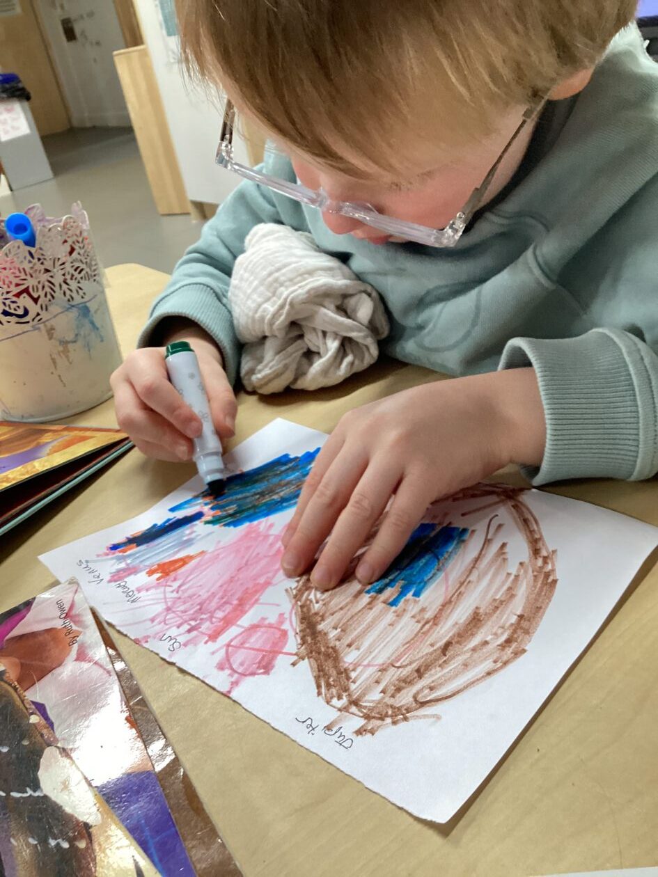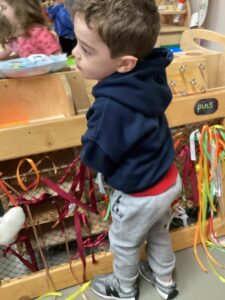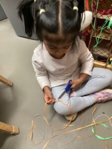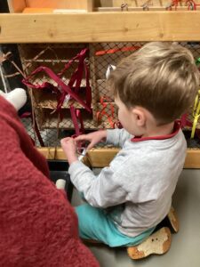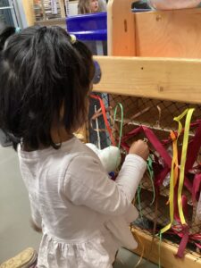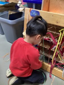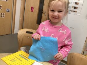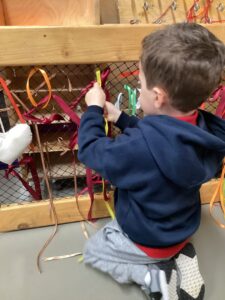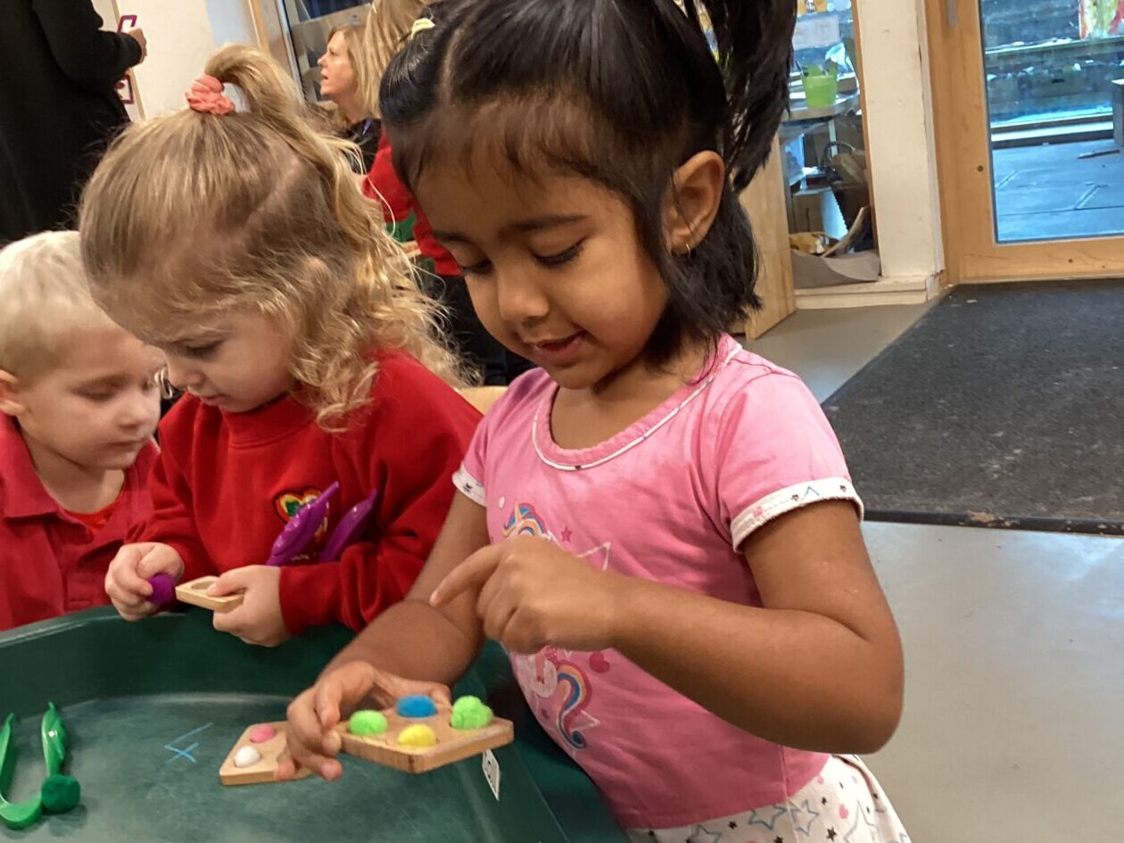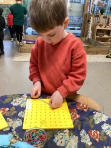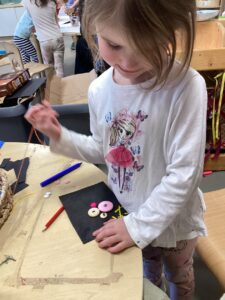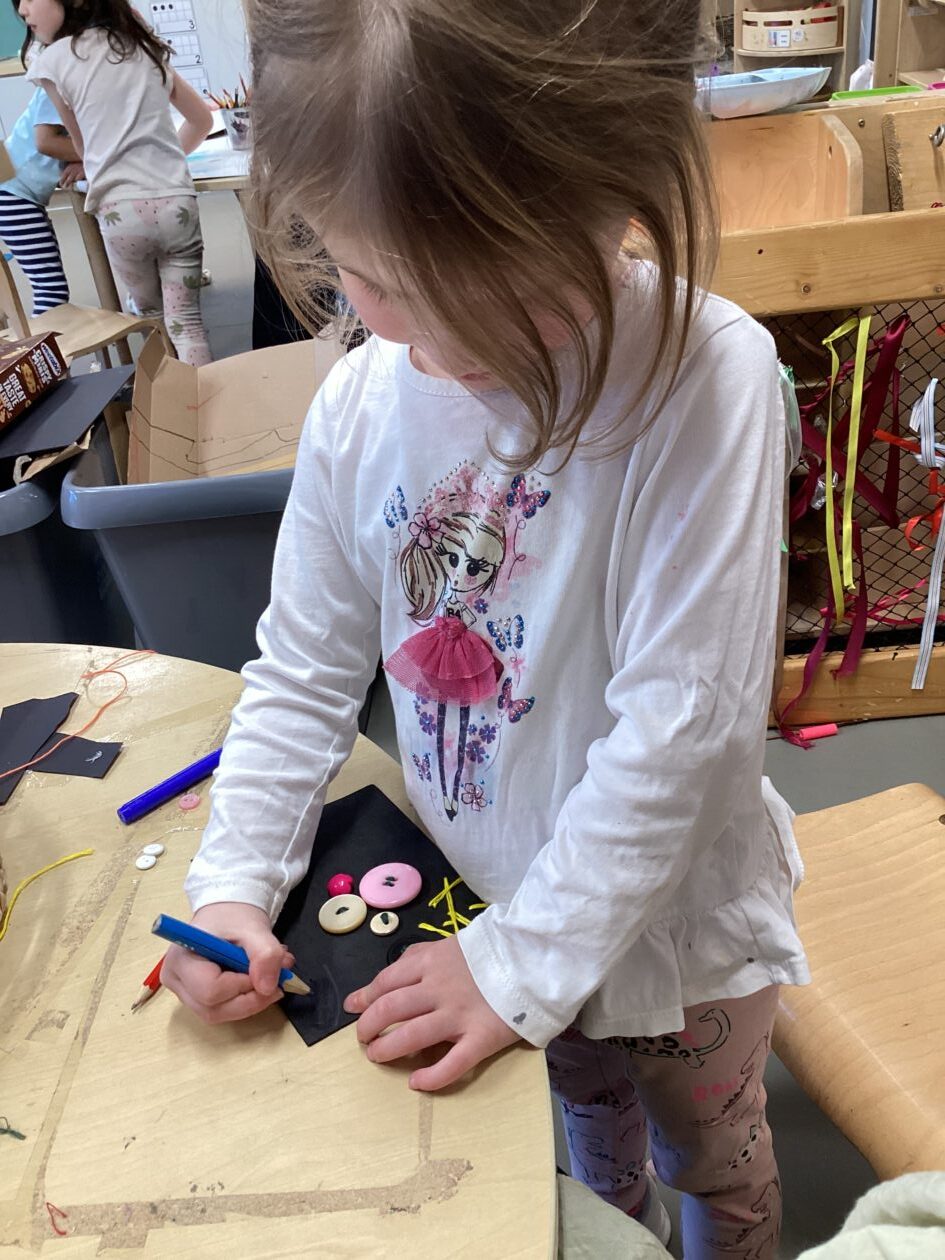 This week in the sewing area the children have been using loom bands on boards to create pictures and letters of their name, this helps to build on their hand and finger muscles and develop further their fine motor skills. The children have also been continuing from last week sewing buttons onto fabric and using different stitches. Another activity that children have been participating in is tying ribbons onto the board for an autumn colour display. These activities help to improve their fine motor skills and require focus, precision, hand-eye coordination and dexterity as they manipulate small objects.