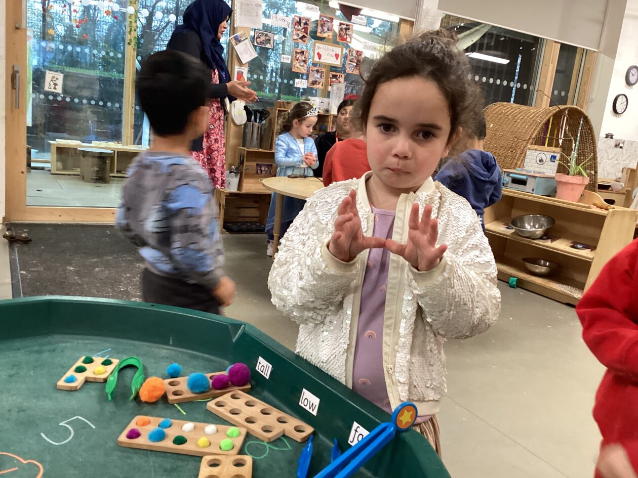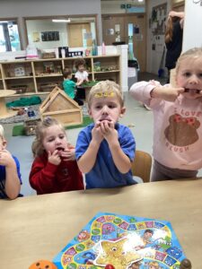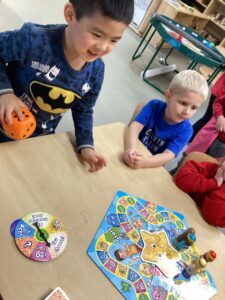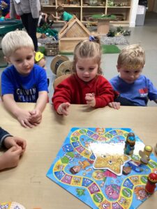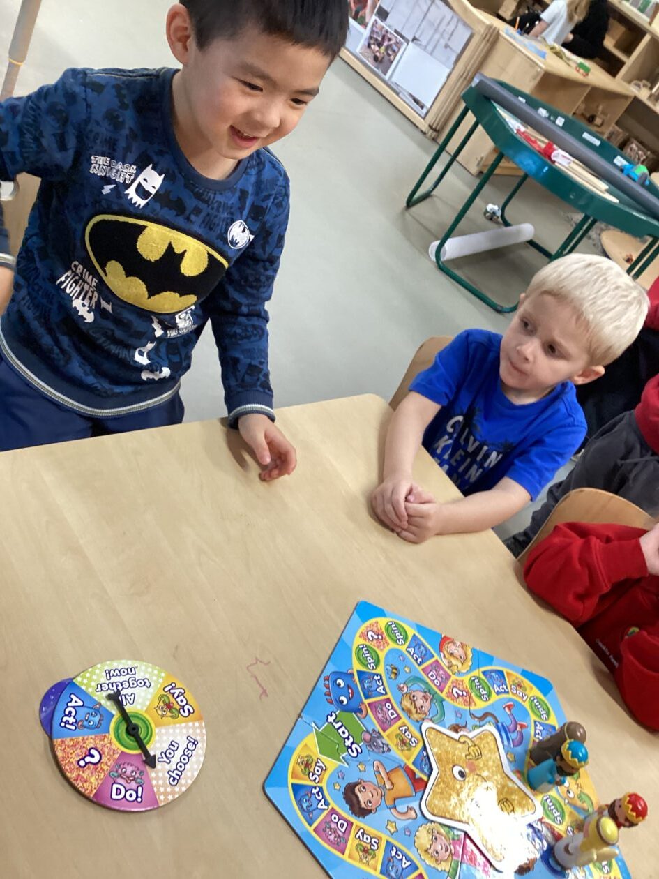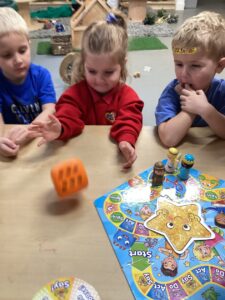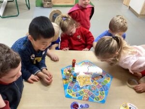 The children waited patiently for their turn, showing good listening, cooperation, and turn-taking skills. They demonstrated early numeracy as they counted the dots on the dice and the spaces on the board. The activities encouraged creativity, imagination, and confidence as the children acted out different ideas and expressed themselves through movement and language. They supported and laughed with one another, helping to build positive relationships and social interaction within the group.