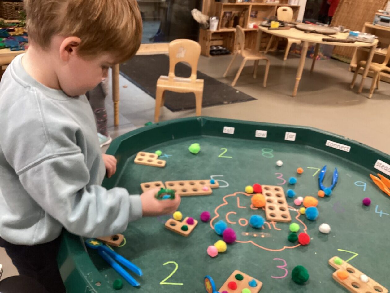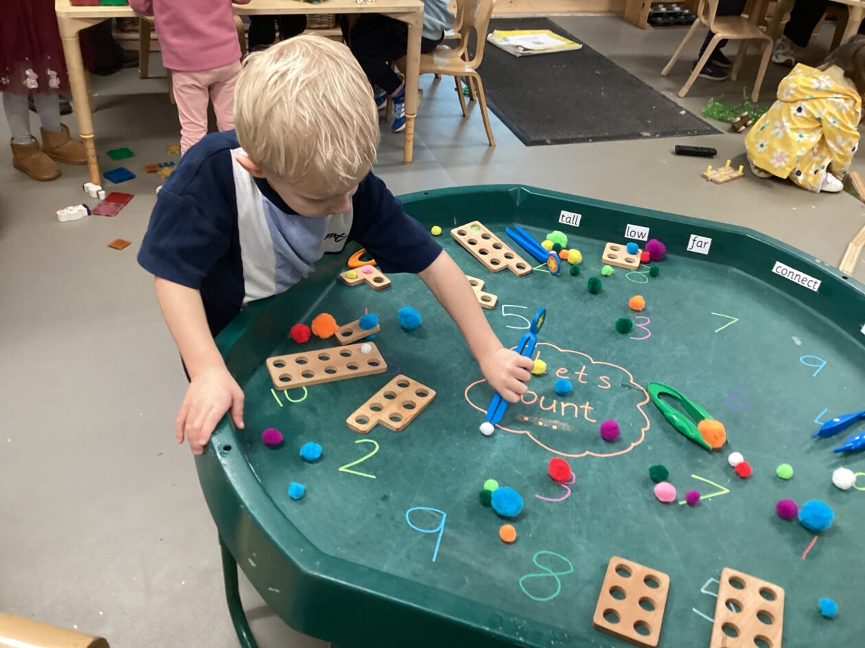 We have also been exploring numbers in the tuff tray, using the numicon and pom poms. We used the tweezers to add pom poms to the holes in the numicon and then touch counted to find out how many we had. Some children were also able to subitise to identify the number of holes. We then found the matching numbers written on the tray.