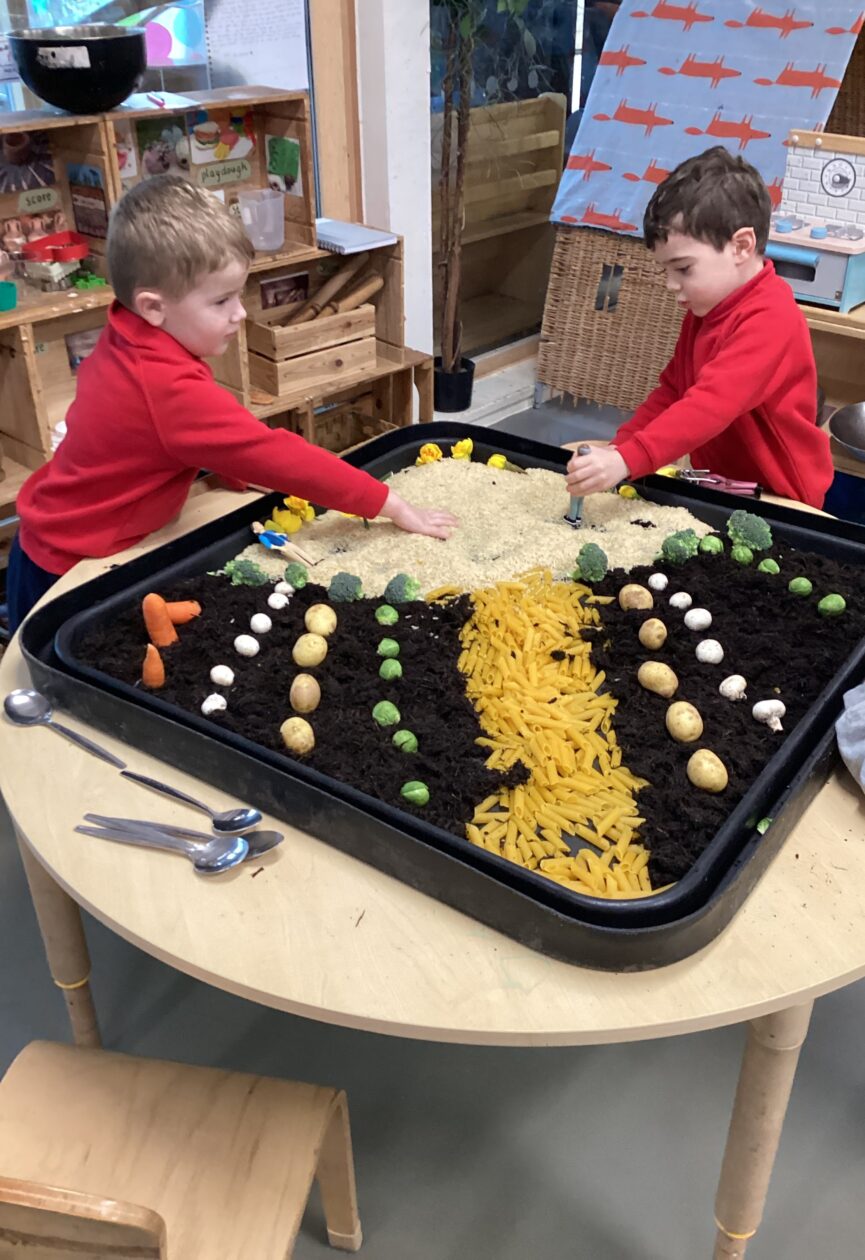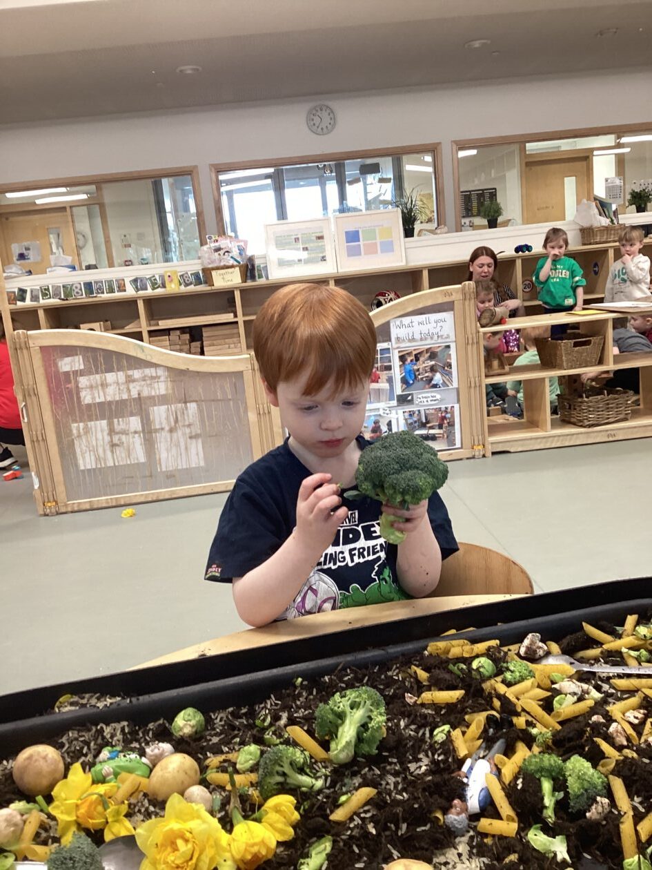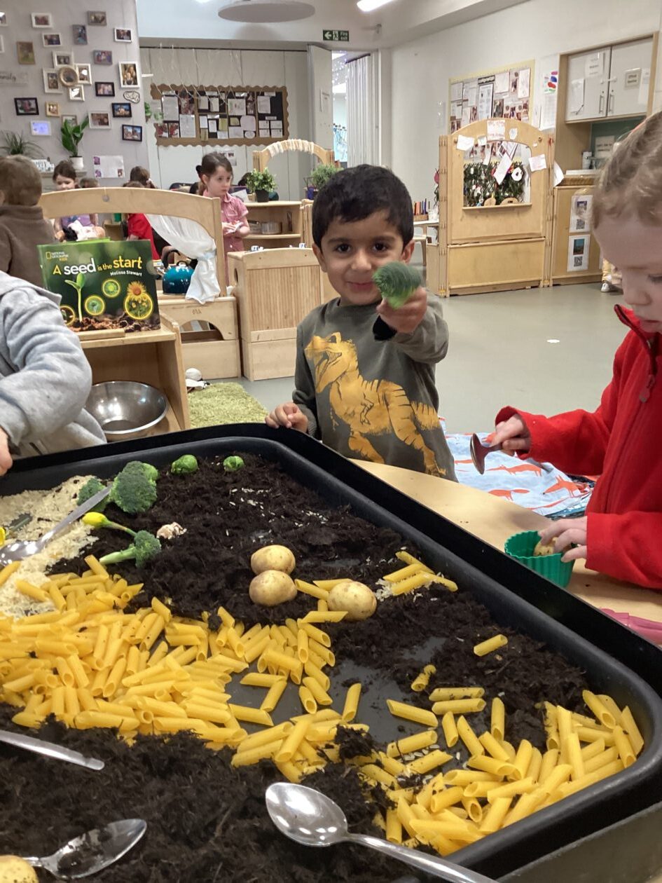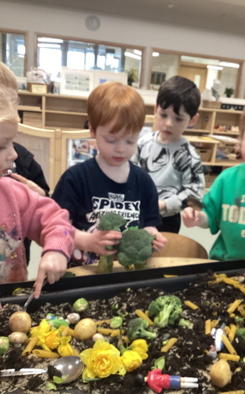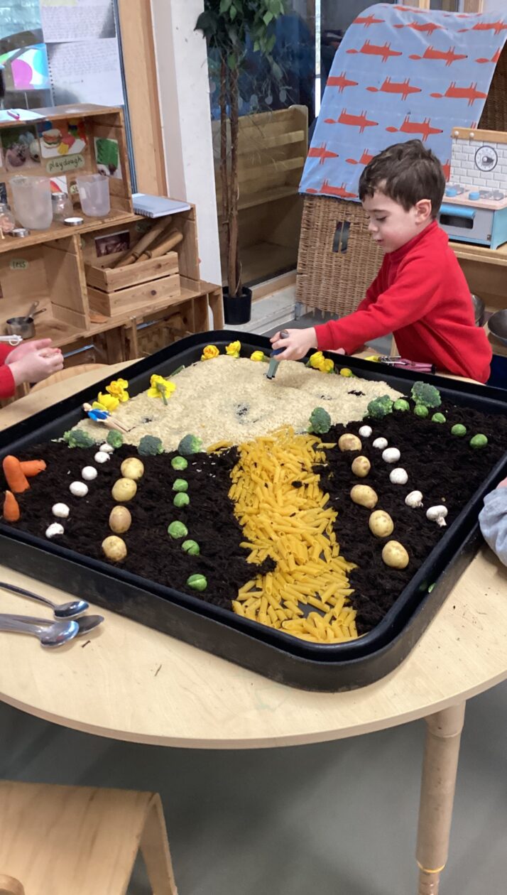 In our malleable area our farm-themed tuff tray sparked wonderful exploration as the children got stuck into a sensory harvest of potatoes, broccoli, carrots, and mushrooms. We began by digging into the big question of where our food begins, shifting our focus from the supermarket shelves back to the soil to discuss how farmers grow crops and transport them to our local shops. The children were fascinated to learn about the “secret ingredients” plants need to thrive—soil, water, and sunlight—while marvelling at how a tiny seed transforms into a crunchy carrot or a “mini tree” of broccoli. This exploration naturally flowed into our numeracy work as we used the vegetables to master the language of size, identifying which items were big, which were bigger, and which was the biggest of the bunch. We even took a moment to share our favourite vegetables, celebrating healthy eating and the journey from farm to fork.