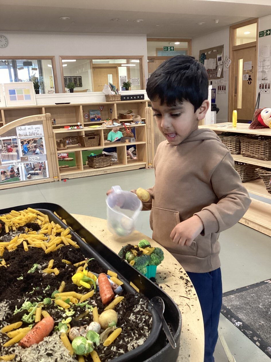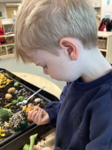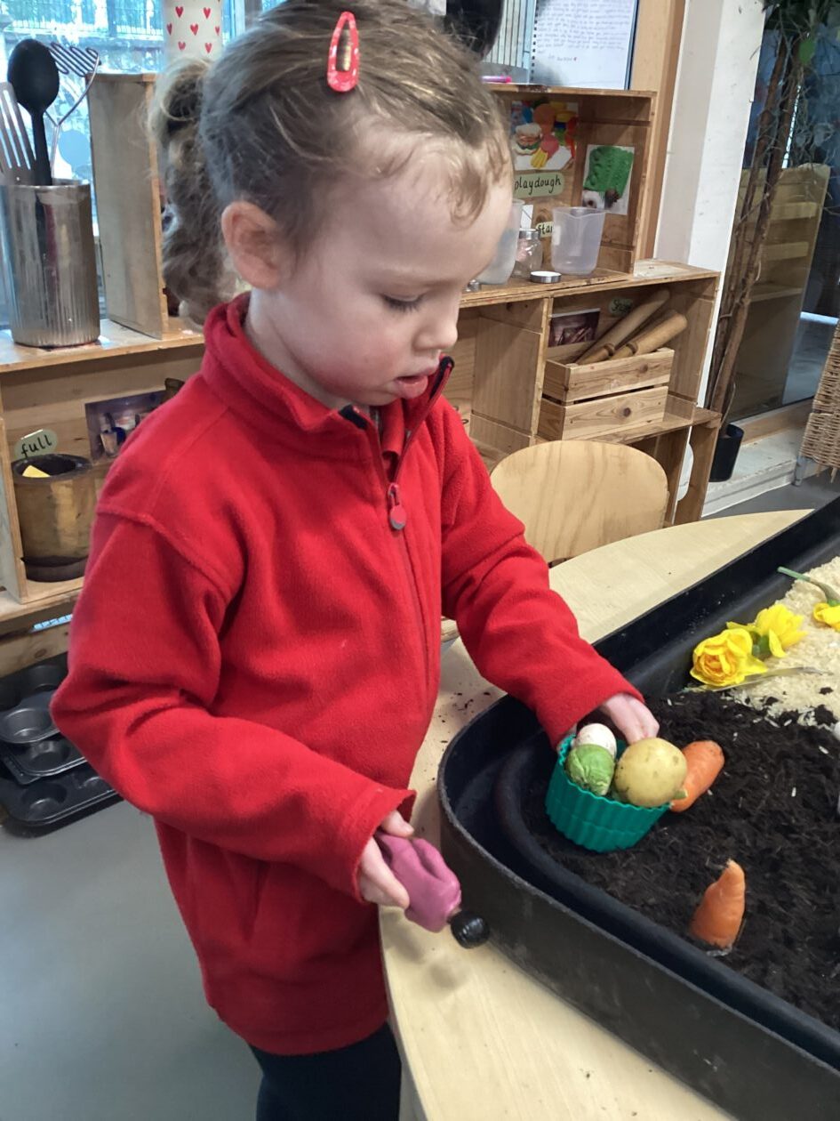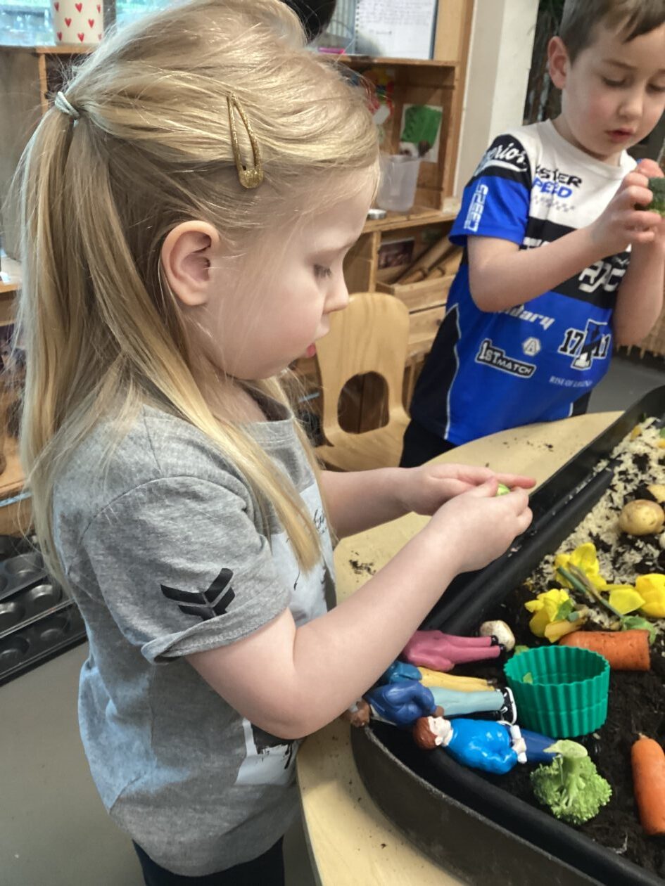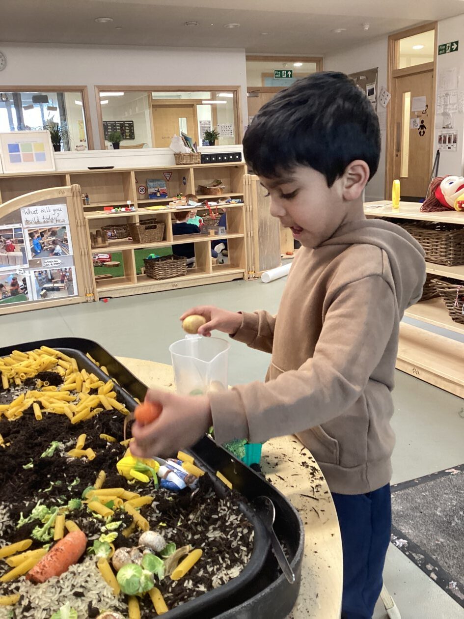 In our malleable area our farm-themed tuff tray sparked wonderful exploration as the children got stuck into a sensory harvest of potatoes, broccoli, carrots, and mushrooms. We began by digging into the big question of where our food begins, shifting our focus from the supermarket shelves back to the soil to discuss how farmers grow crops and transport them to our local shops. The children were fascinated to learn about the “secret ingredients” plants need to thrive—soil, water, and sunlight—while marvelling at how a tiny seed transforms into a crunchy carrot or a “mini tree” of broccoli. This exploration naturally flowed into our numeracy work as we used the vegetables to master the language of size, identifying which items were big, which were bigger, and which was the biggest of the bunch. We even took a moment to share our favourite vegetables, celebrating healthy eating and the journey from farm to fork.