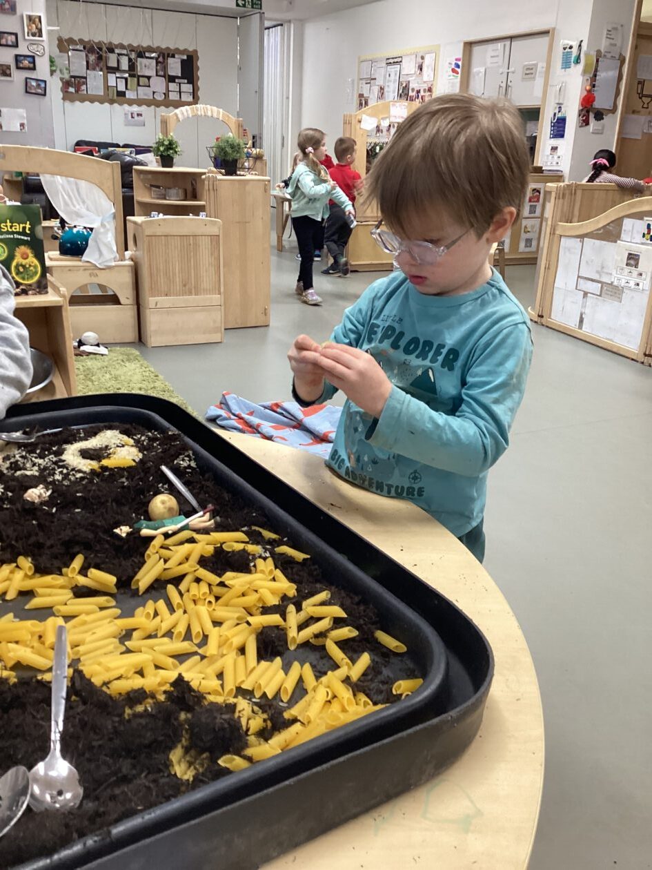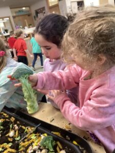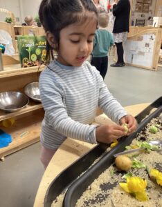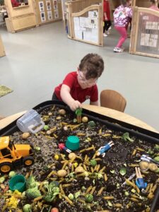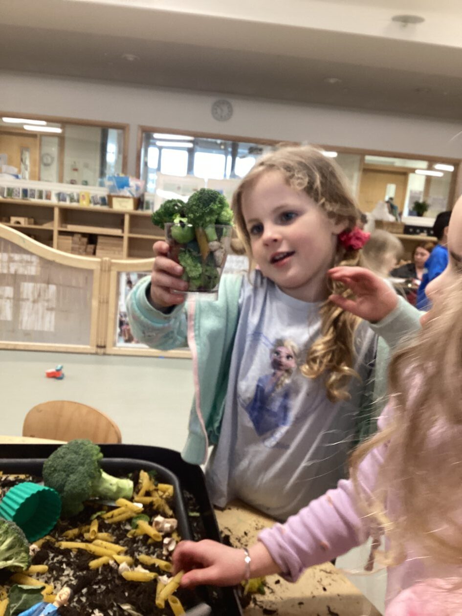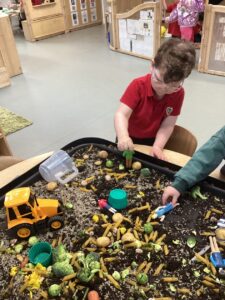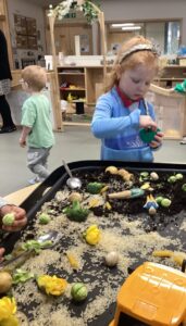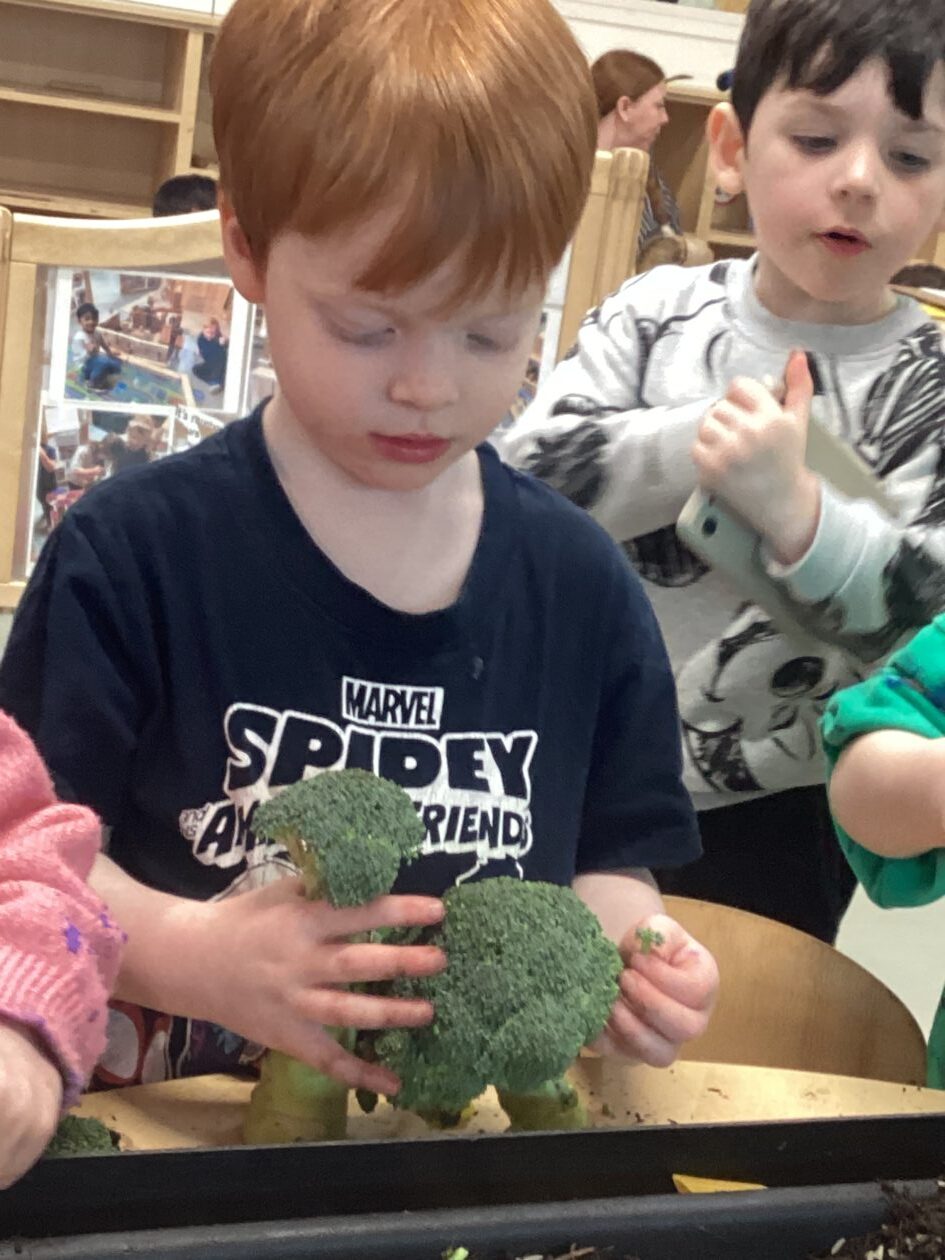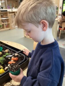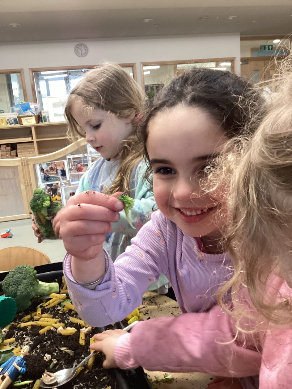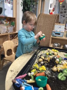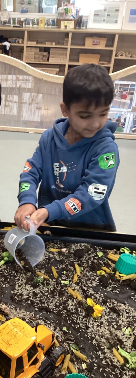 In our malleable area our farm-themed tuff tray sparked wonderful exploration as the children got stuck into a sensory harvest of potatoes, broccoli, carrots, and mushrooms. We began by digging into the big question of where our food begins, shifting our focus from the supermarket shelves back to the soil to discuss how farmers grow crops and transport them to our local shops. The children were fascinated to learn about the “secret ingredients” plants need to thrive—soil, water, and sunlight—while marvelling at how a tiny seed transforms into a crunchy carrot or a “mini tree” of broccoli. This exploration naturally flowed into our numeracy work as we used the vegetables to master the language of size, identifying which items were big, which were bigger, and which was the biggest of the bunch. We even took a moment to share our favourite vegetables, celebrating healthy eating and the journey from farm to fork.