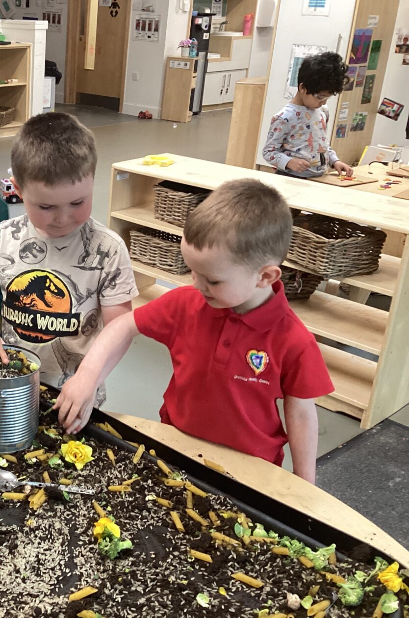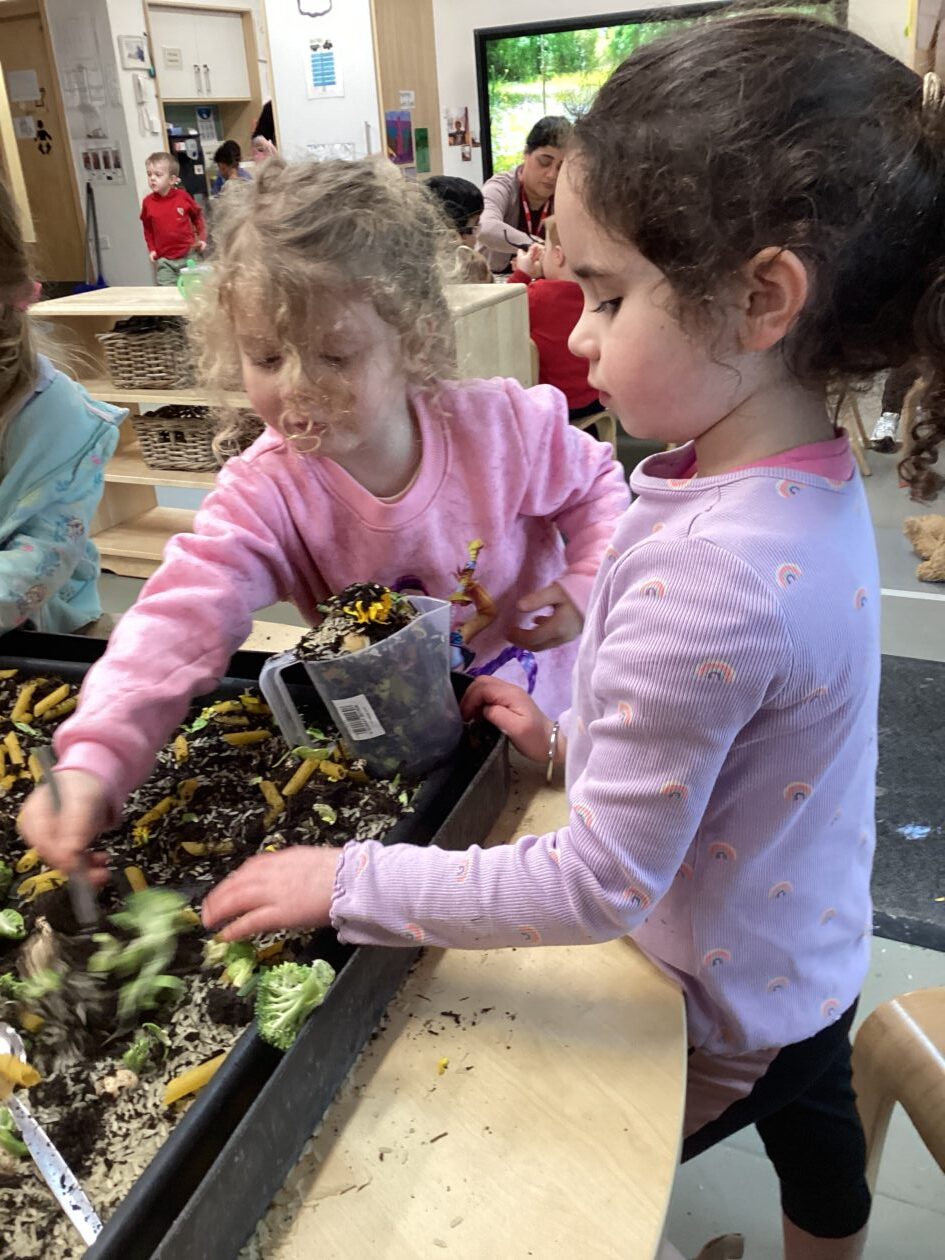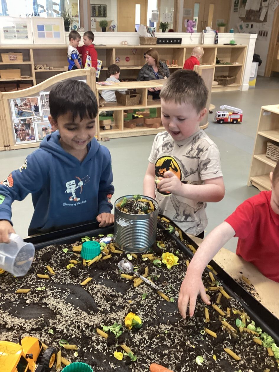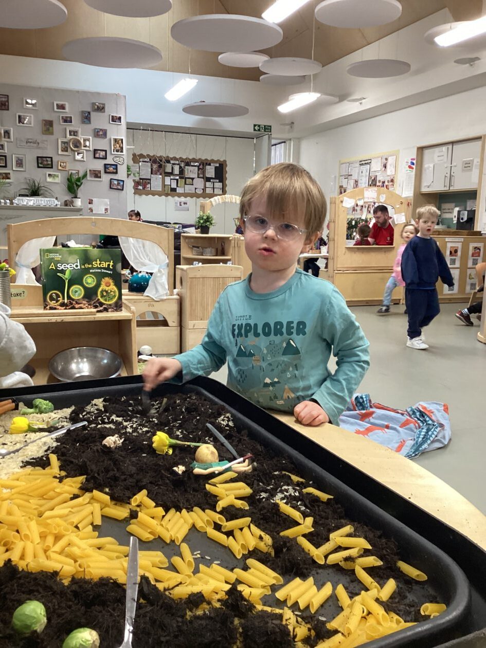 In our malleable area our farm-themed tuff tray sparked wonderful exploration as the children got stuck into a sensory harvest of potatoes, broccoli, carrots, and mushrooms. We began by digging into the big question of where our food begins, shifting our focus from the supermarket shelves back to the soil to discuss how farmers grow crops and transport them to our local shops. The children were fascinated to learn about the “secret ingredients” plants need to thrive—soil, water, and sunlight—while marvelling at how a tiny seed transforms into a crunchy carrot or a “mini tree” of broccoli. This exploration naturally flowed into our numeracy work as we used the vegetables to master the language of size, identifying which items were big, which were bigger, and which was the biggest of the bunch. We even took a moment to share our favourite vegetables, celebrating healthy eating and the journey from farm to fork.