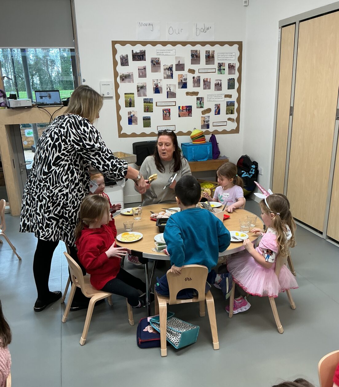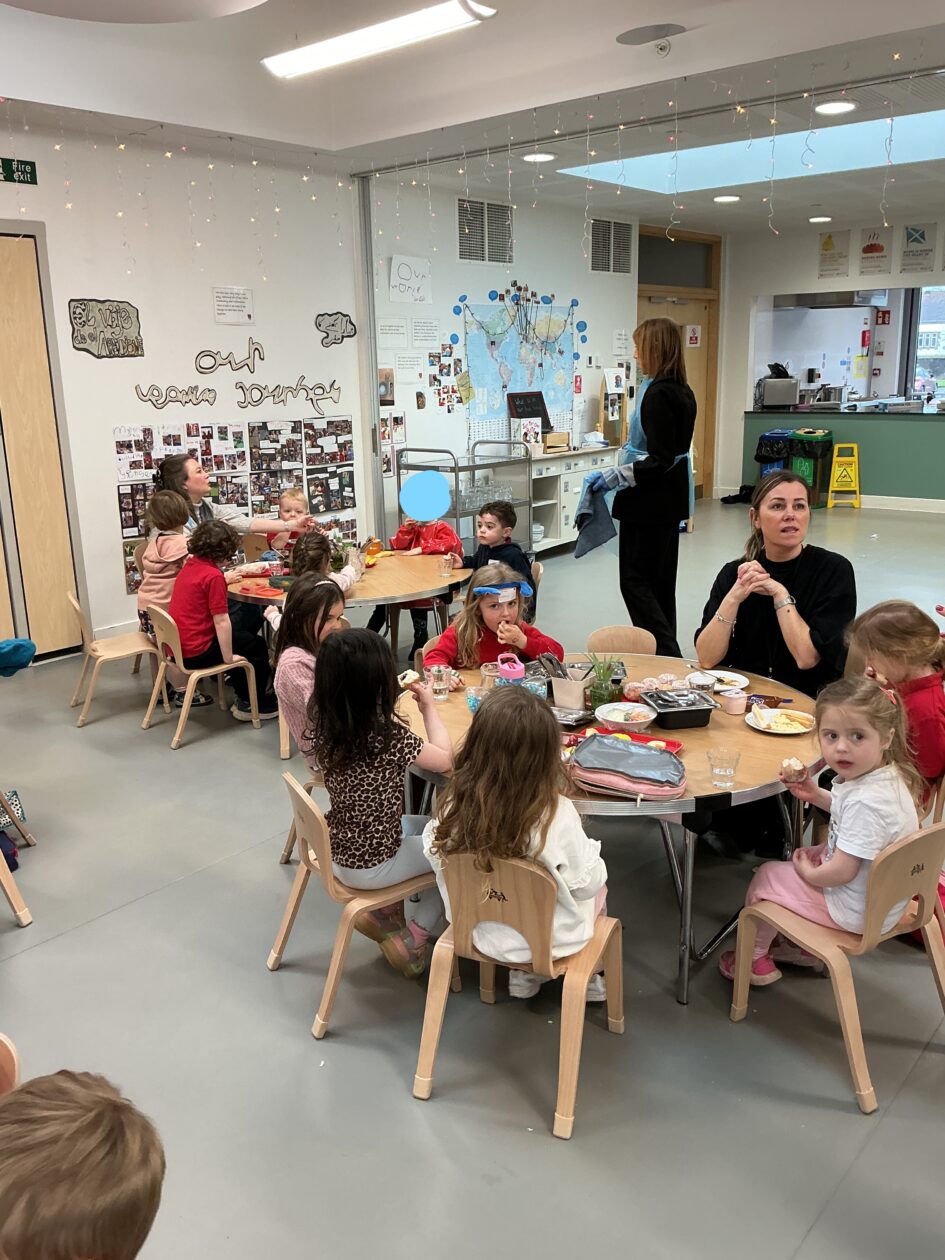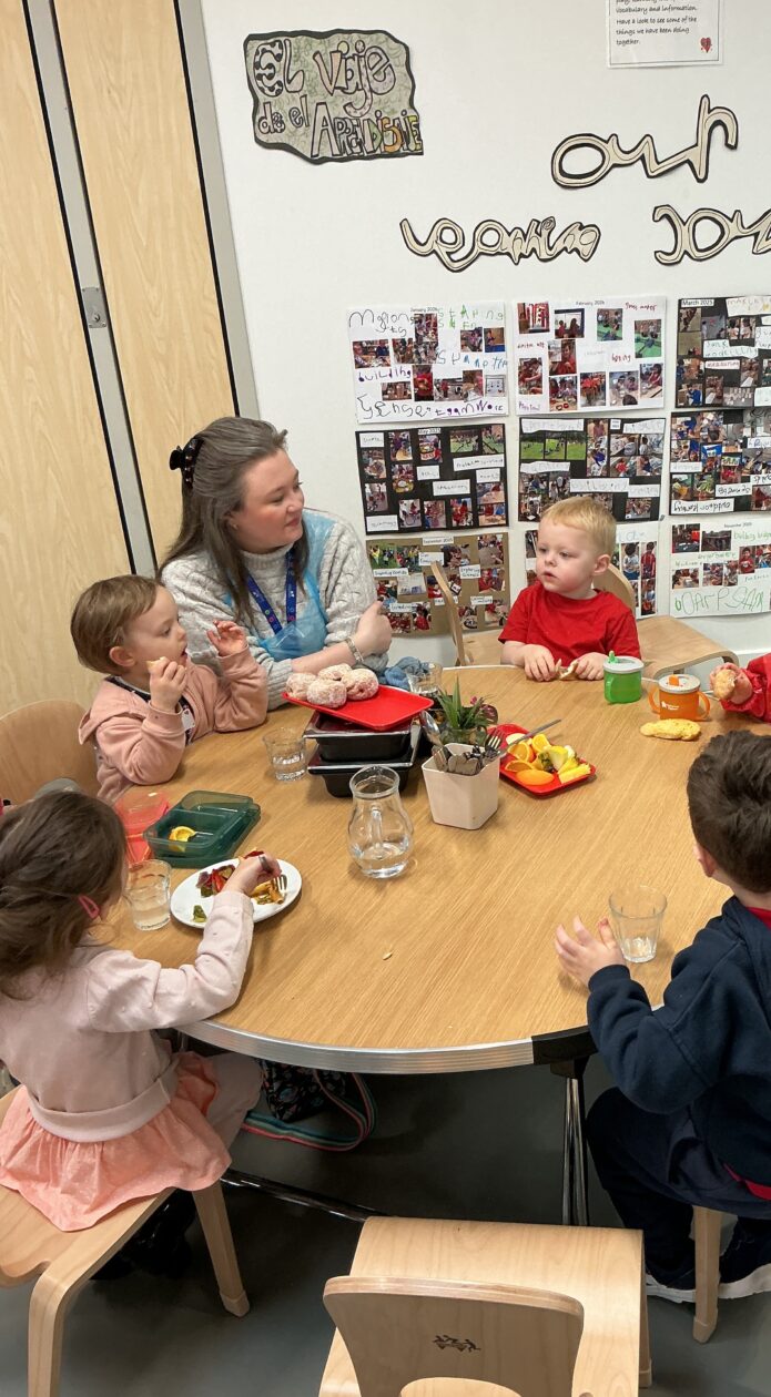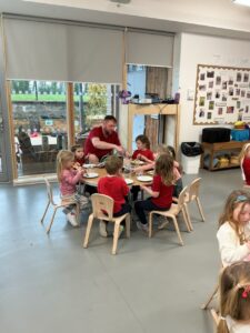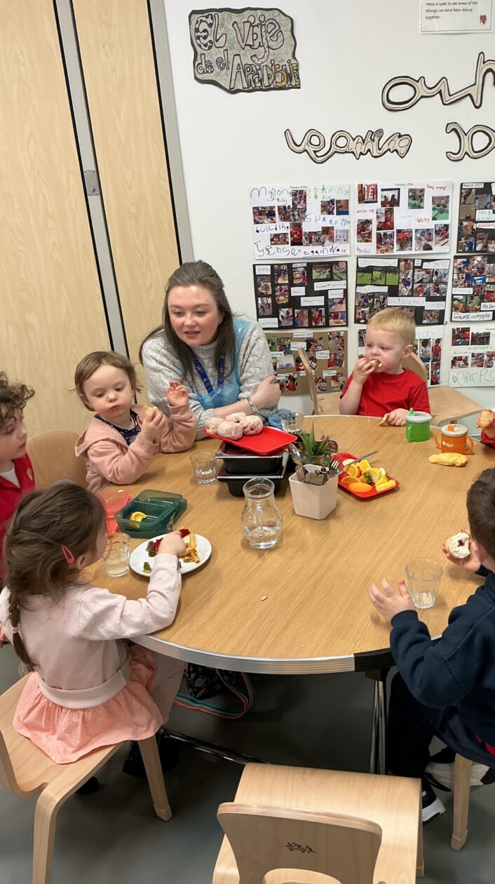 Another lovely change is our new circular table seating. Children now sit together around round tables with a member of staff at each one. This creates a calm, family-style environment where staff can support conversations, encourage good table manners, and ensure everyone feels included.