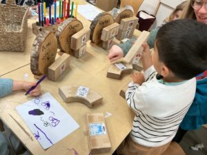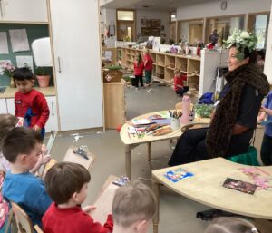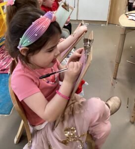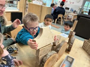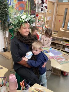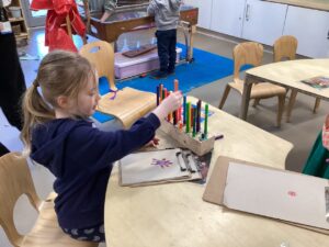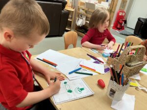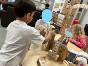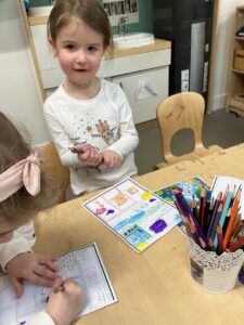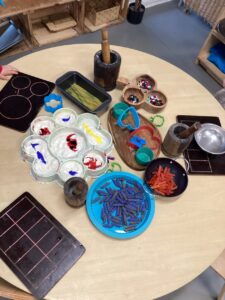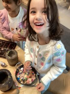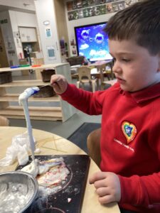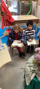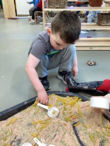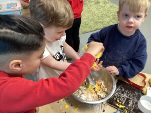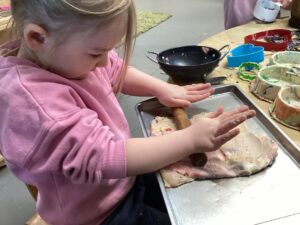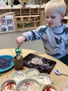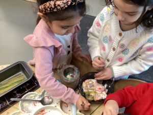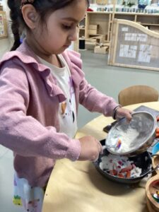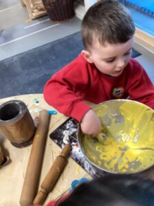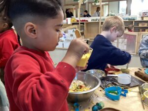 In the malleable area, children engaged in imaginative play by creating pancakes and cakes using a variety of loose parts such as different types of pasta, colourful sequins, and shaving foam in a range of colours. They carefully mixed, scooped, and shaped their “ingredients,” before moving to the home corner to cook and serve their creations through role play. This type of open-ended, sensory-rich play supports creativity and imagination while developing fine motor skills and hand-eye coordination. It also encourages language development as children describe their ideas and engage in collaborative storytelling. Additionally, role play in familiar contexts, like cooking, helps build social skills, confidence, and an understanding of the world around them.