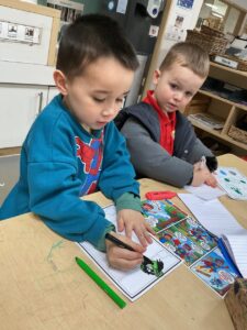 This week in the literacy area we have been exploring comics and creating our own comics. The children have been design and creating their own short stories to add to the comics. We have been exploring the difference between speech bubbles, thought bubbles and sound bubbles. This has encouraged children’s creativity and imagination, make making skills and understanding of the structure of stories having a beginning, middle and end.