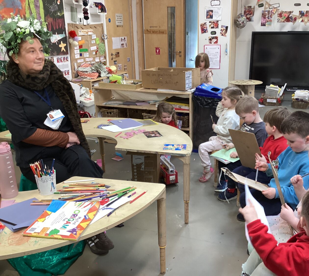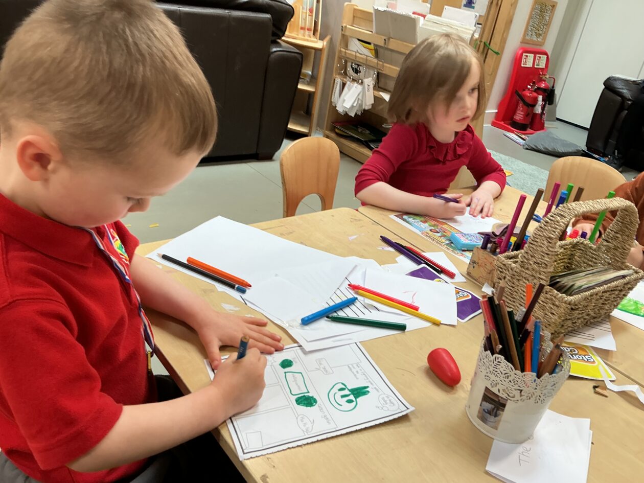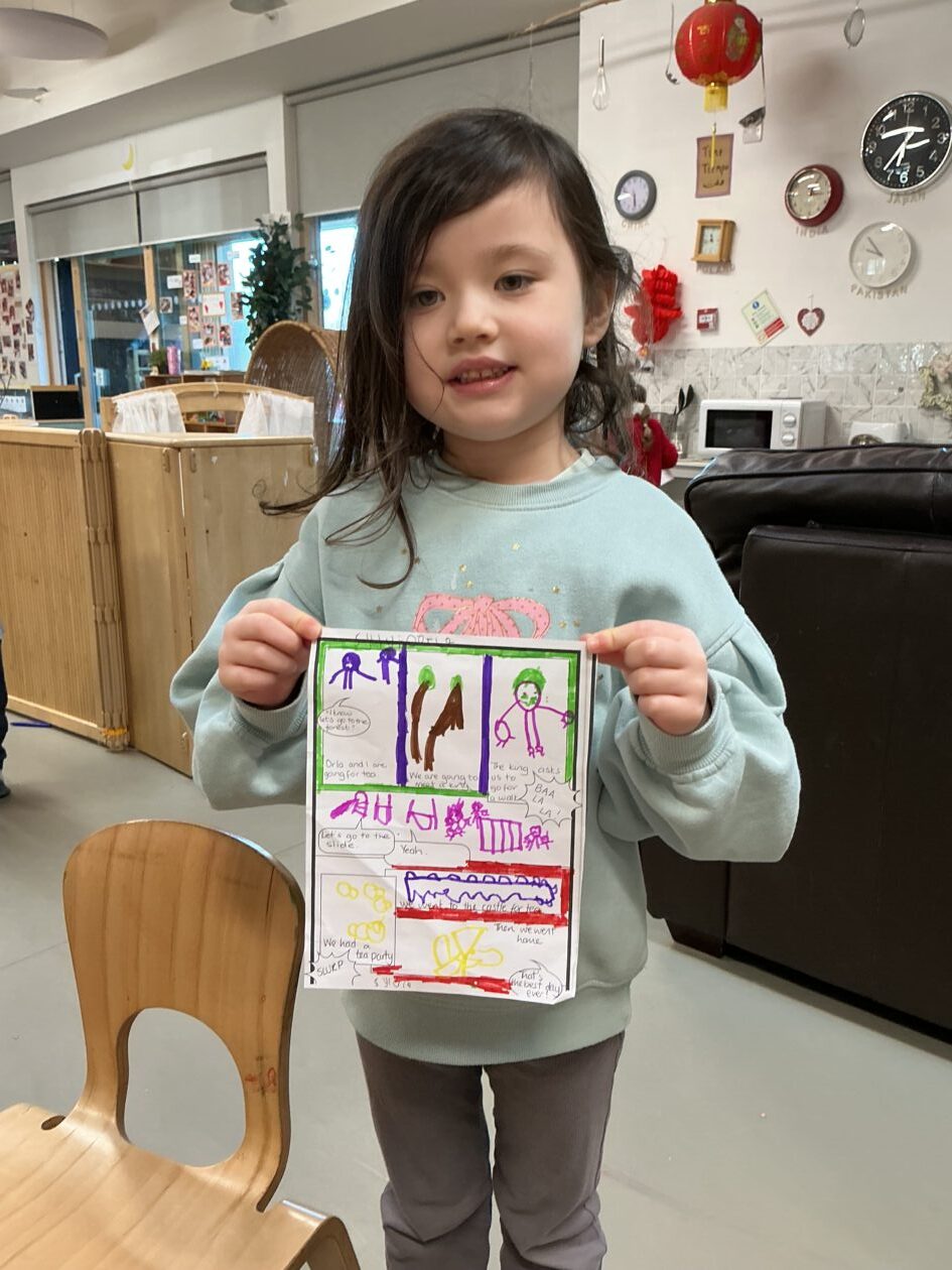 This week in the literacy area we have been exploring comics and creating our own comics. The children have been design and creating their own short stories to add to the comics. We have been exploring the difference between speech bubbles, thought bubbles and sound bubbles. This has encouraged children’s creativity and imagination, make making skills and understanding of the structure of stories having a beginning, middle and end.