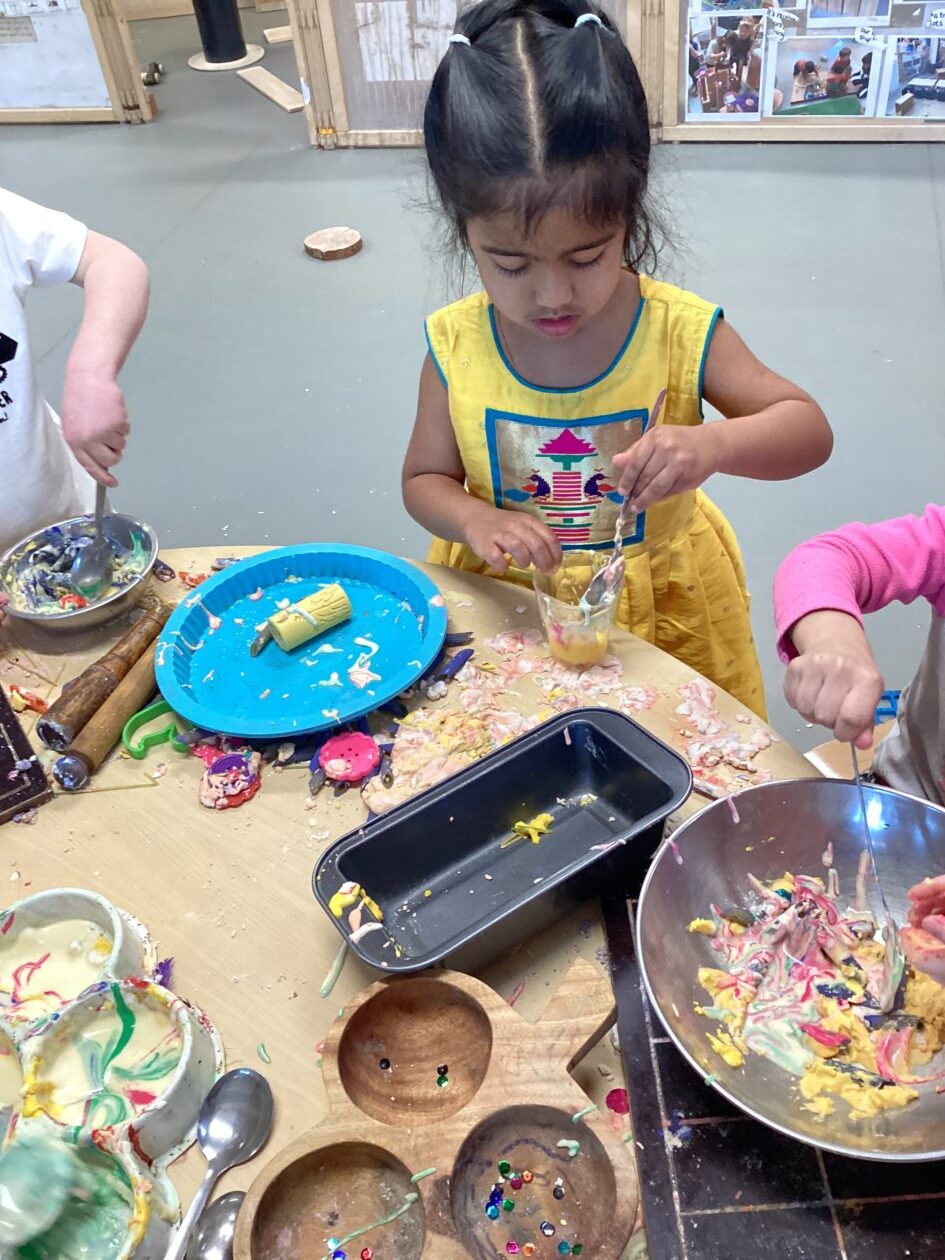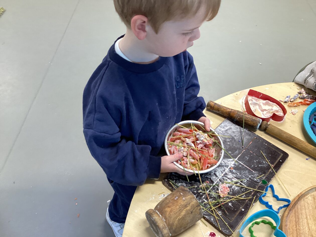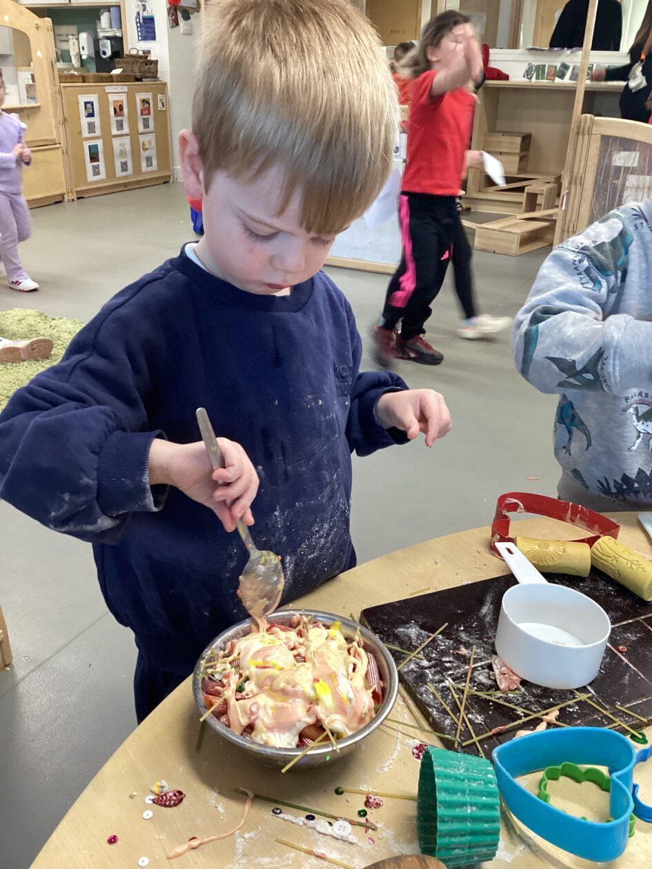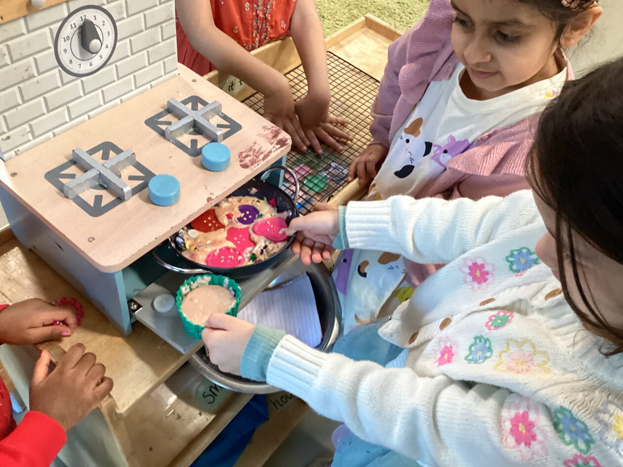 In the malleable area, children engaged in imaginative play by creating pancakes and cakes using a variety of loose parts such as different types of pasta, colourful sequins, and shaving foam in a range of colours. They carefully mixed, scooped, and shaped their “ingredients,” before moving to the home corner to cook and serve their creations through role play. This type of open-ended, sensory-rich play supports creativity and imagination while developing fine motor skills and hand-eye coordination. It also encourages language development as children describe their ideas and engage in collaborative storytelling. Additionally, role play in familiar contexts, like cooking, helps build social skills, confidence, and an understanding of the world around them.