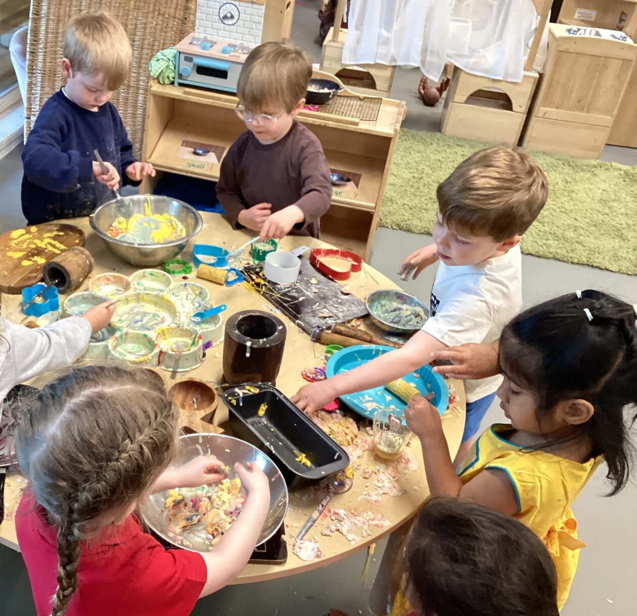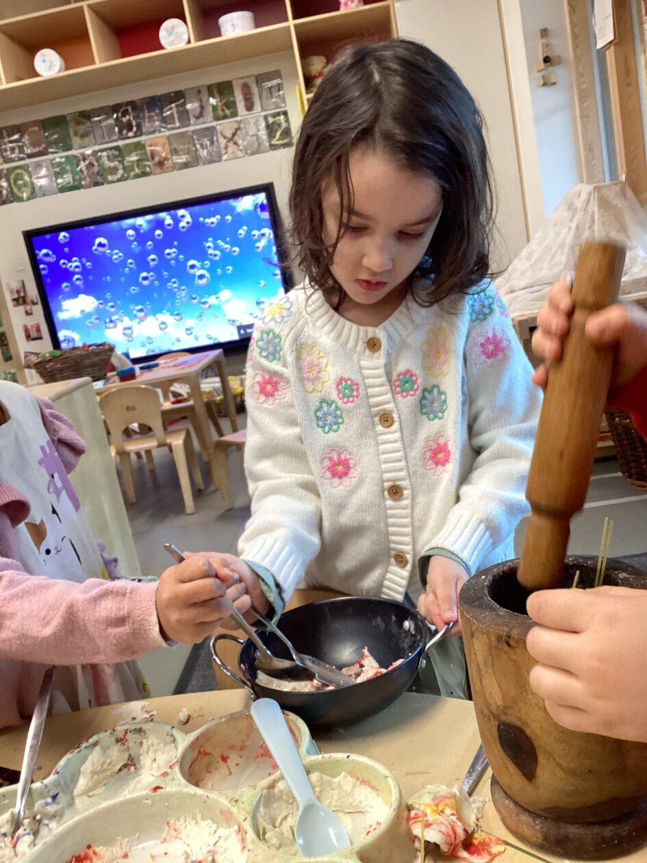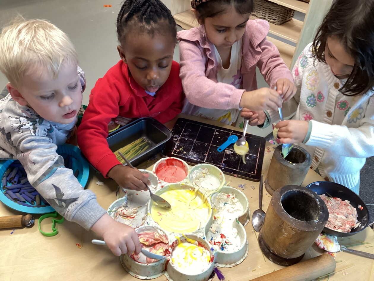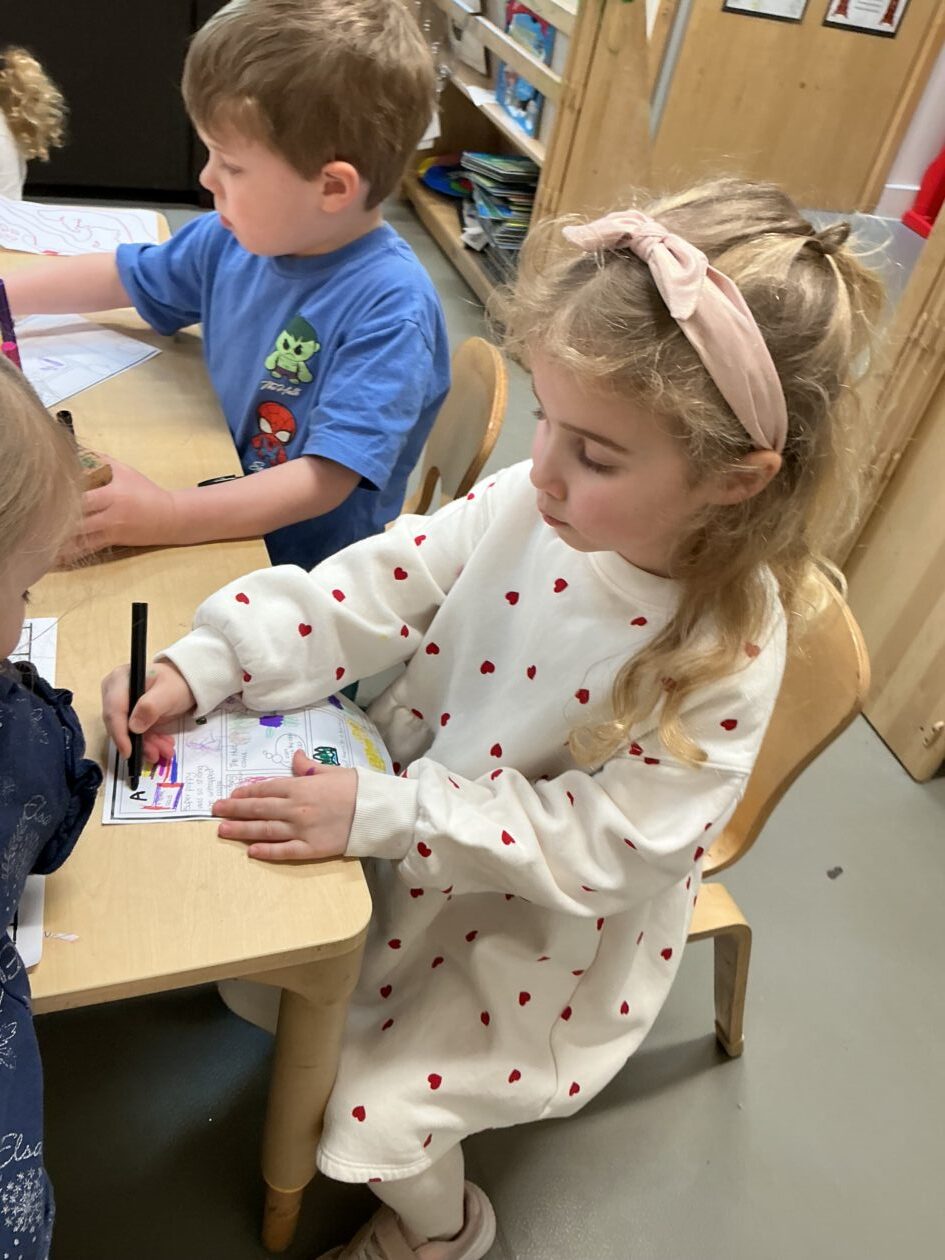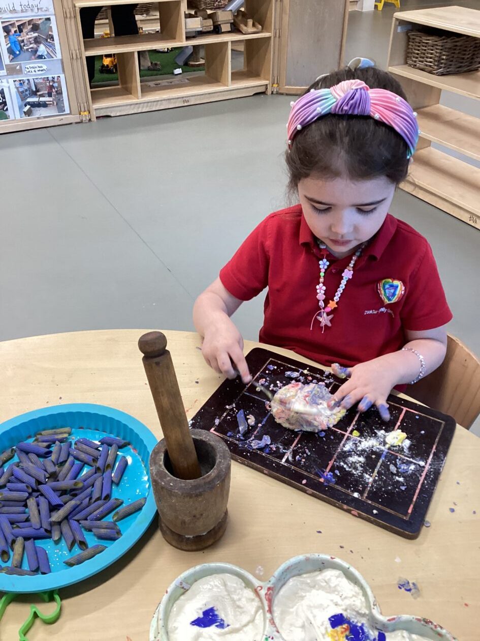In the malleable area, children engaged in imaginative play by creating pancakes and cakes using a variety of loose parts such as different types of pasta, colourful sequins, and shaving foam in a range of colours. They carefully mixed, scooped, and shaped their “ingredients,” before moving to the home corner to cook and serve their creations through role play. This type of open-ended, sensory-rich play supports creativity and imagination while developing fine motor skills and hand-eye coordination. It also encourages language development as children describe their ideas and engage in collaborative storytelling. Additionally, role play in familiar contexts, like cooking, helps build social skills, confidence, and an understanding of the world around them.