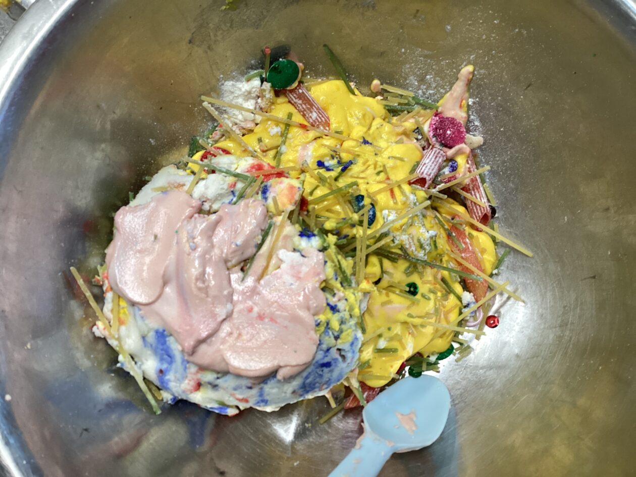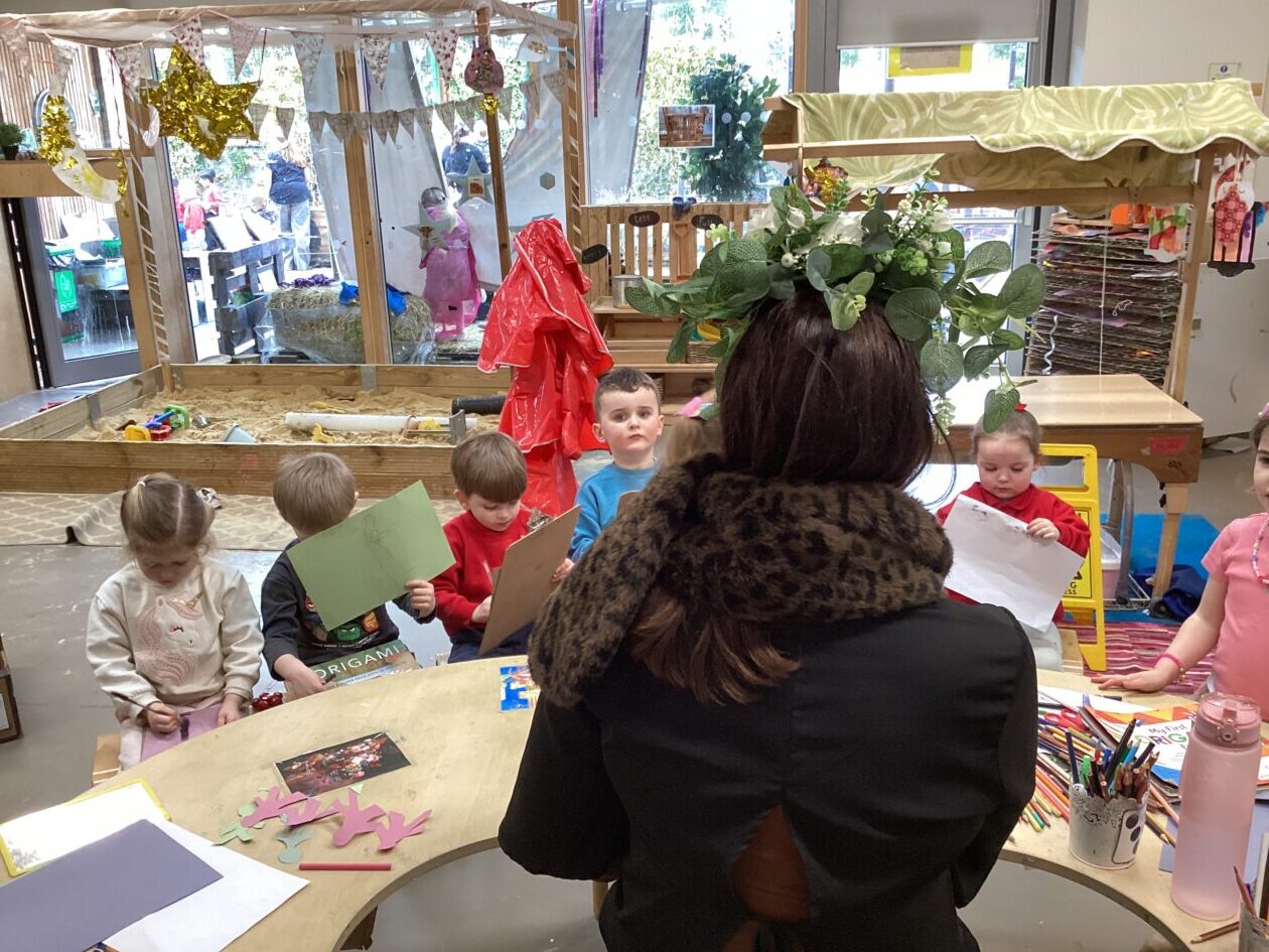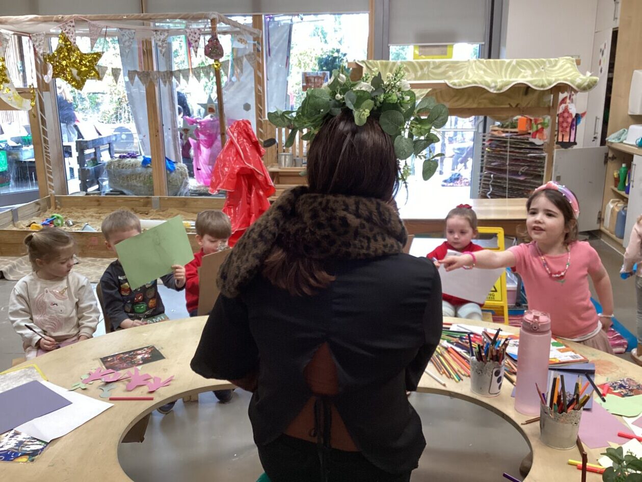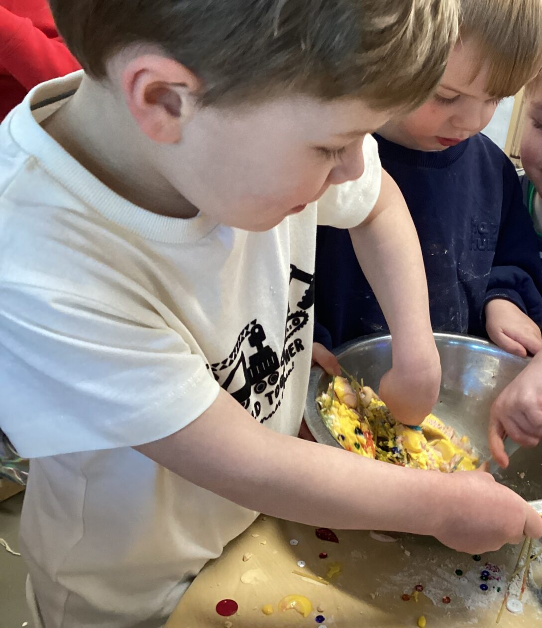 In the malleable area, children engaged in imaginative play by creating pancakes and cakes using a variety of loose parts such as different types of pasta, colourful sequins, and shaving foam in a range of colours. They carefully mixed, scooped, and shaped their “ingredients,” before moving to the home corner to cook and serve their creations through role play. This type of open-ended, sensory-rich play supports creativity and imagination while developing fine motor skills and hand-eye coordination. It also encourages language development as children describe their ideas and engage in collaborative storytelling. Additionally, role play in familiar contexts, like cooking, helps build social skills, confidence, and an understanding of the world around them.