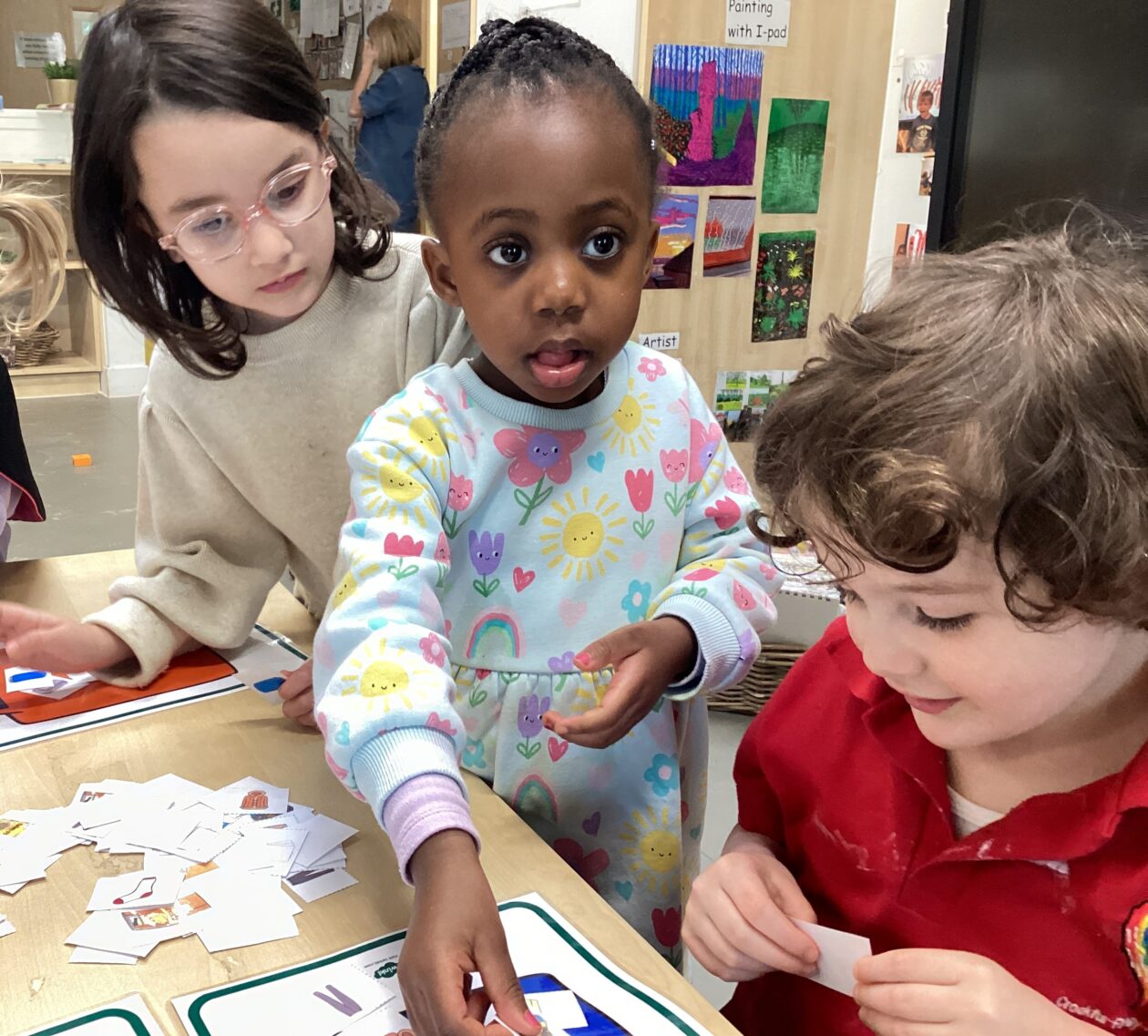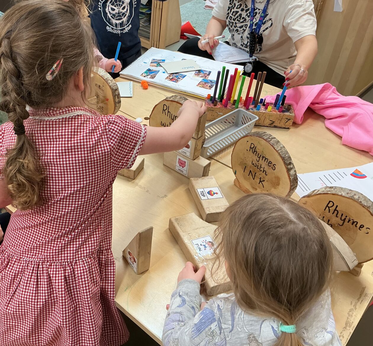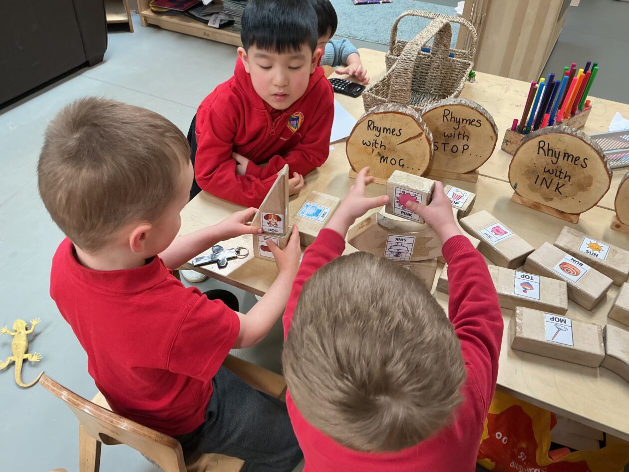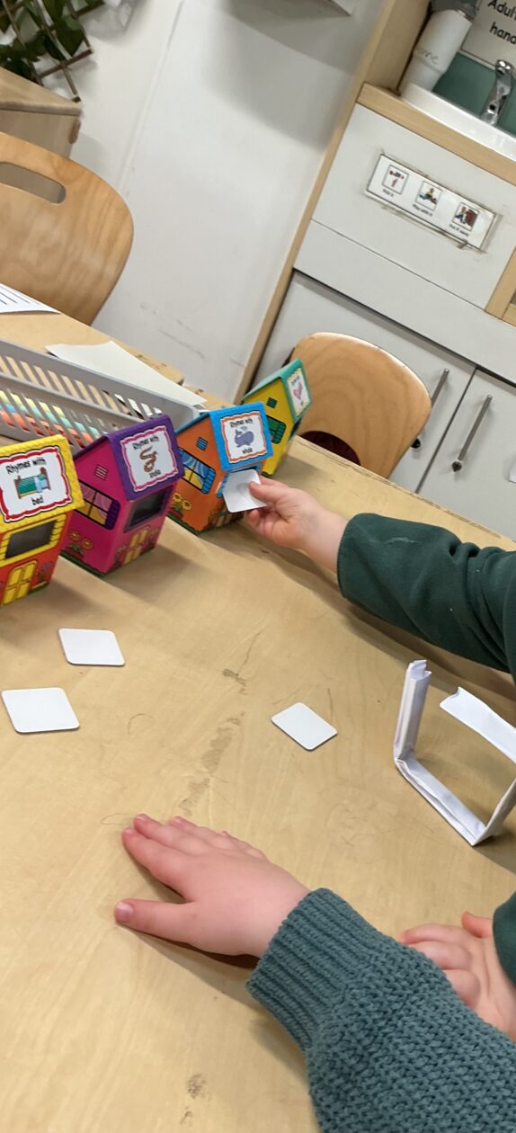 We have also been exploring rhyme through blocks and matching them to build a rhyme tower. The children have been working on listening to the different sounds in words and identifying sounds that are similar.