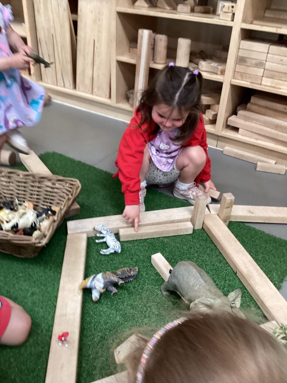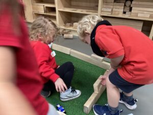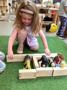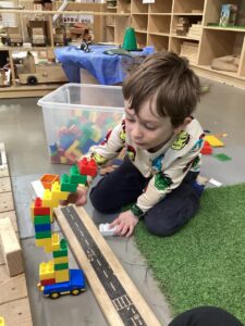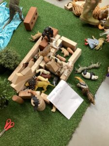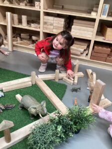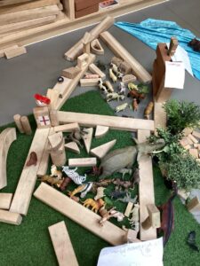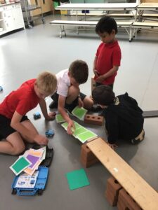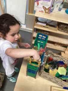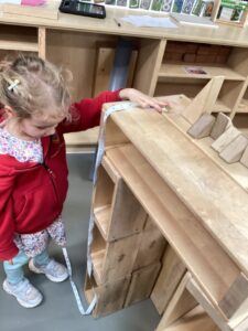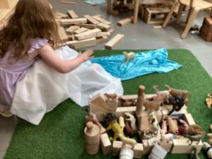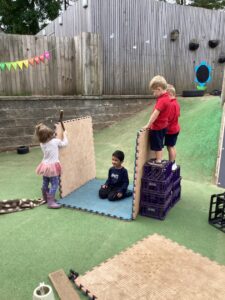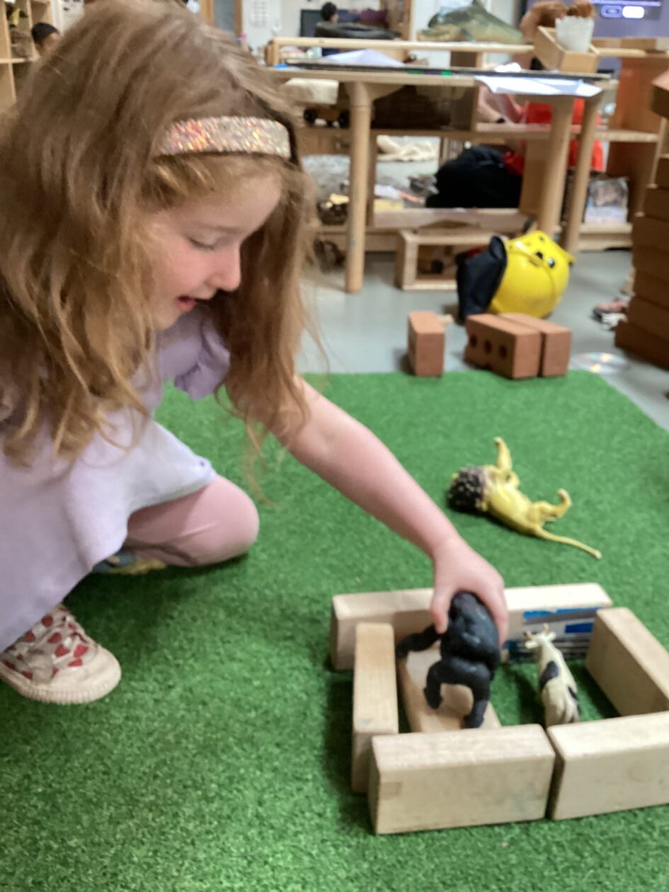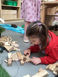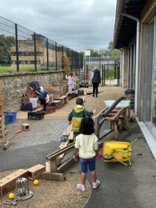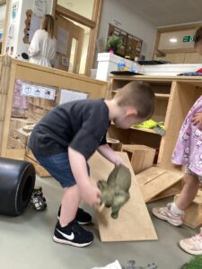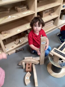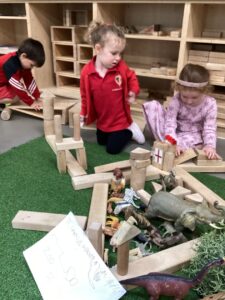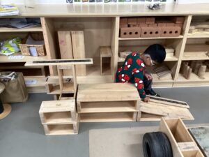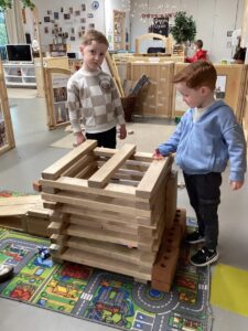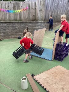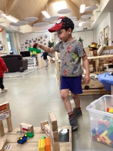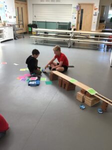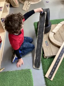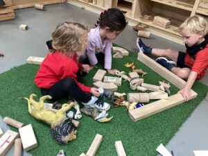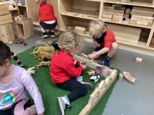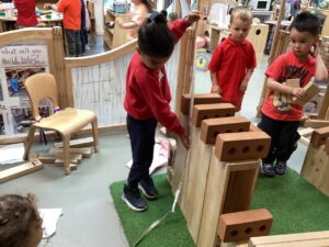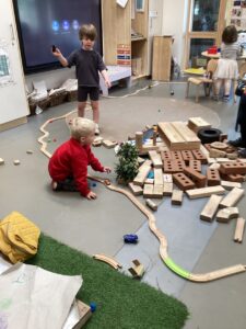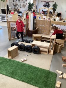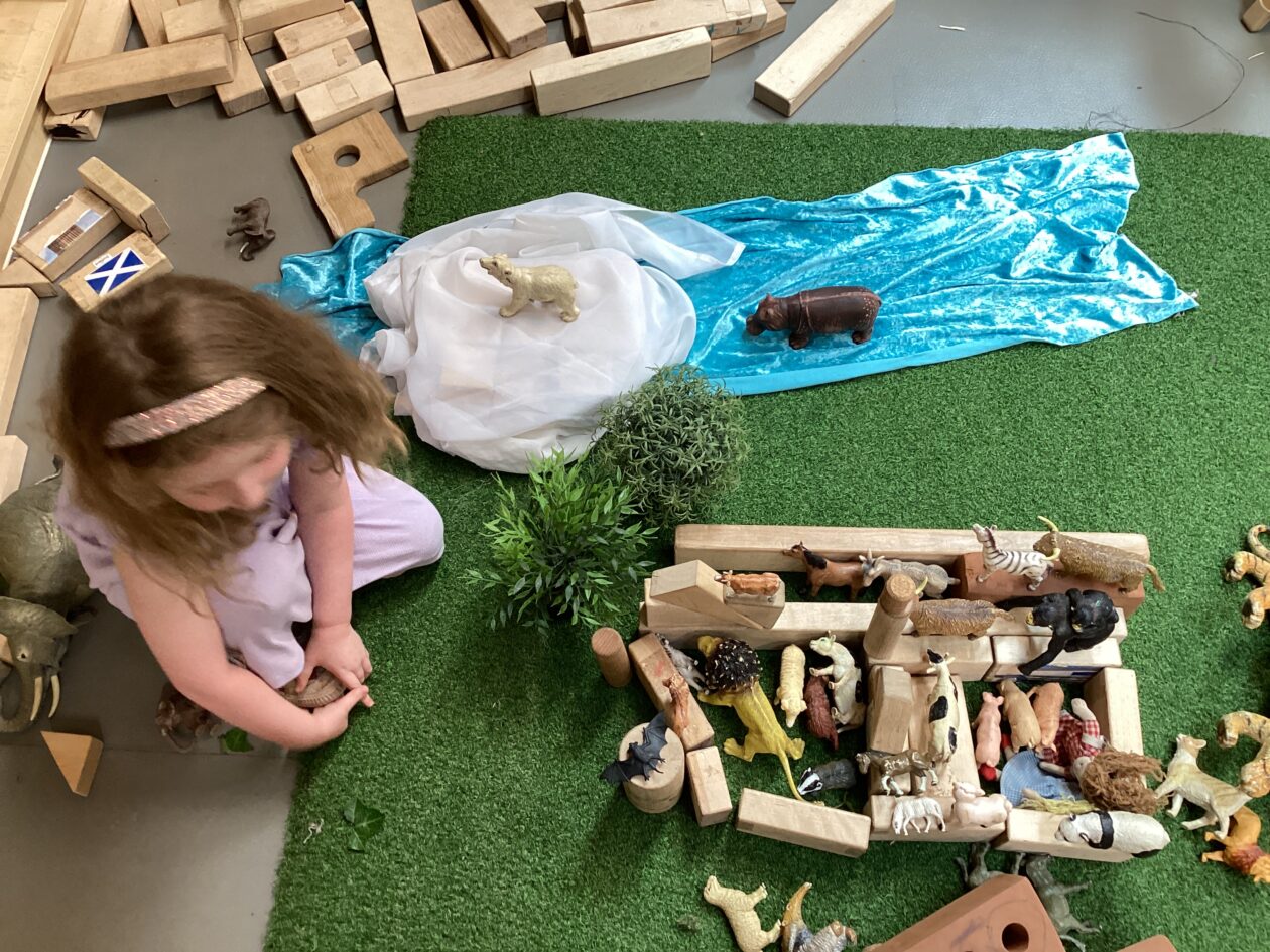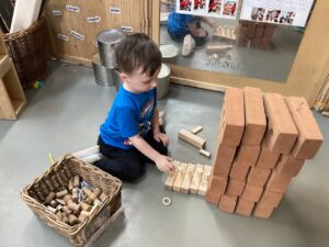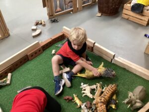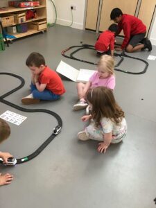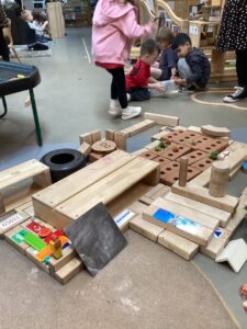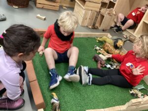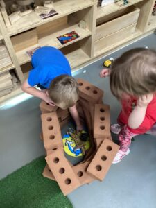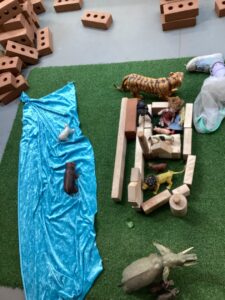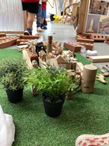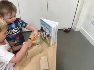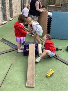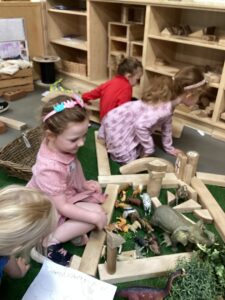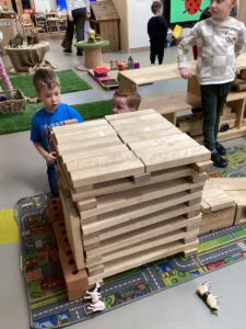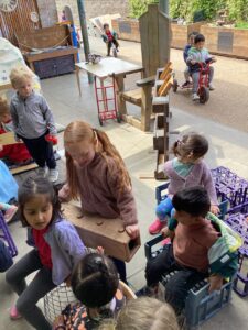 In the block and small world areas this week, children have continued to build many different types of vehicles such as boats, cars and trains.  This has been developing their collaborative skills and language skills.  Their buildings have become increasingly more complex with lots of details. There has been lots of imaginative storytelling in small world that supports developing friendships. The children have been regularly risk assessing our area to check that it is safe for play.