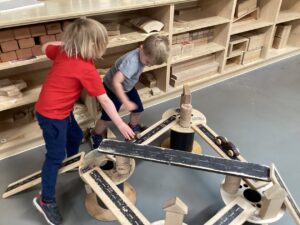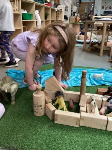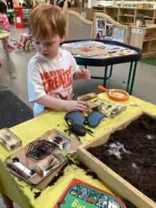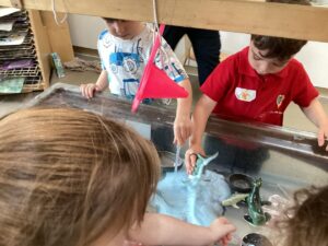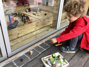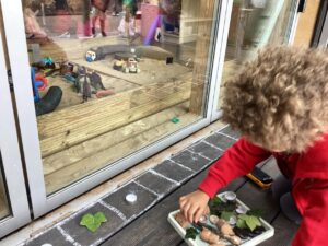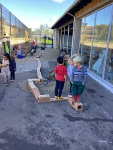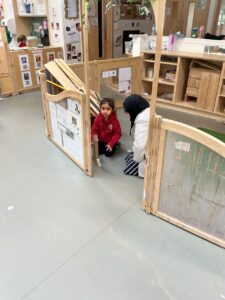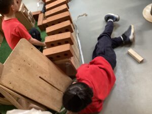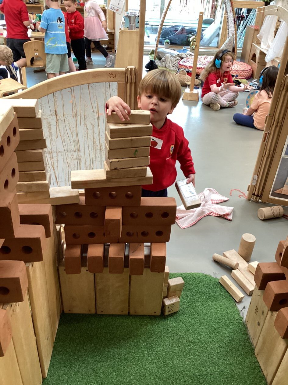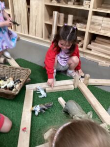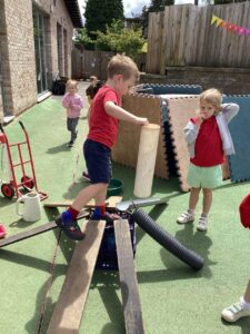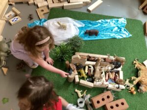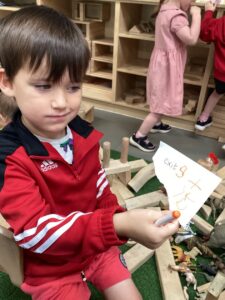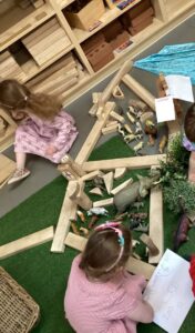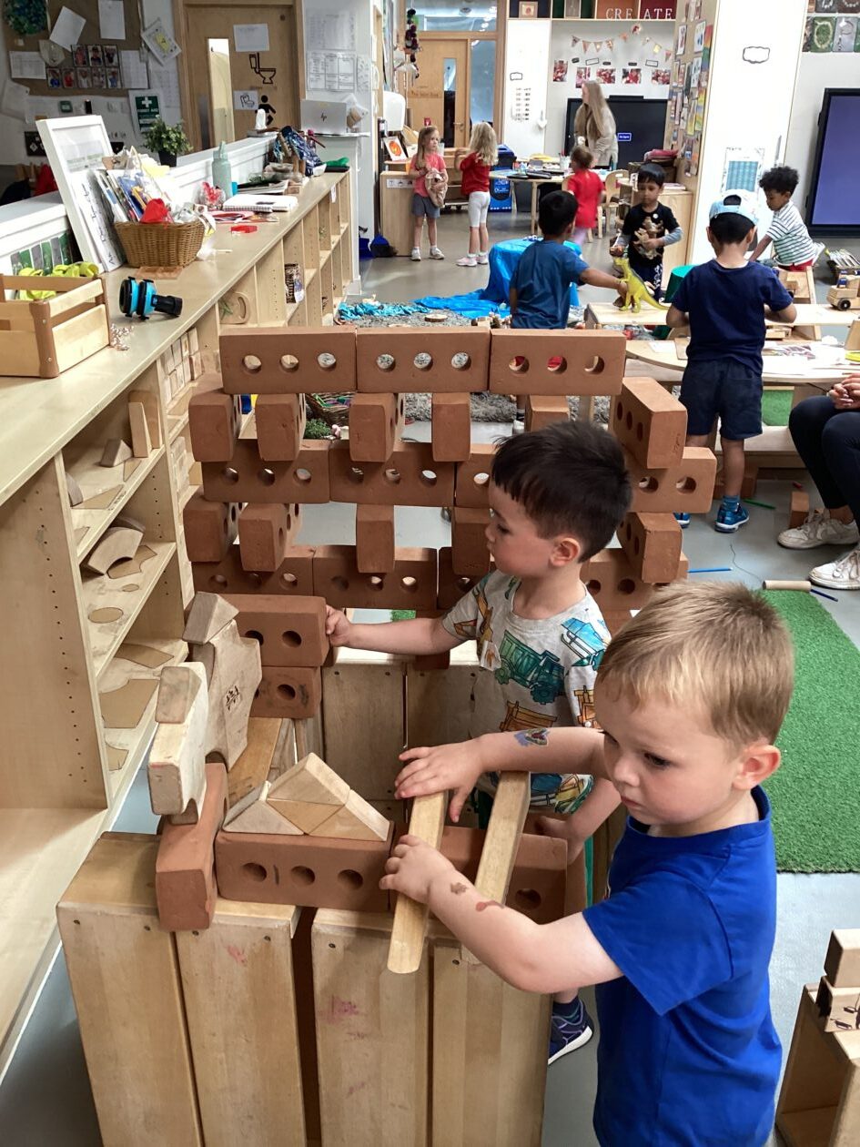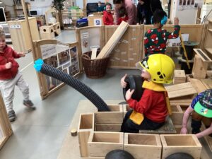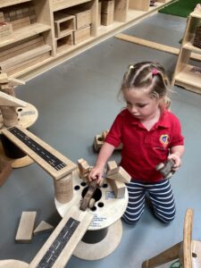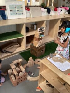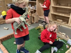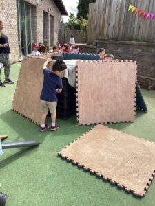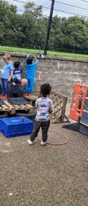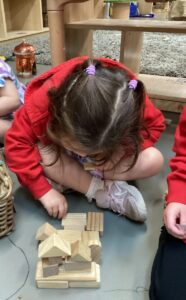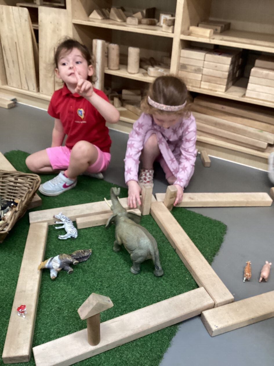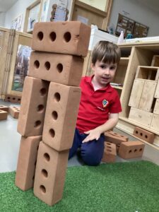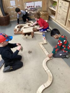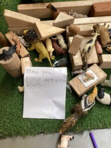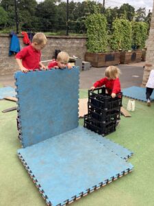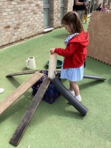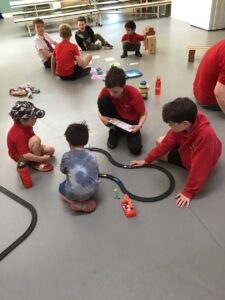 In the block and small world areas this week, children have continued to build many different types of vehicles such as boats, cars and trains.  This has been developing their collaborative skills and language skills.  Their buildings have become increasingly more complex with lots of details. There has been lots of imaginative storytelling in small world that supports developing friendships. The children have been regularly risk assessing our area to check that it is safe for play.