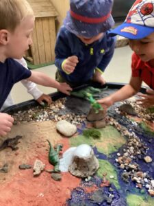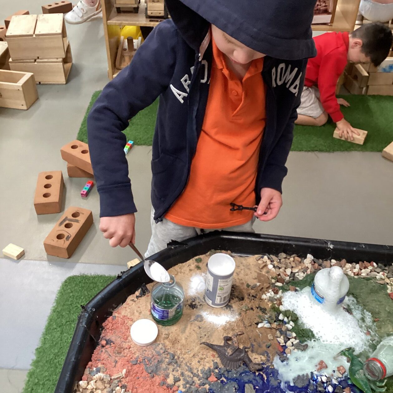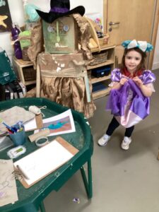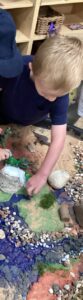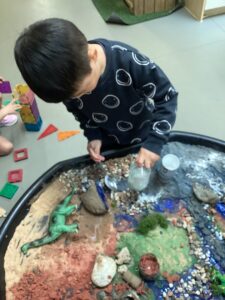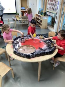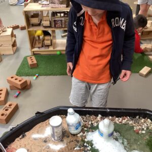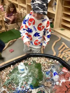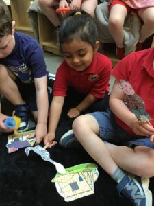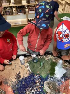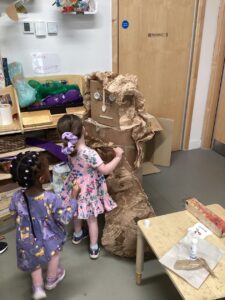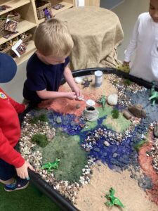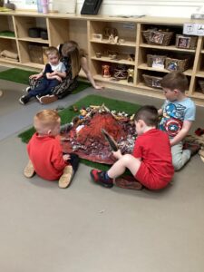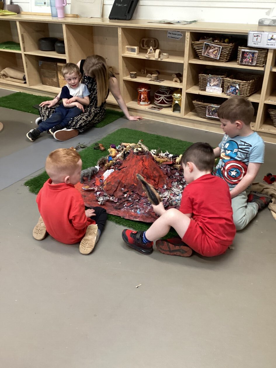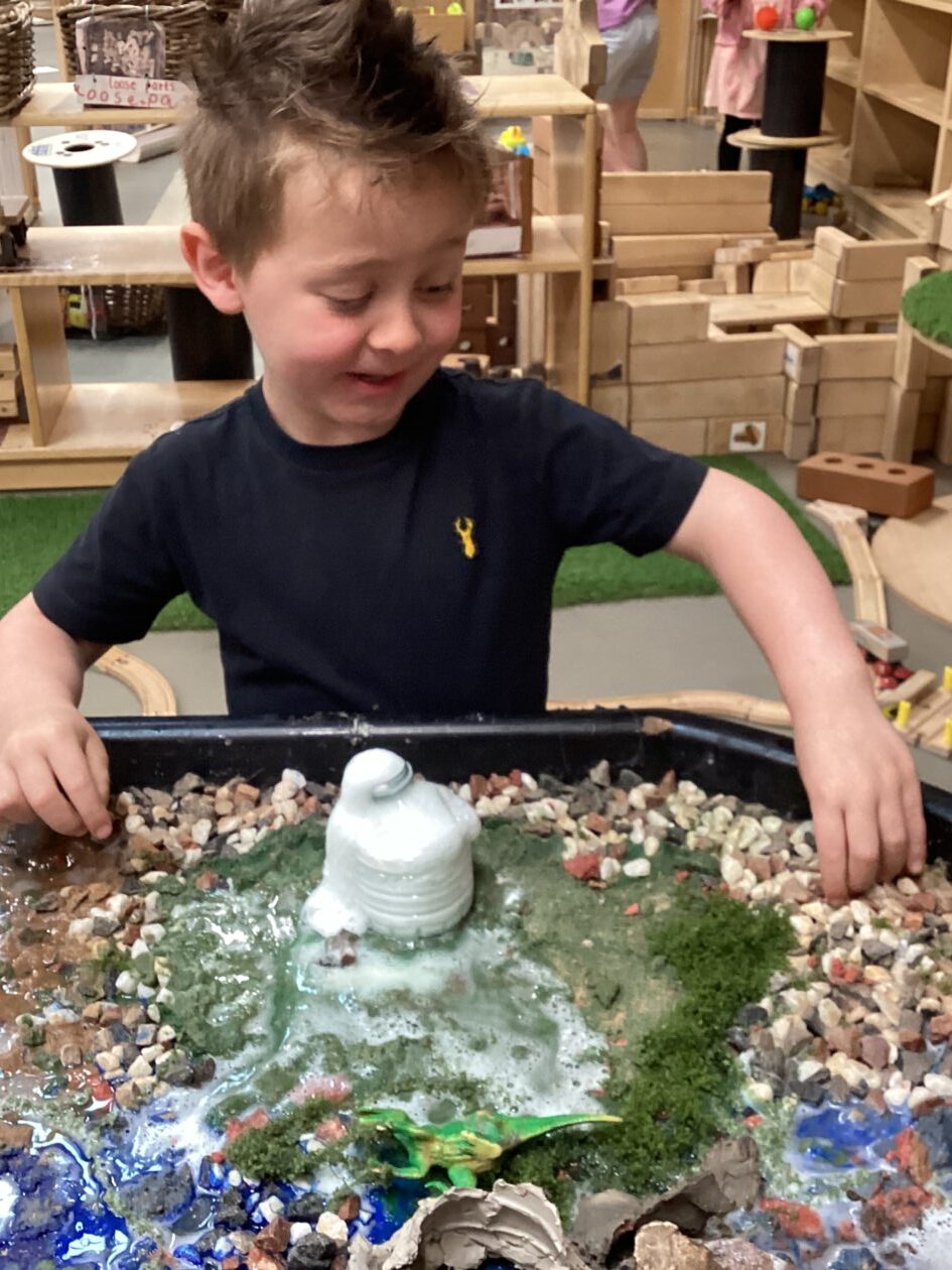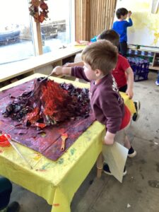 This week many children have been talking and building different types of transport such as trains, F1 cars and camper vans. This has led to lots of mark making, creating maps and signs for the vehicles. We have also engaged imaginatively with the volcano that we made, creating lots of narrative about lava monsters and developing new vocabulary such as ‘extinct’. We are beginning to explore a sense of belonging, discussing houses, cities and structures within our community.