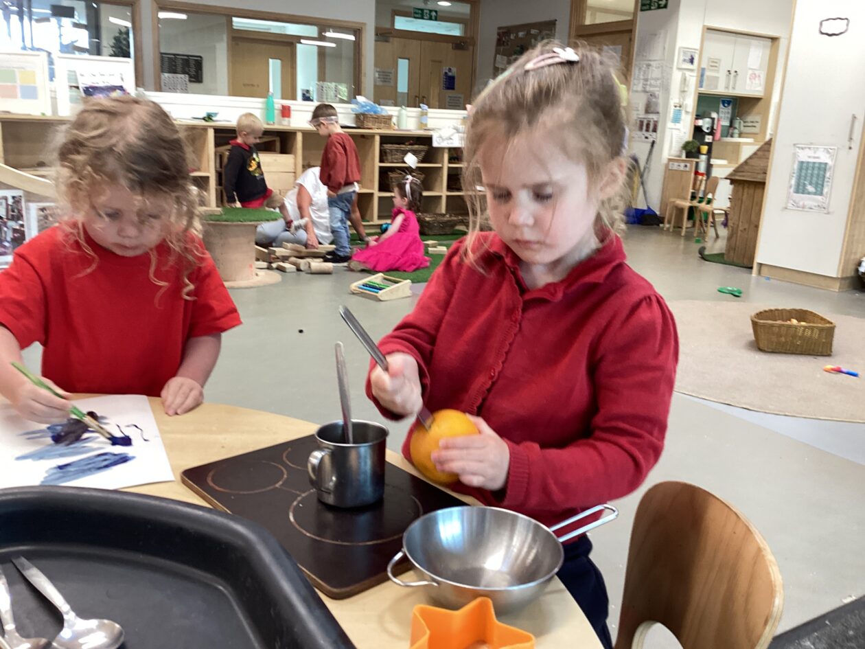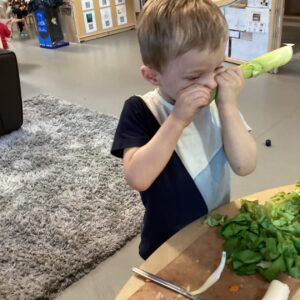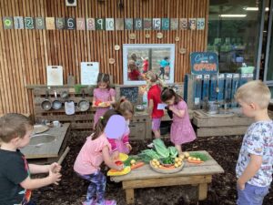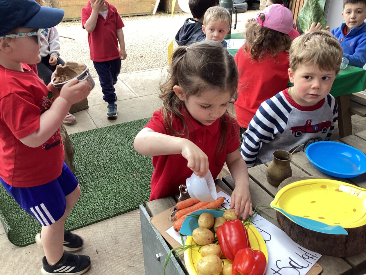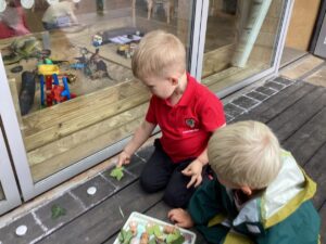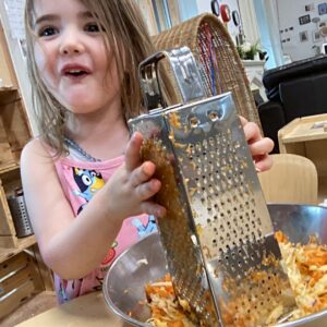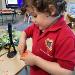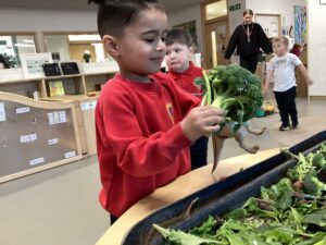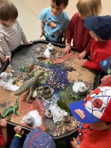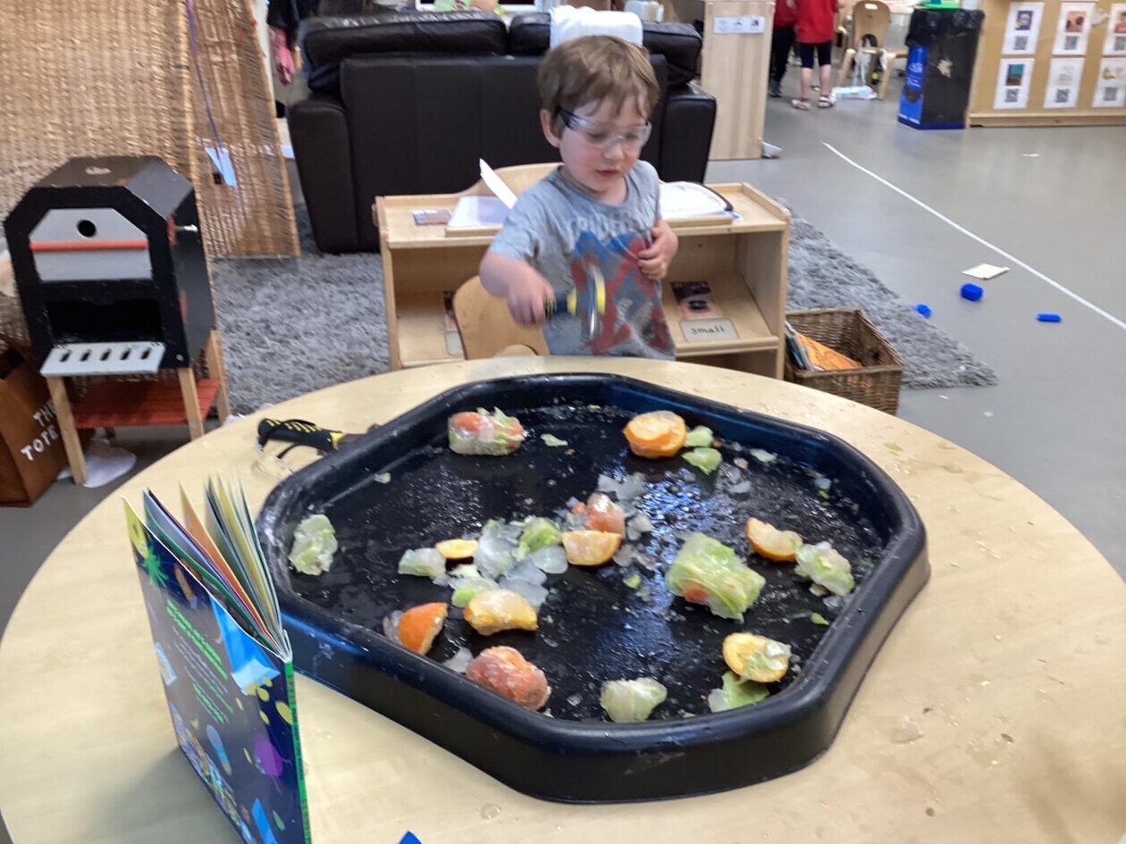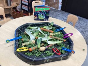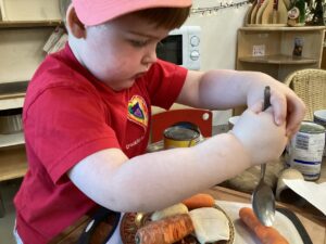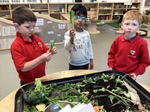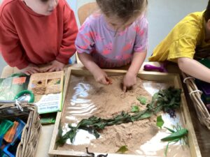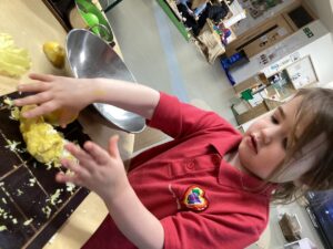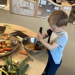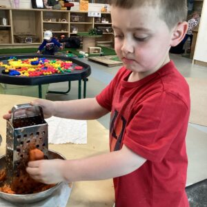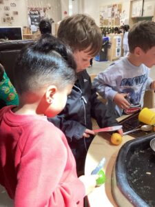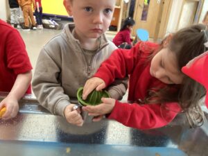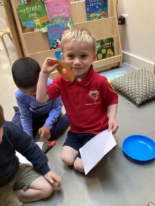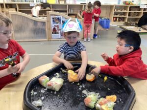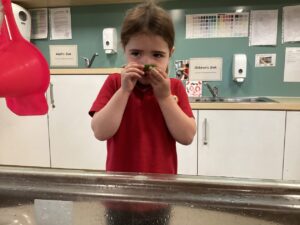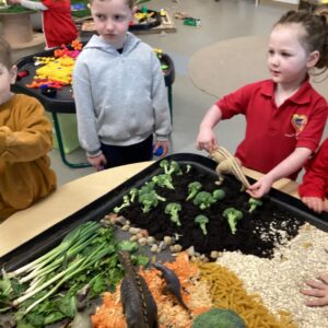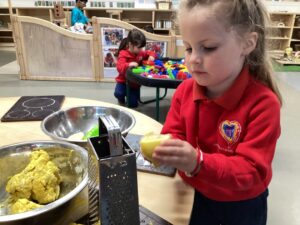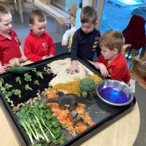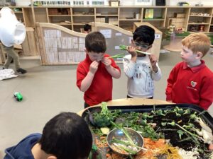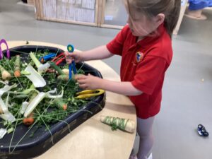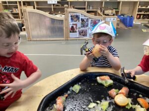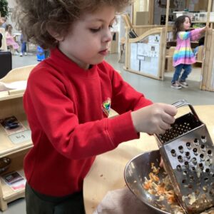 This week the children have been exploring their senses, we have been focusing on smelling and touching different fruits and vegetables. We have been using our fine and gross motor skills to grate carrots and turnips in preparation for creating our dinosaur habitats!