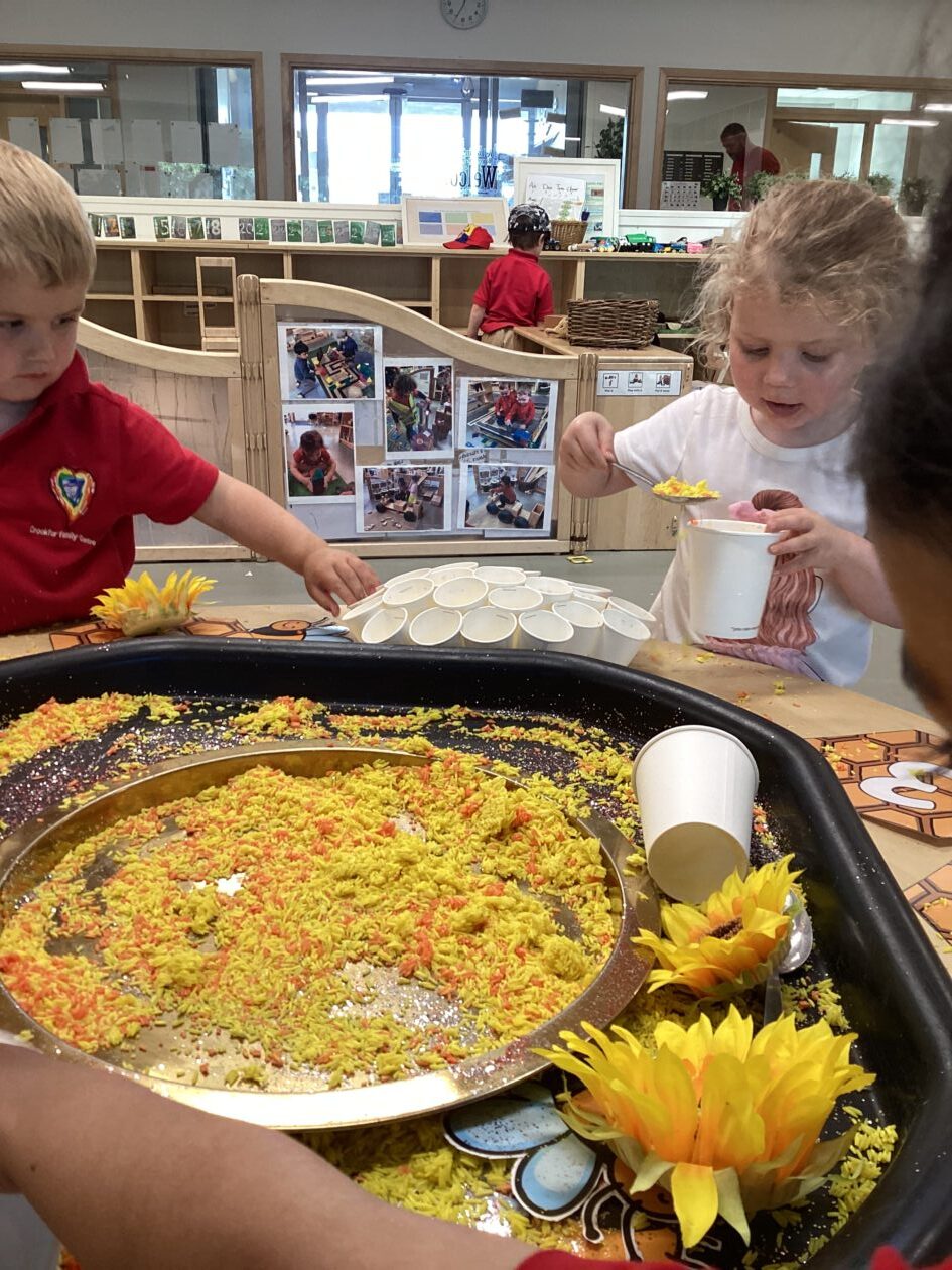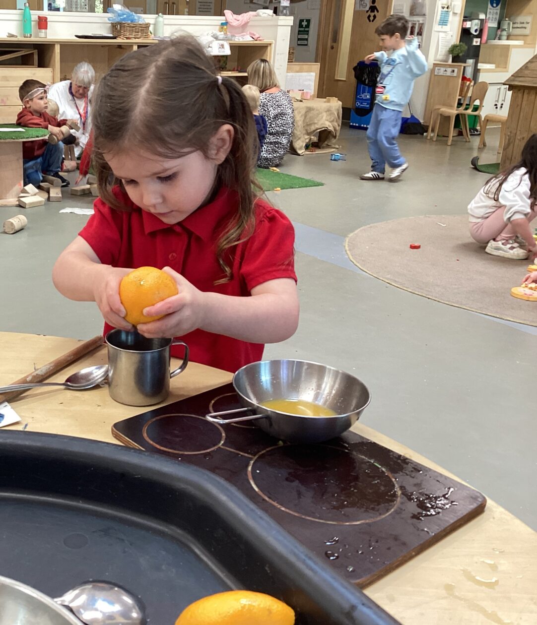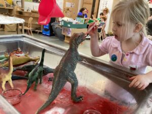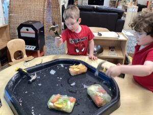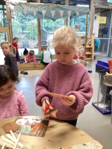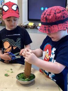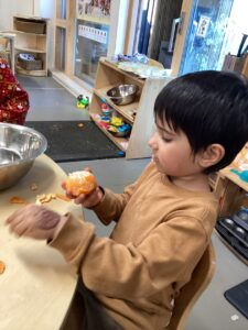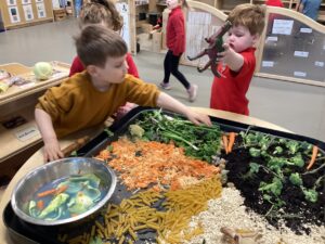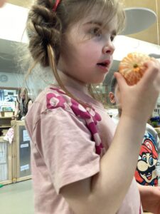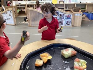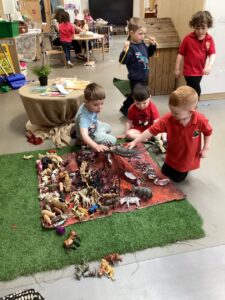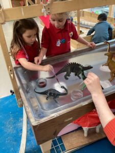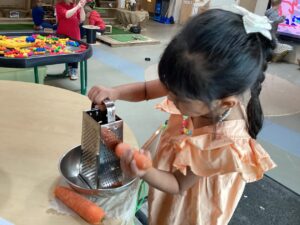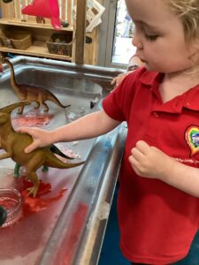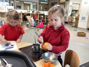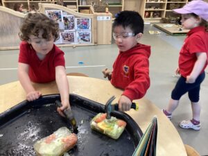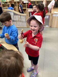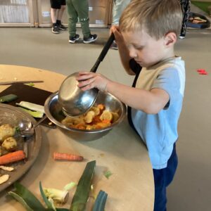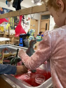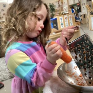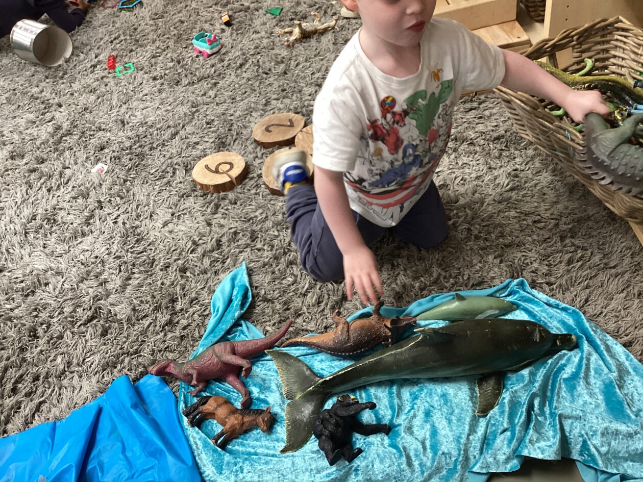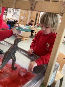 This week the children have been exploring their senses, we have been focusing on smelling and touching different fruits and vegetables. We have been using our fine and gross motor skills to grate carrots and turnips in preparation for creating our dinosaur habitats!