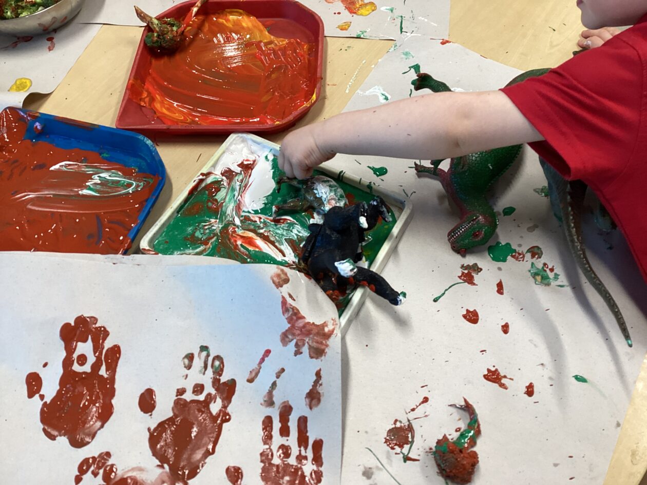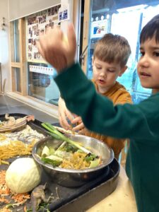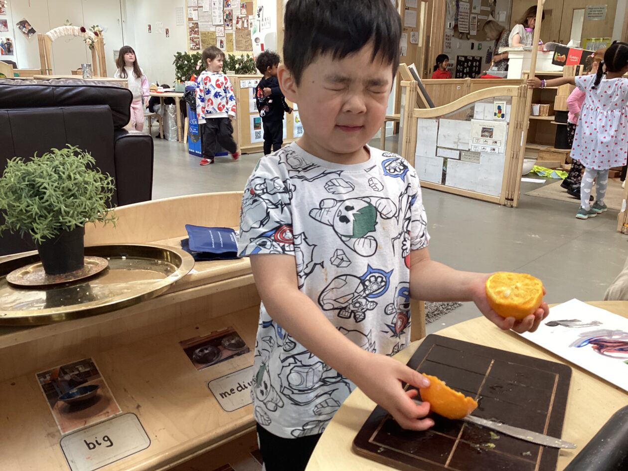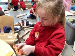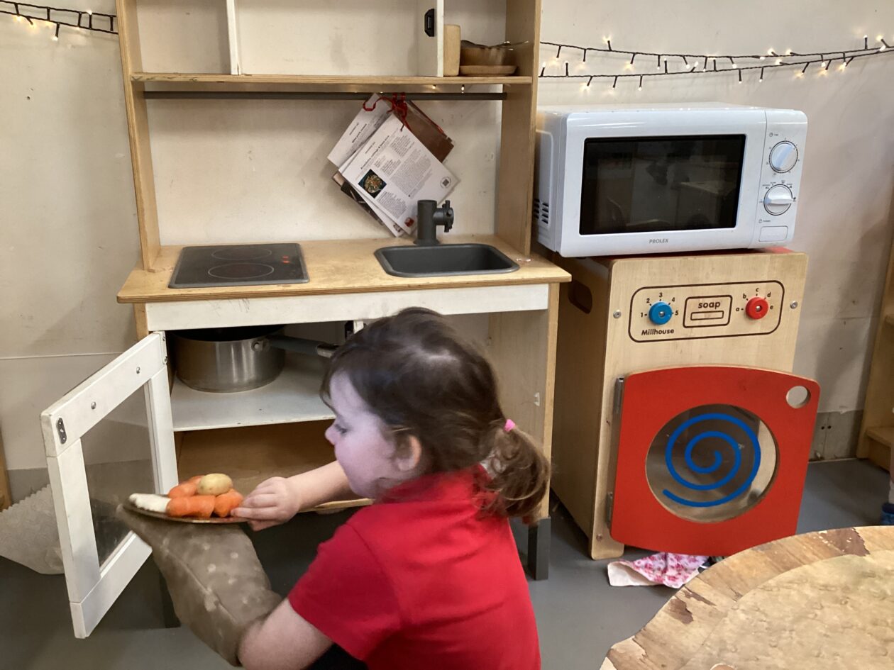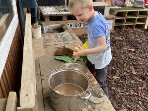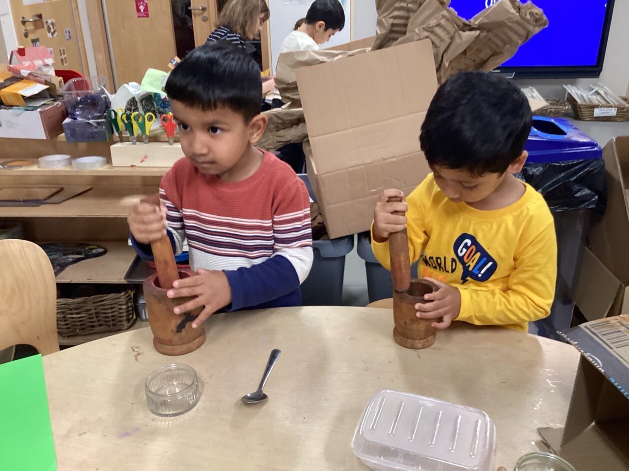 This week the children have been exploring their senses, we have been focusing on smelling and touching different fruits and vegetables. We have been using our fine and gross motor skills to grate carrots and turnips in preparation for creating our dinosaur habitats!