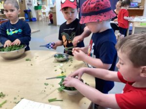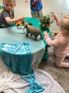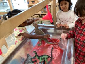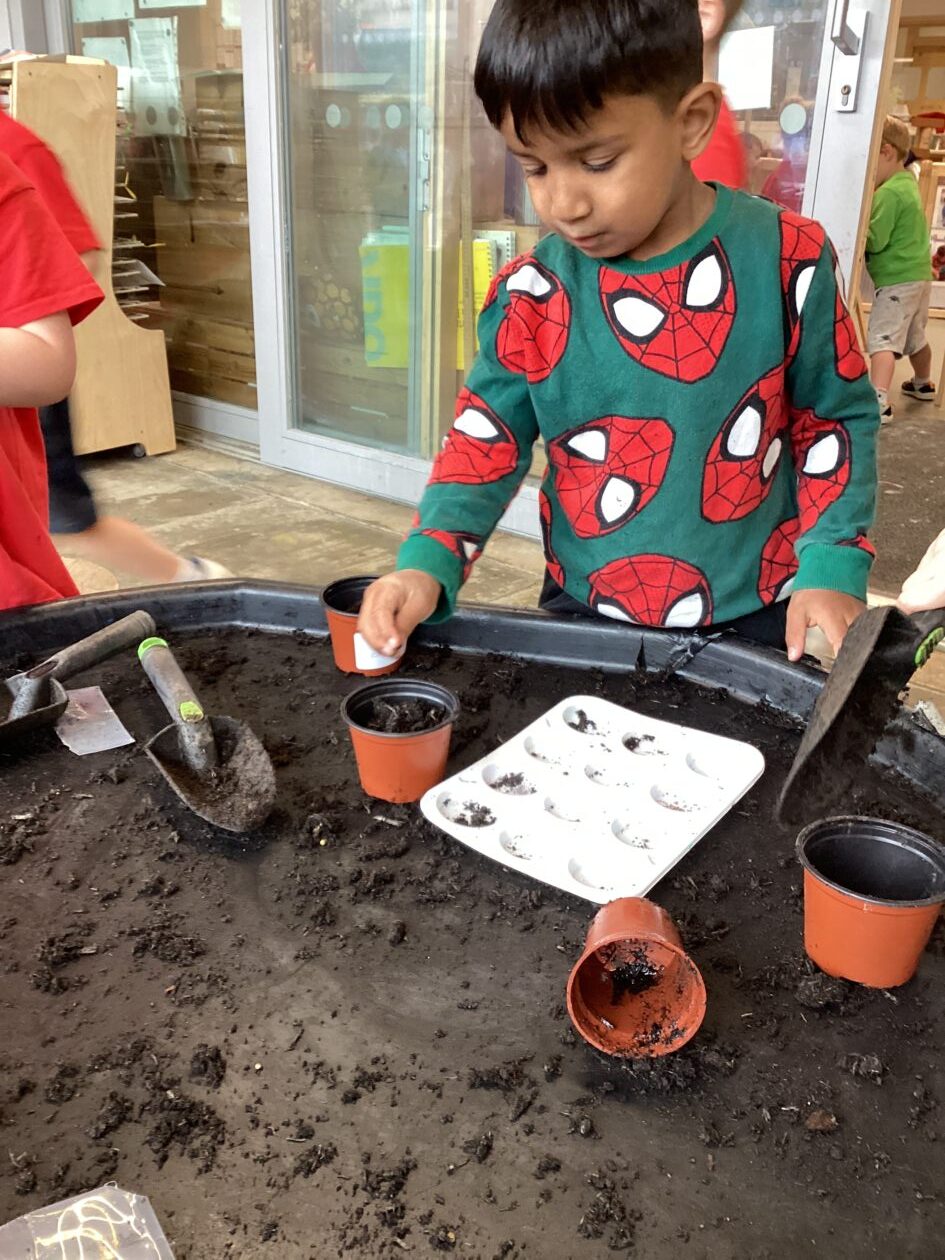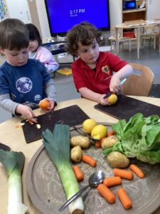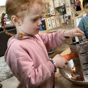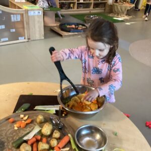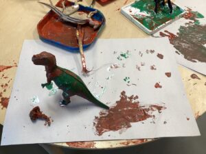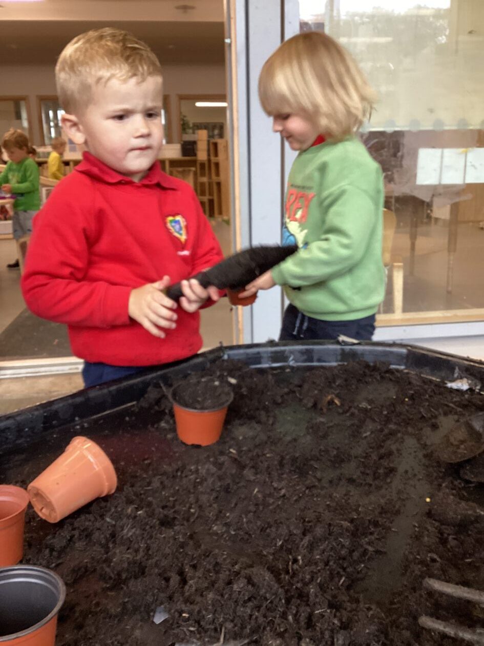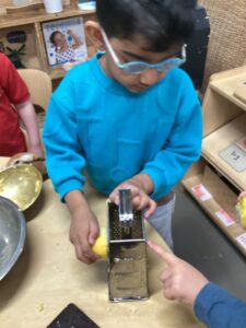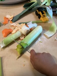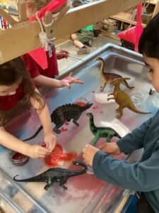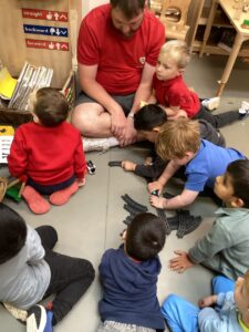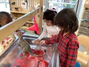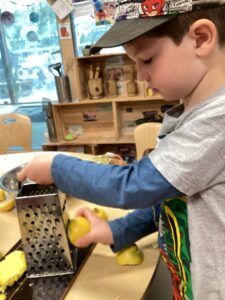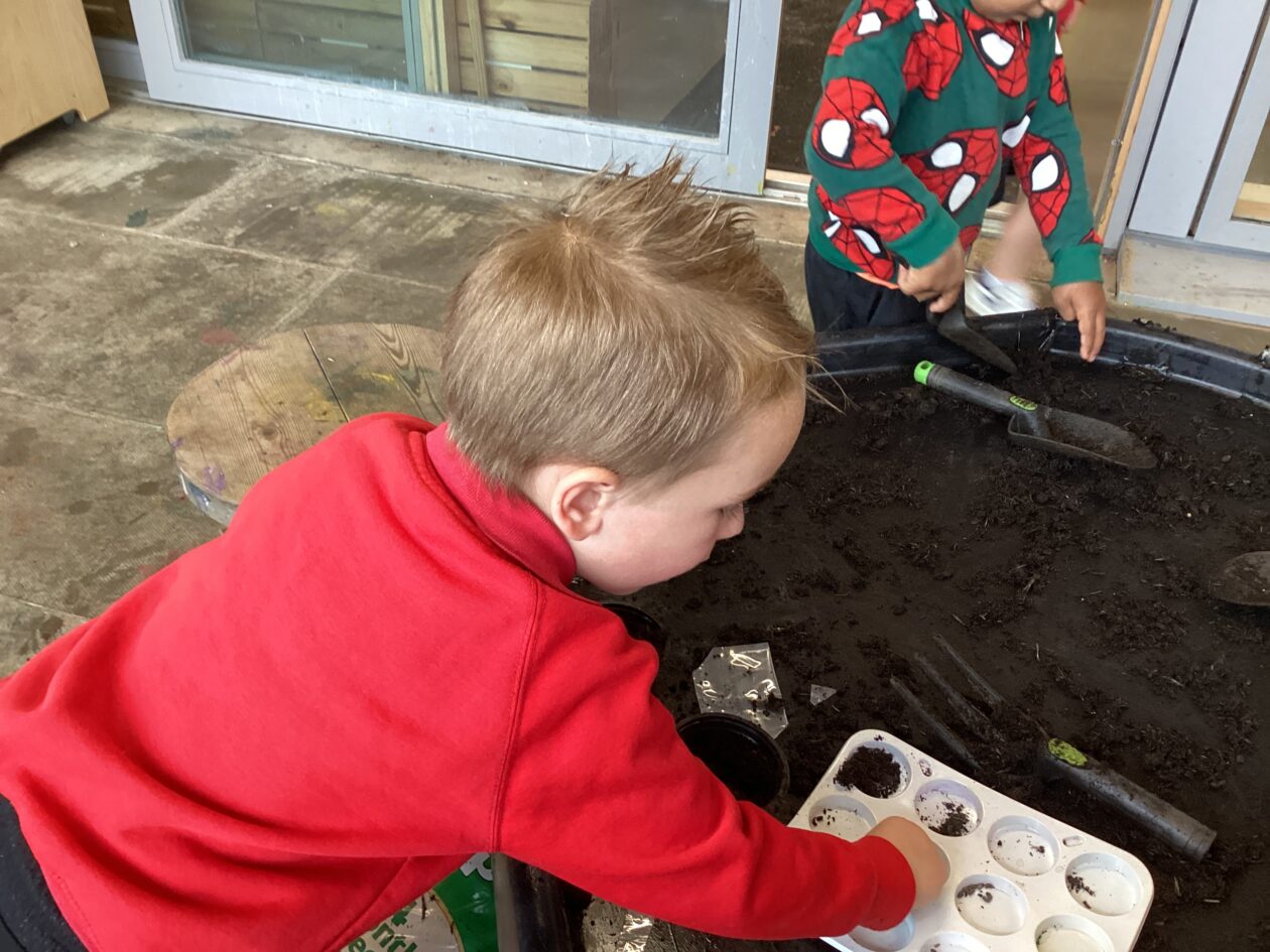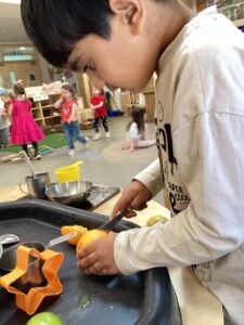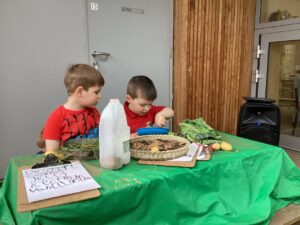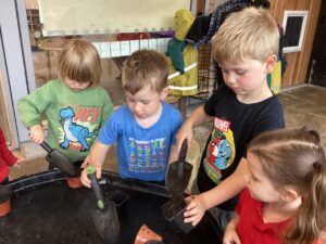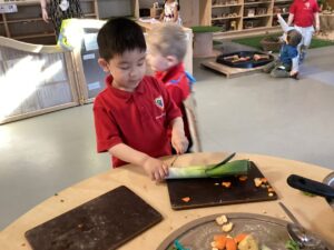 This week the children have been exploring their senses, we have been focusing on smelling and touching different fruits and vegetables. We have been using our fine and gross motor skills to grate carrots and turnips in preparation for creating our dinosaur habitats!