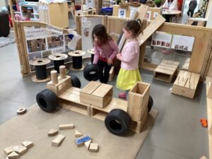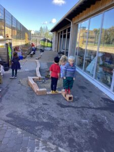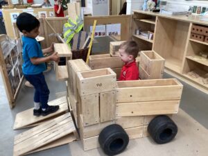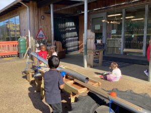 Some children have also been constructing other types of transport like tractors, rockets, cars and trains. They have been using different sizes and shapes of blocks and using various other materials such as tyres and cans and boxes to their models.