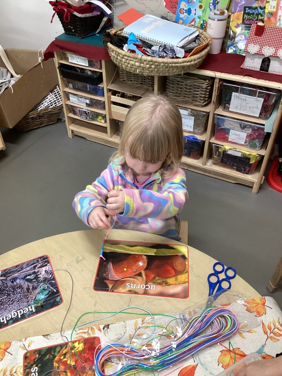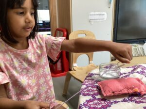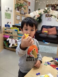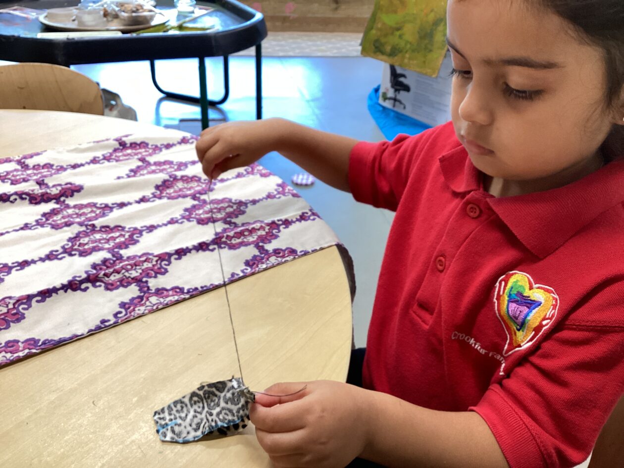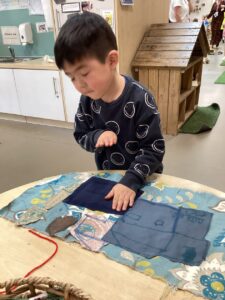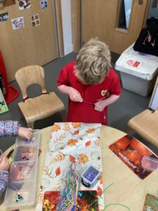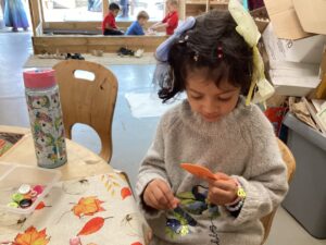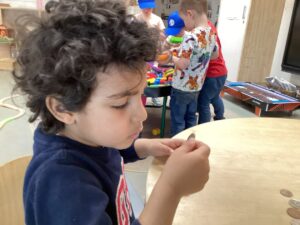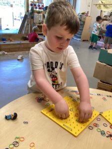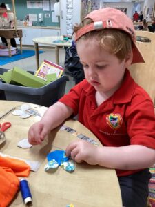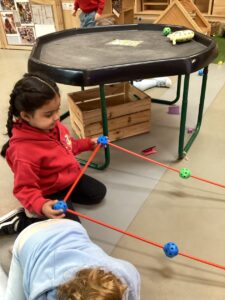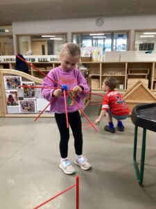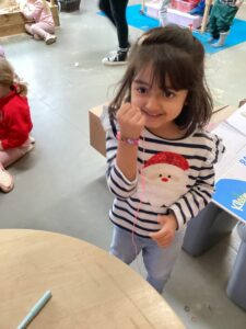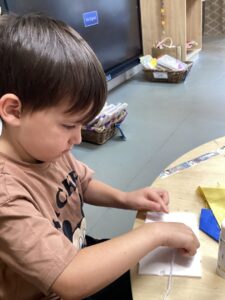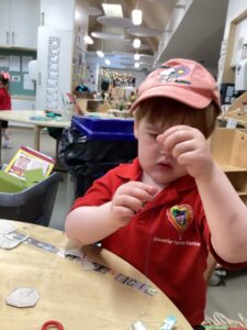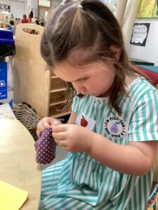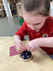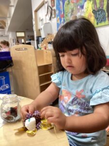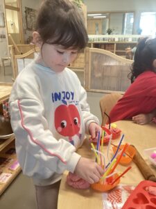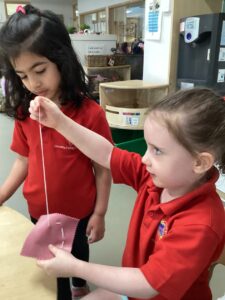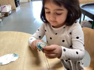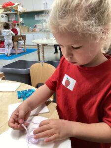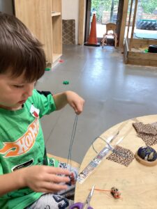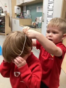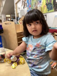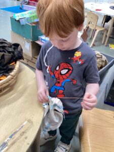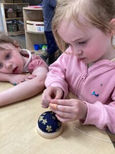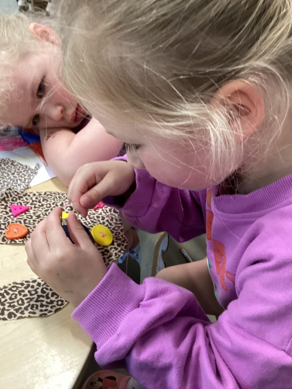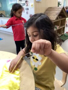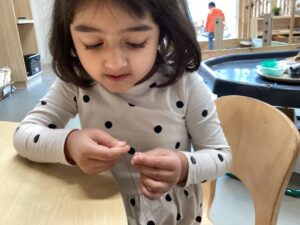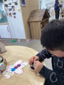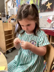 This week in the sewing area the children wanted to make their own bracelets for themselves and their friends. They concentrated and persevered as they worked to thread the beads onto the string. We are also beginning to learn to tie knots as we secured our bracelets on to our wrists.