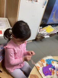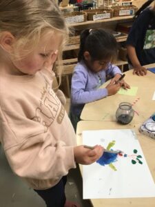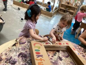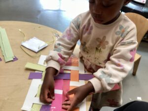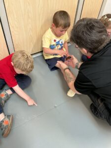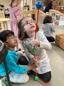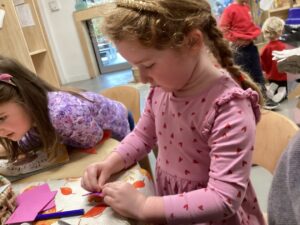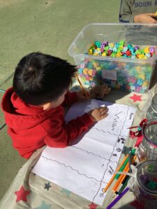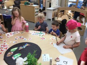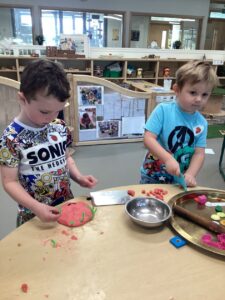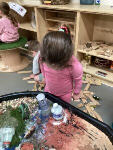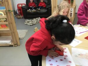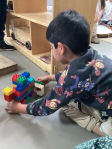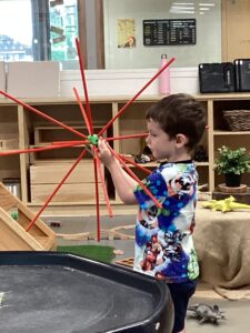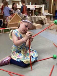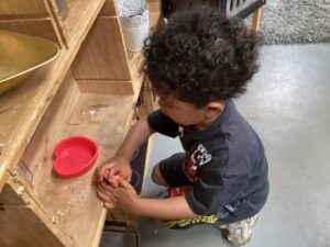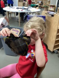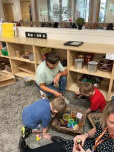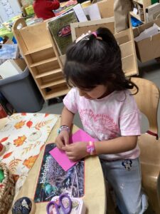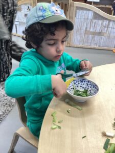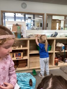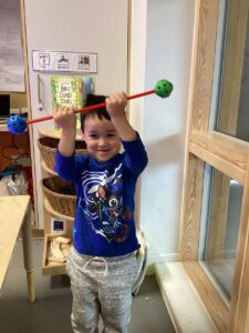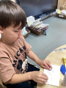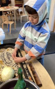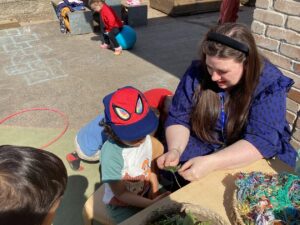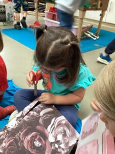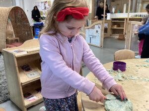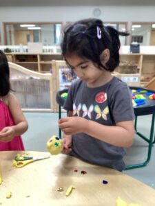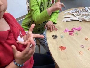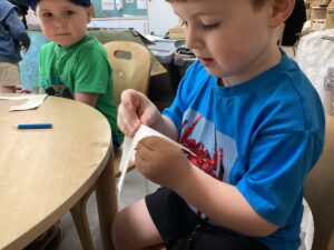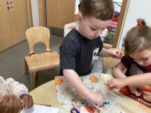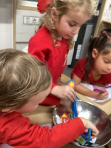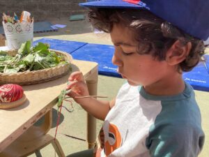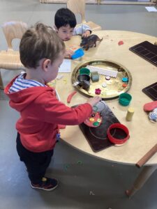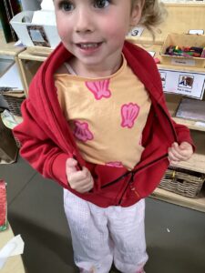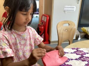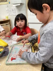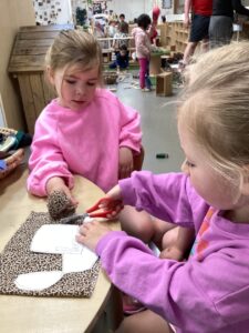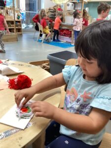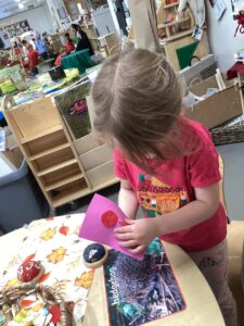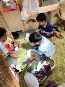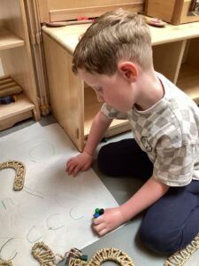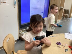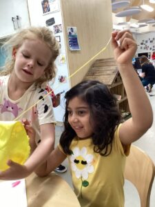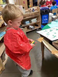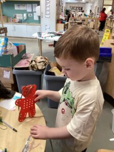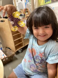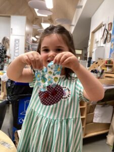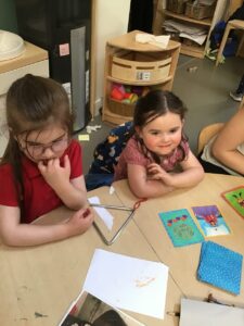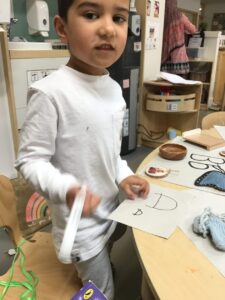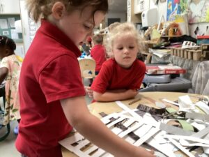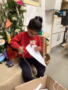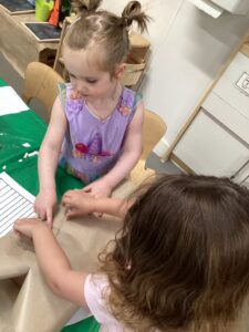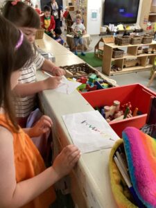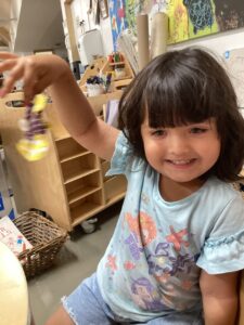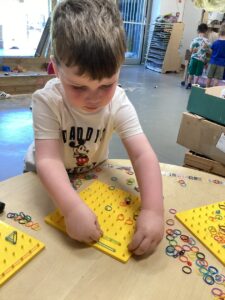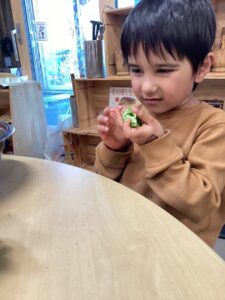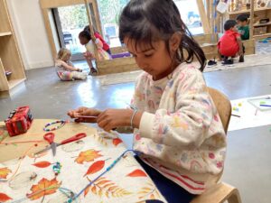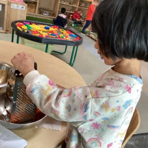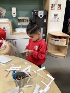This week in the sewing area the children wanted to make their own bracelets for themselves and their friends. They concentrated and persevered as they worked to thread the beads onto the string. We are also beginning to learn to tie knots as we secured our bracelets on to our wrists.