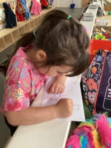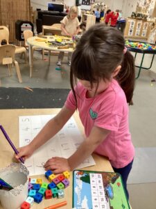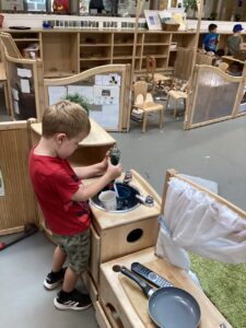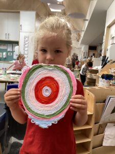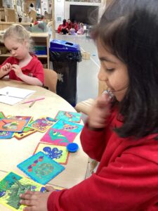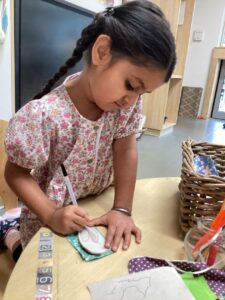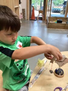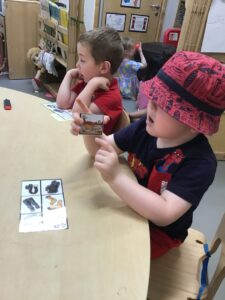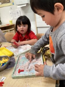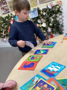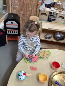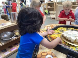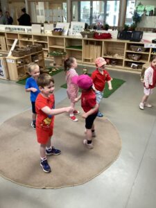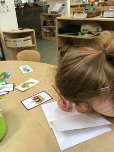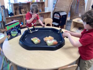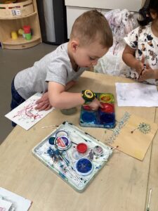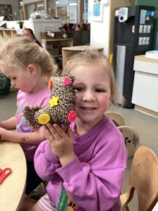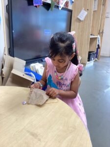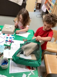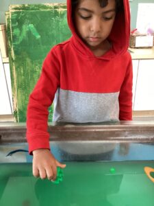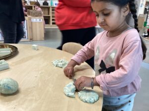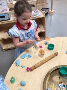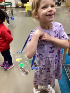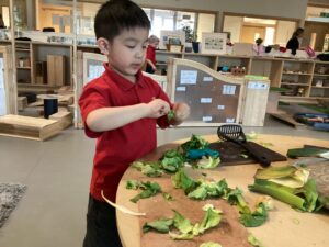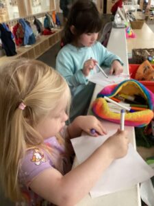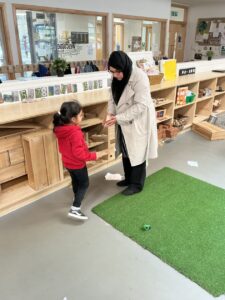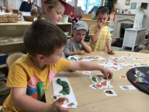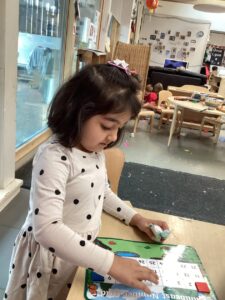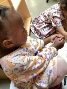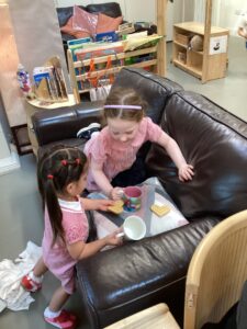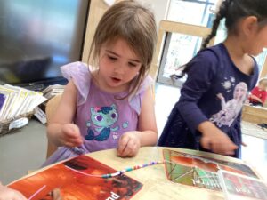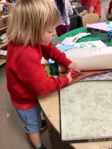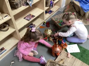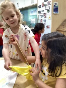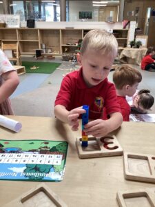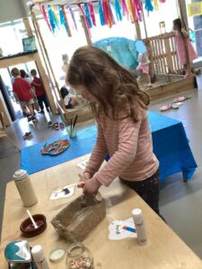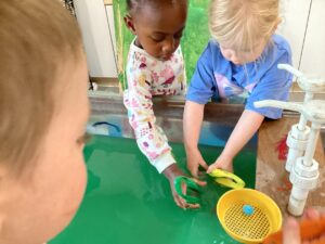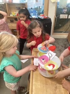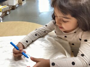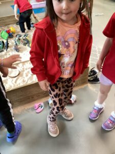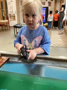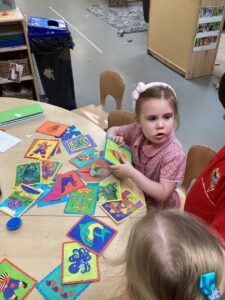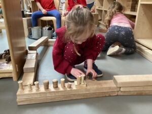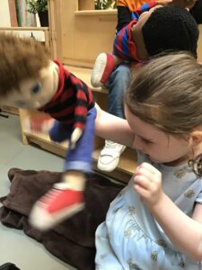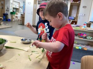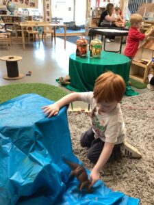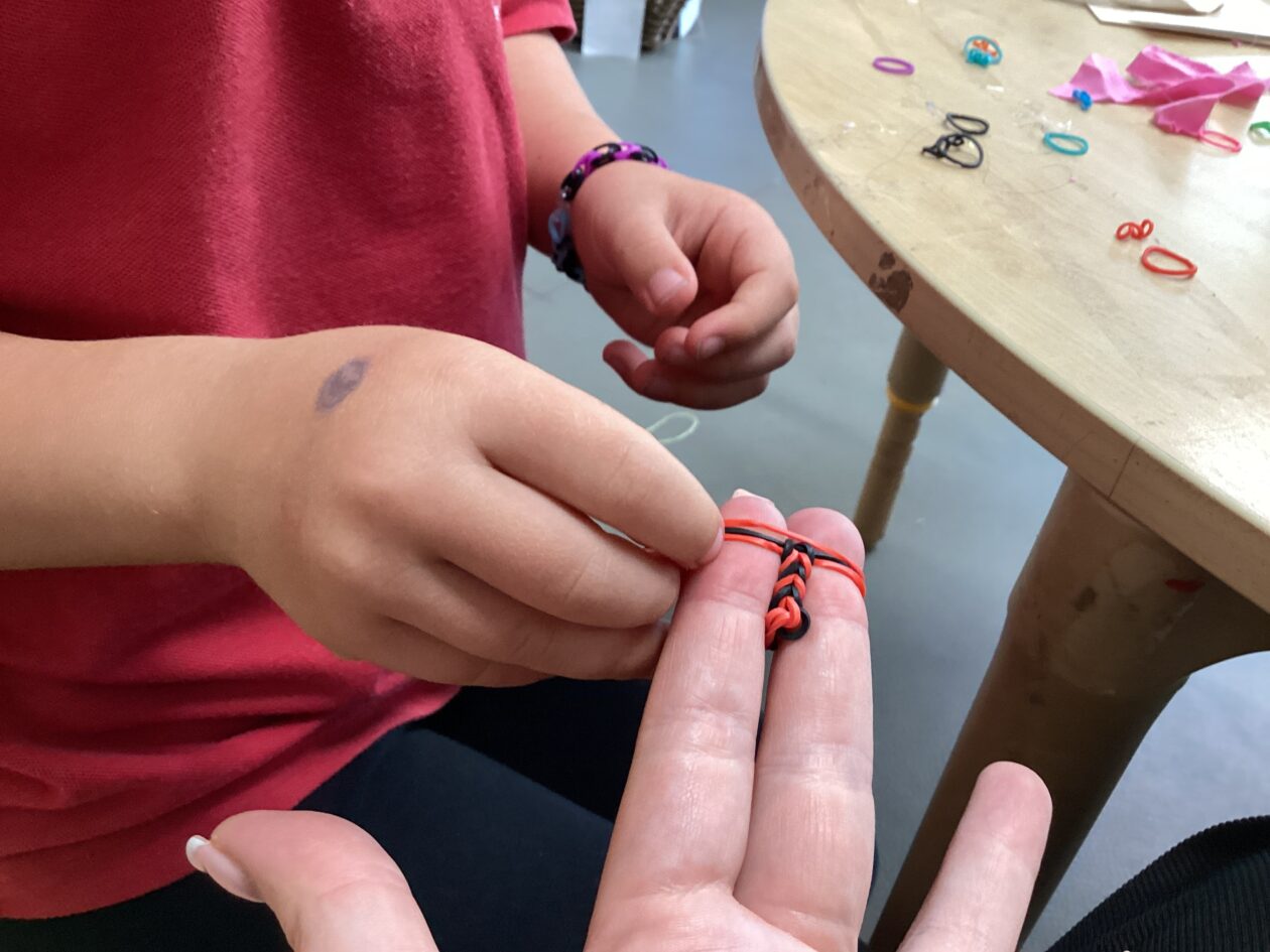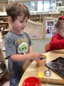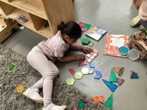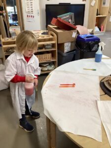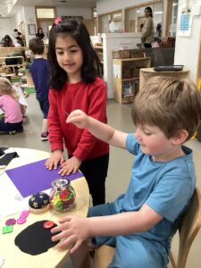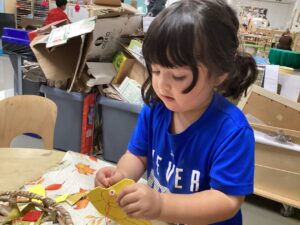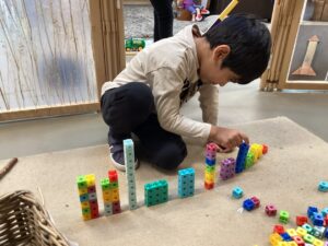 This week in the sewing area the children wanted to make their own bracelets for themselves and their friends. They concentrated and persevered as they worked to thread the beads onto the string. We are also beginning to learn to tie knots as we secured our bracelets on to our wrists.