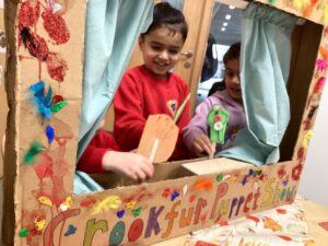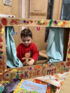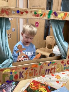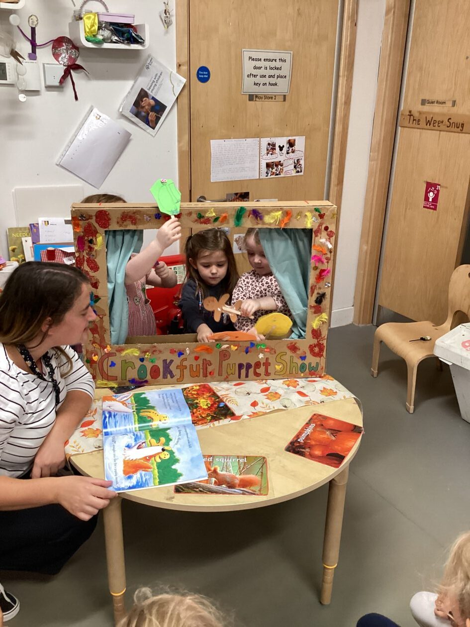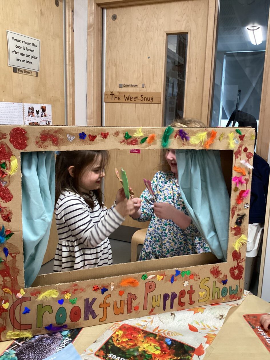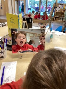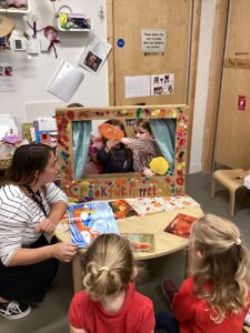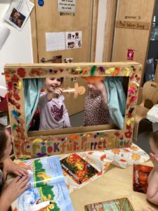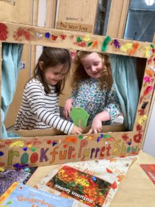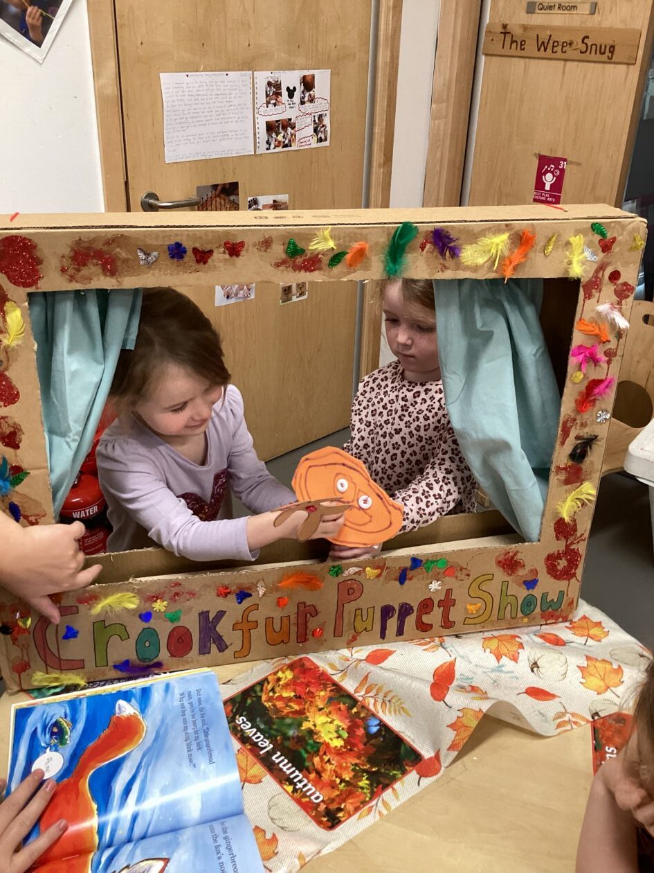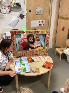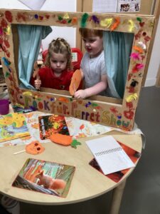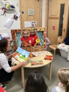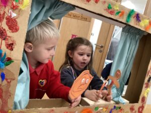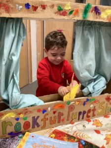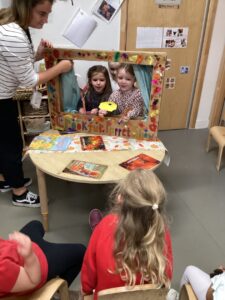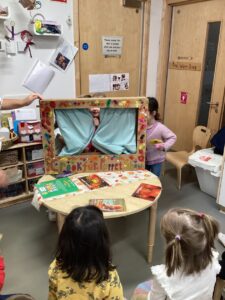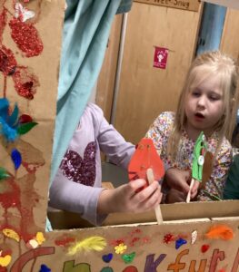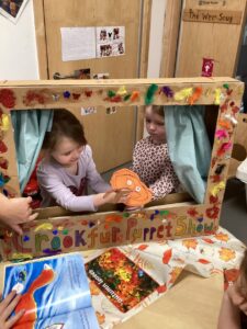 The children decorated our homemade theatre using pens, glitter and sequins and then it was time to start our show! The children had great fun acting out the story and were able to recall the events from the book. They took on the roles of different characters and used different tones when talking as the characters. Some children also made up their own stories and acted these out too!