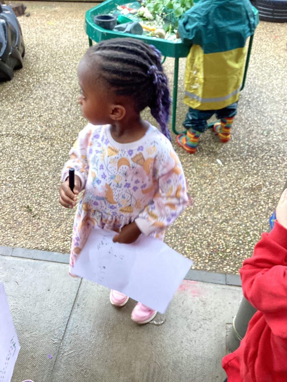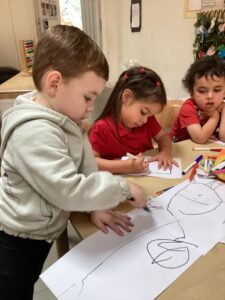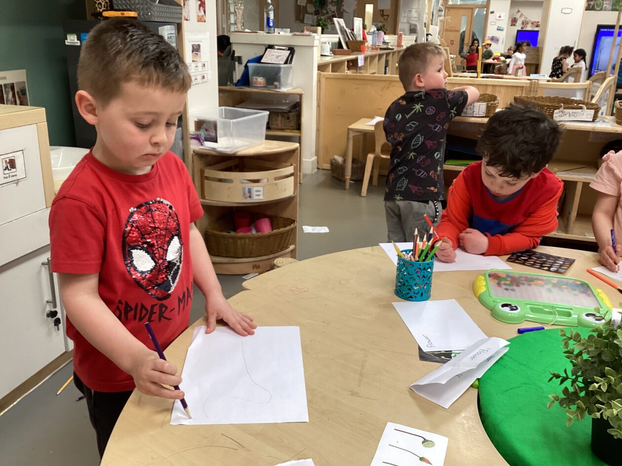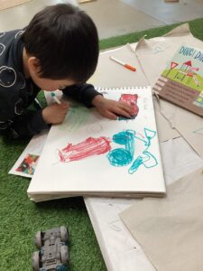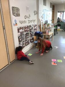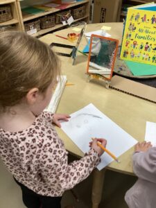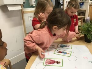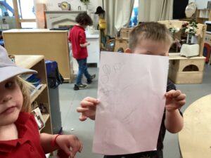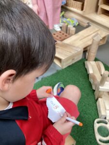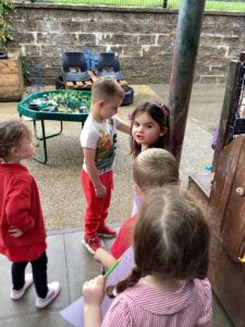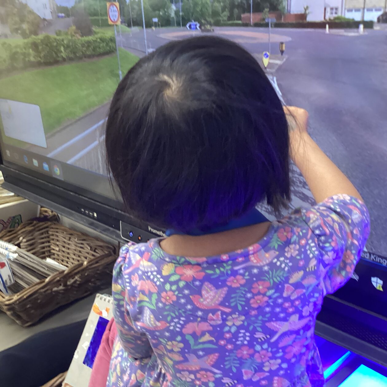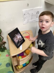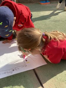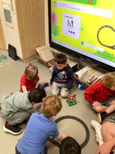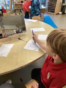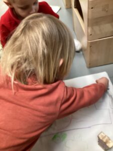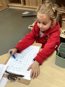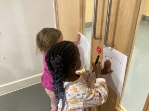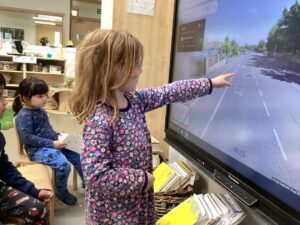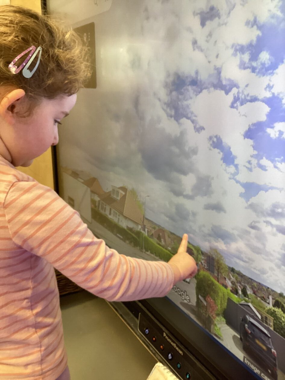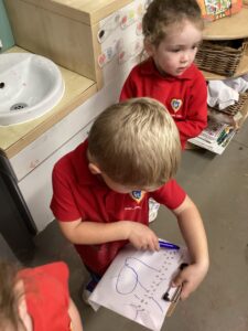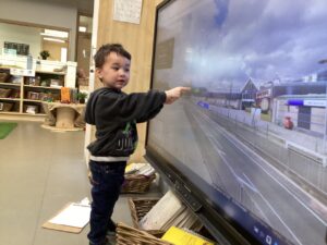 In the discovery area the children have been working on the whiteboard to direct us to places of interest to them  in the local area. The children’ s starting off point is the Family Centre from where they exit through the car park and using various forms of directional language have directed us around to the surrounding area such as, “ go left,” “turn this way.” The children have also spoken about landmarks they see travelling to nursery and when visiting their relatives.