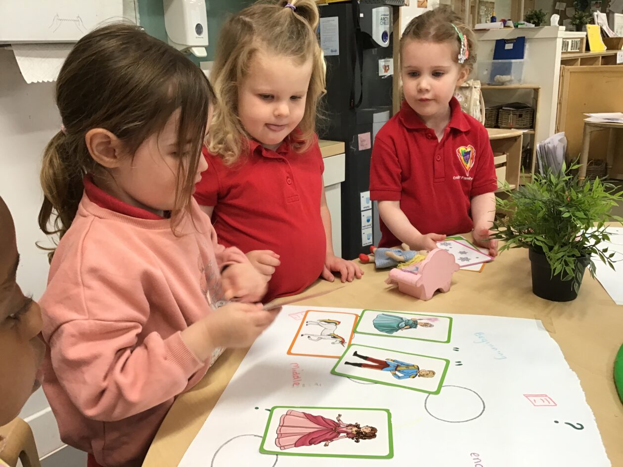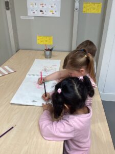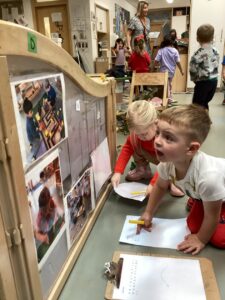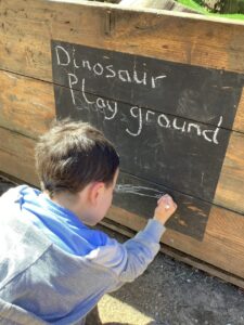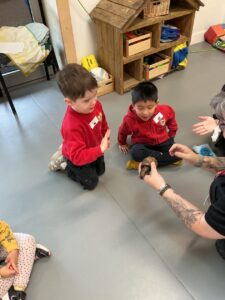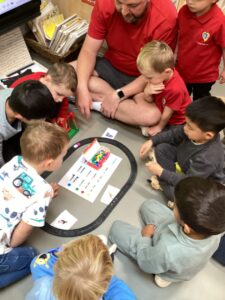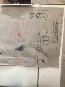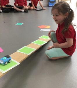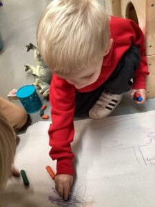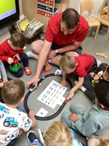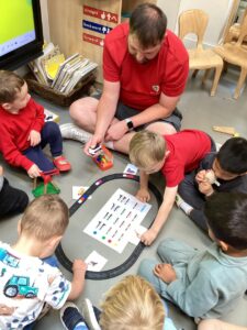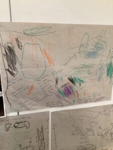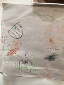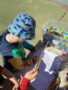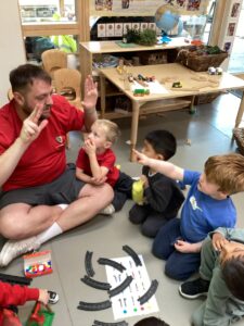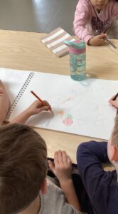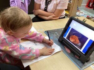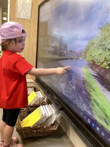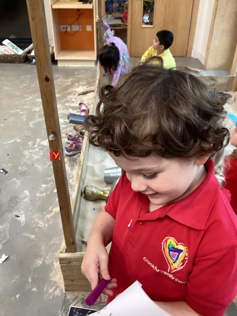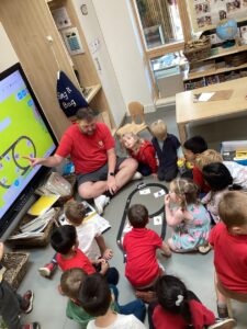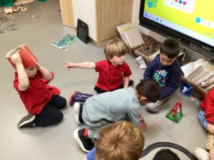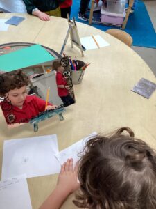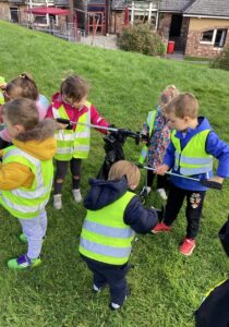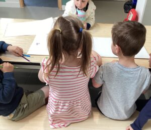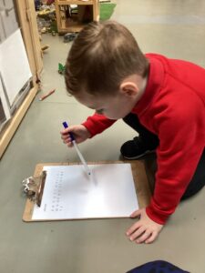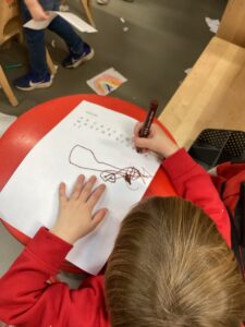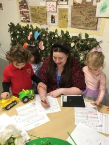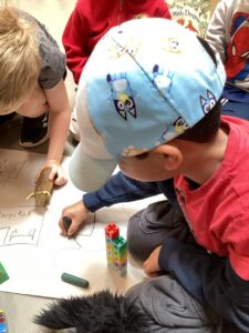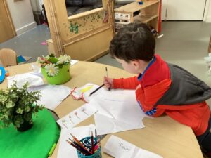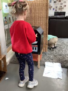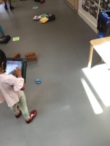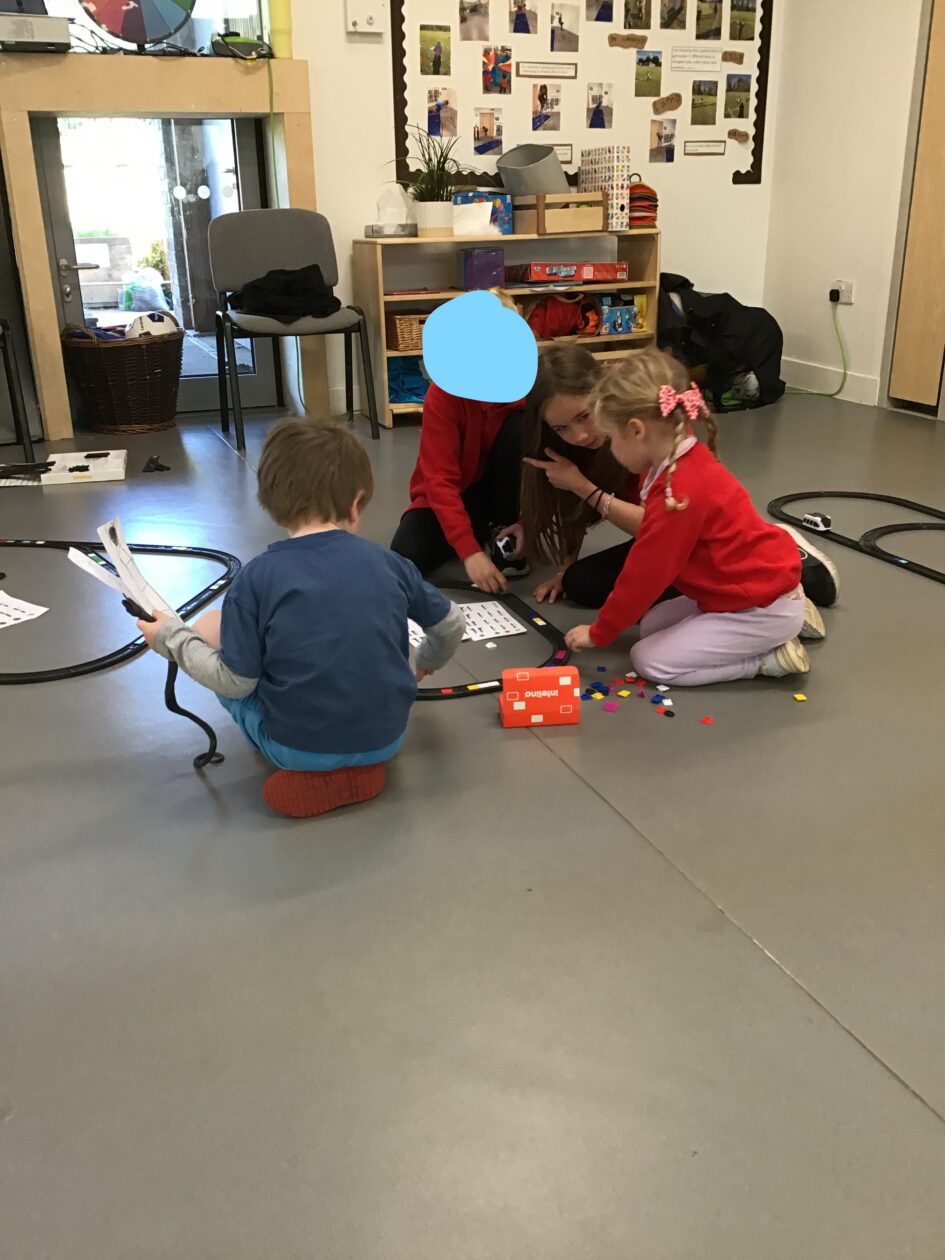 In the discovery area the children have been working on the whiteboard to direct us to places of interest to them  in the local area. The children’ s starting off point is the Family Centre from where they exit through the car park and using various forms of directional language have directed us around to the surrounding area such as, “ go left,” “turn this way.” The children have also spoken about landmarks they see travelling to nursery and when visiting their relatives.